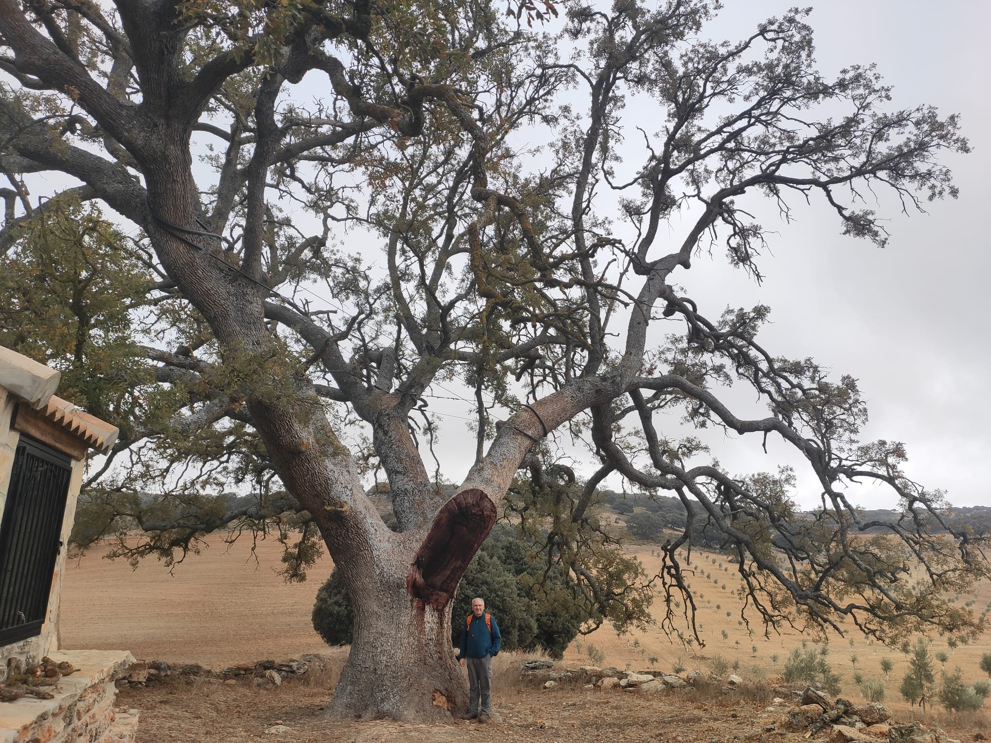 Pasaremos delante del cortijo de la Rozilla, con una puerta de forja con herraduras y objetos metálicos. El carril se ensancha un poquito y nos llevará a un encinar con árboles de mucho mayor porte que el anterior. Un desvío hacia la izquierda y ya veremos el quejigo Júrtiga en nuestro horizonte. Antes de llegar a él pasaremos por las ruinas del cortijo de Salvador León y en unos 500 m. estaremos en la explanada del quejigo y una capillita dedicada a la la Inmaculada.