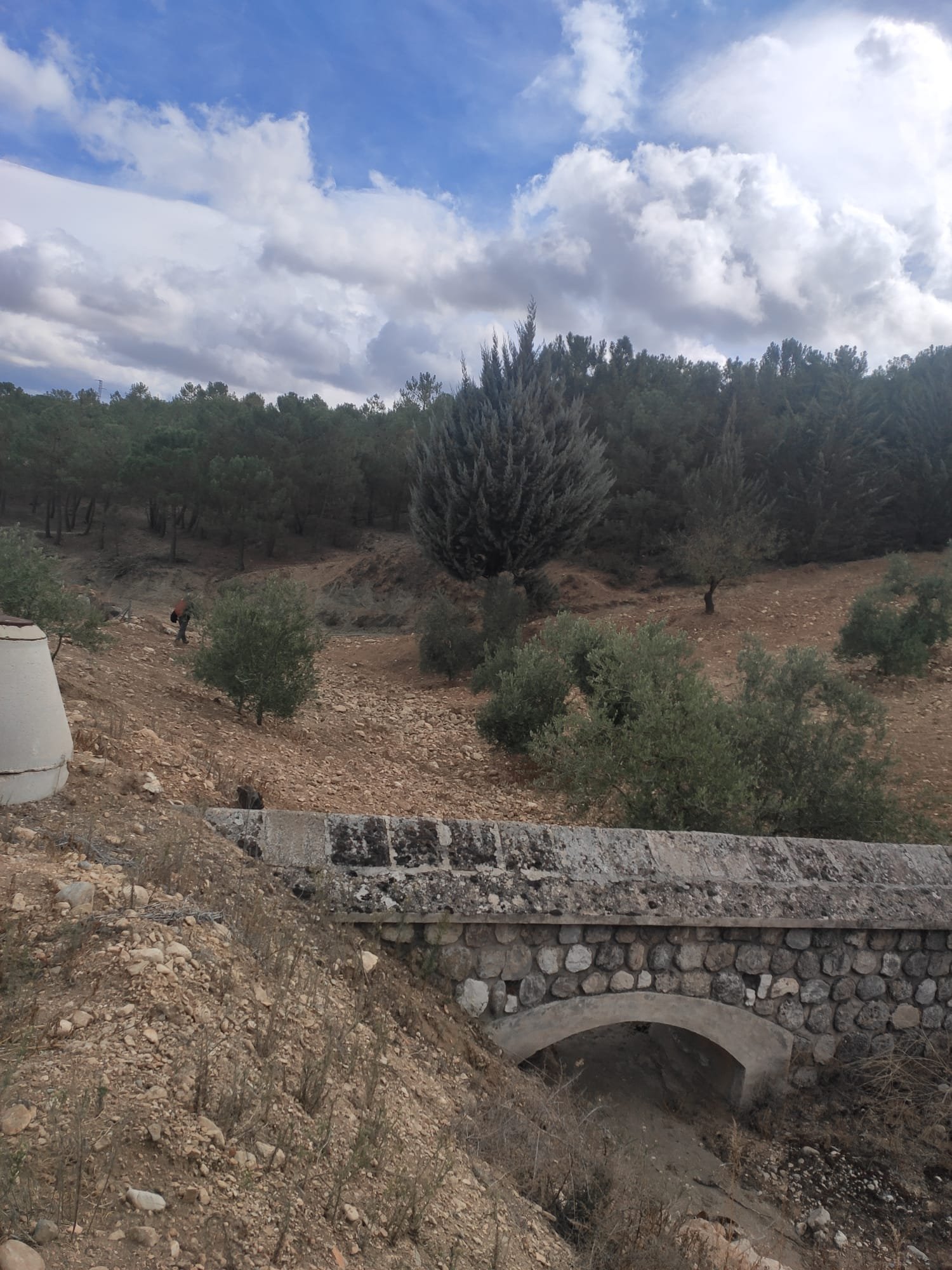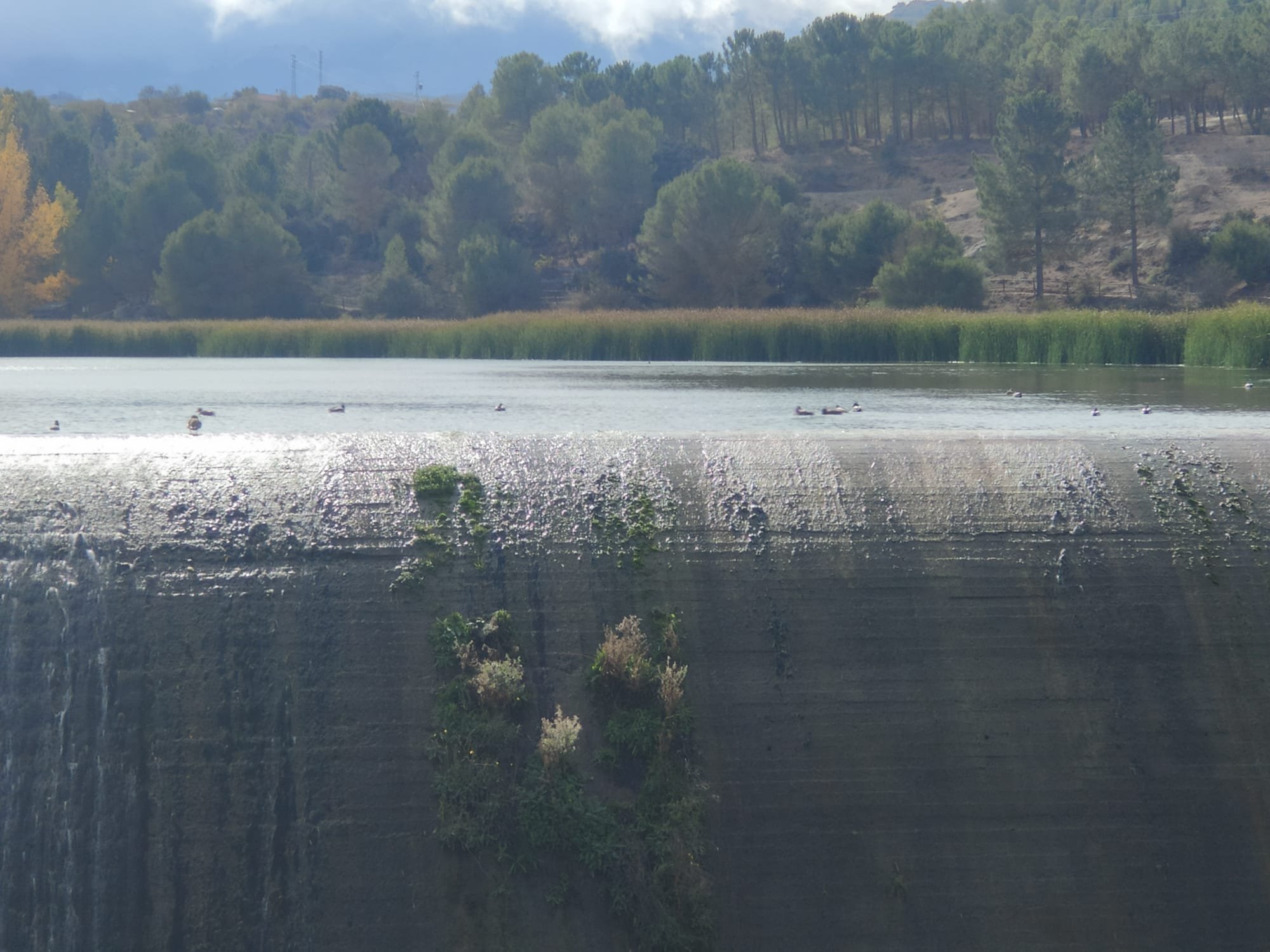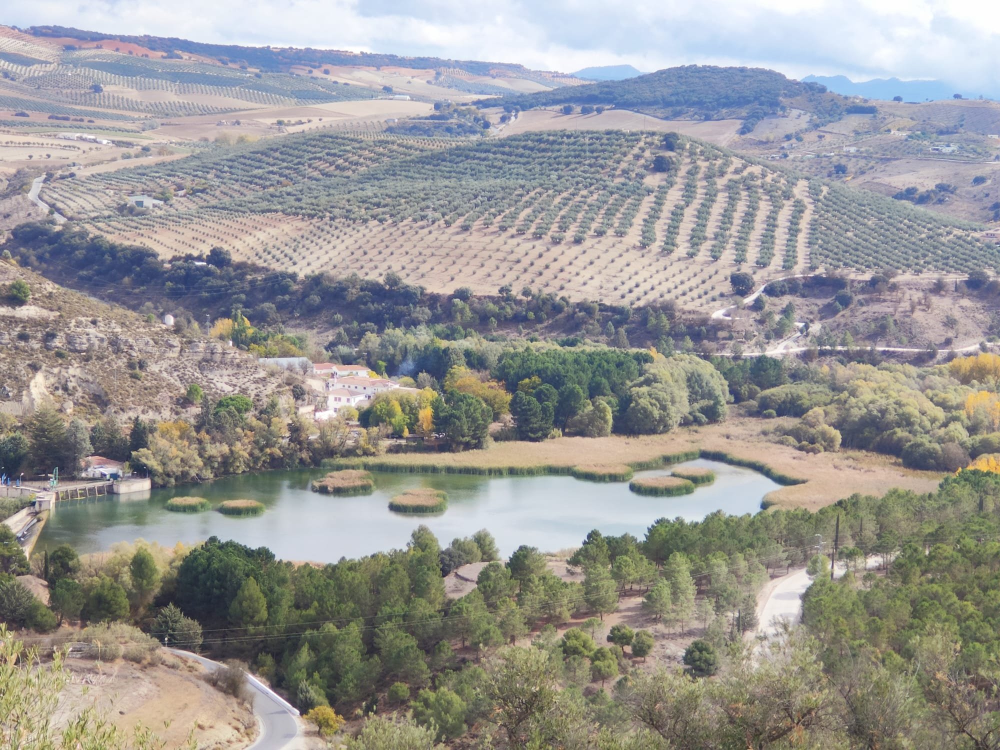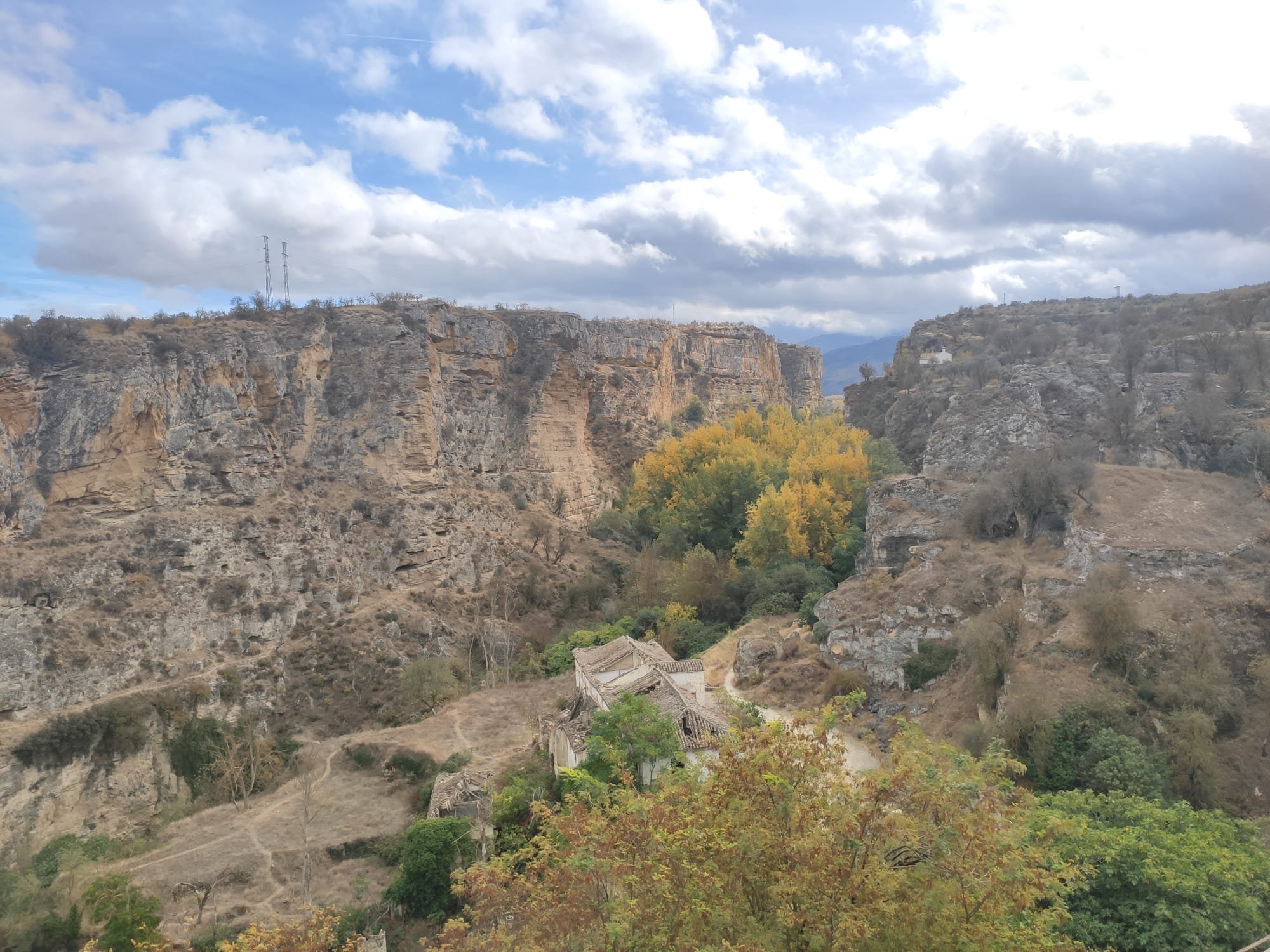 Por la parte de atrás de la quesería encontraremos un carril (muy transitado por las cabras) y pasaremos por una cruz, un cortijo en ruinas, un abrevadero y una fuente con agua fresca que llaman las Pilas de Capillanía. Más adelante nos desviaremos a la derecha y poco después a la izquierda hasta alcanzar de nuevo la carretera A-402. Tras unos 600 m por la carretera y justo antes de una cerrada curva tomaremos un carril que discurre entre unas casitas de recreo en dirección a un pinar. Bajaremos por el pinar hasta llegar a una pantaneta que regula el cauce del río Alhama. Pasada la pantaneta a la izquierda de la carretera sale un camino que discurre junto al río y al monumento natural Tajos de Alhama.