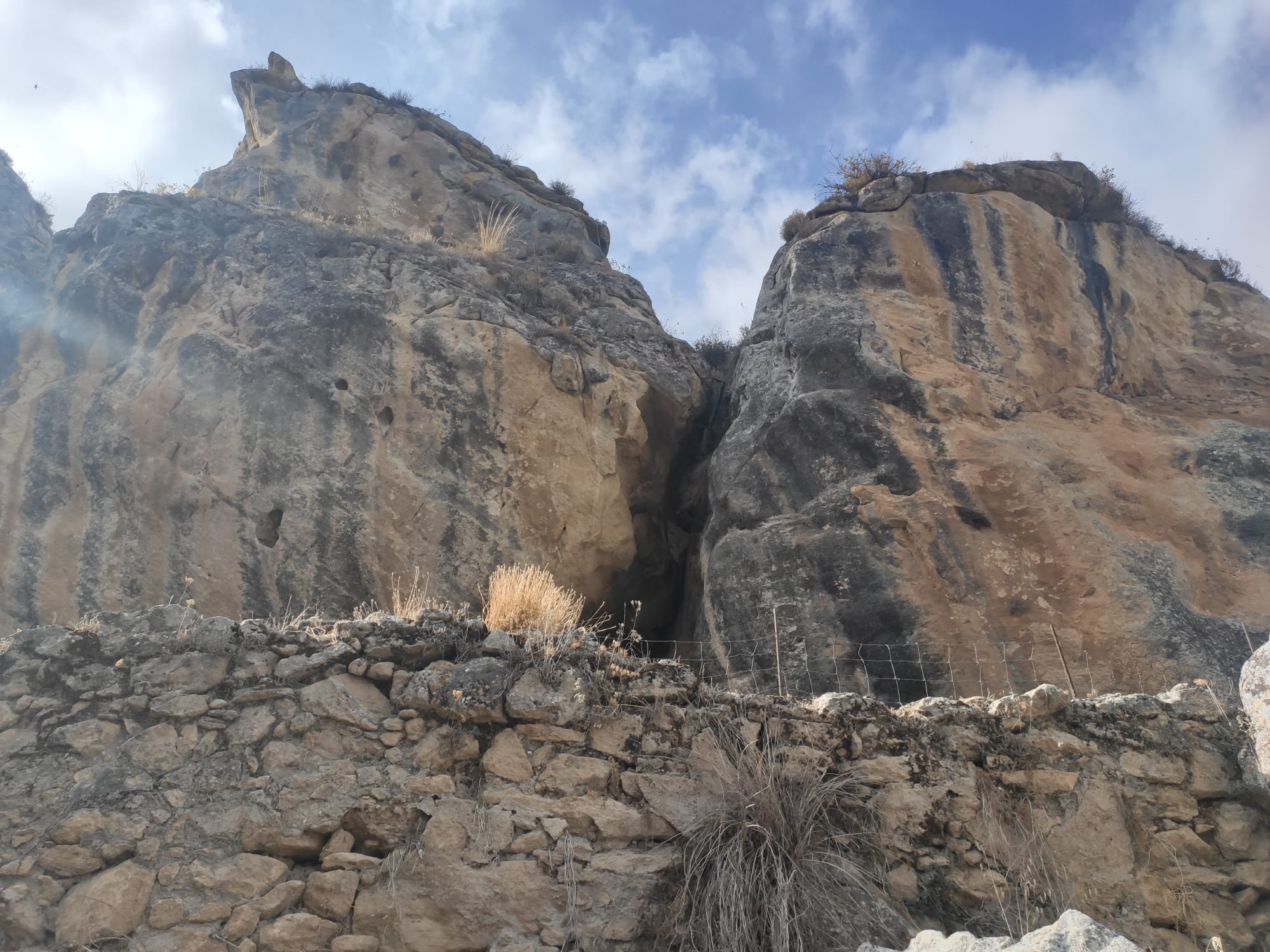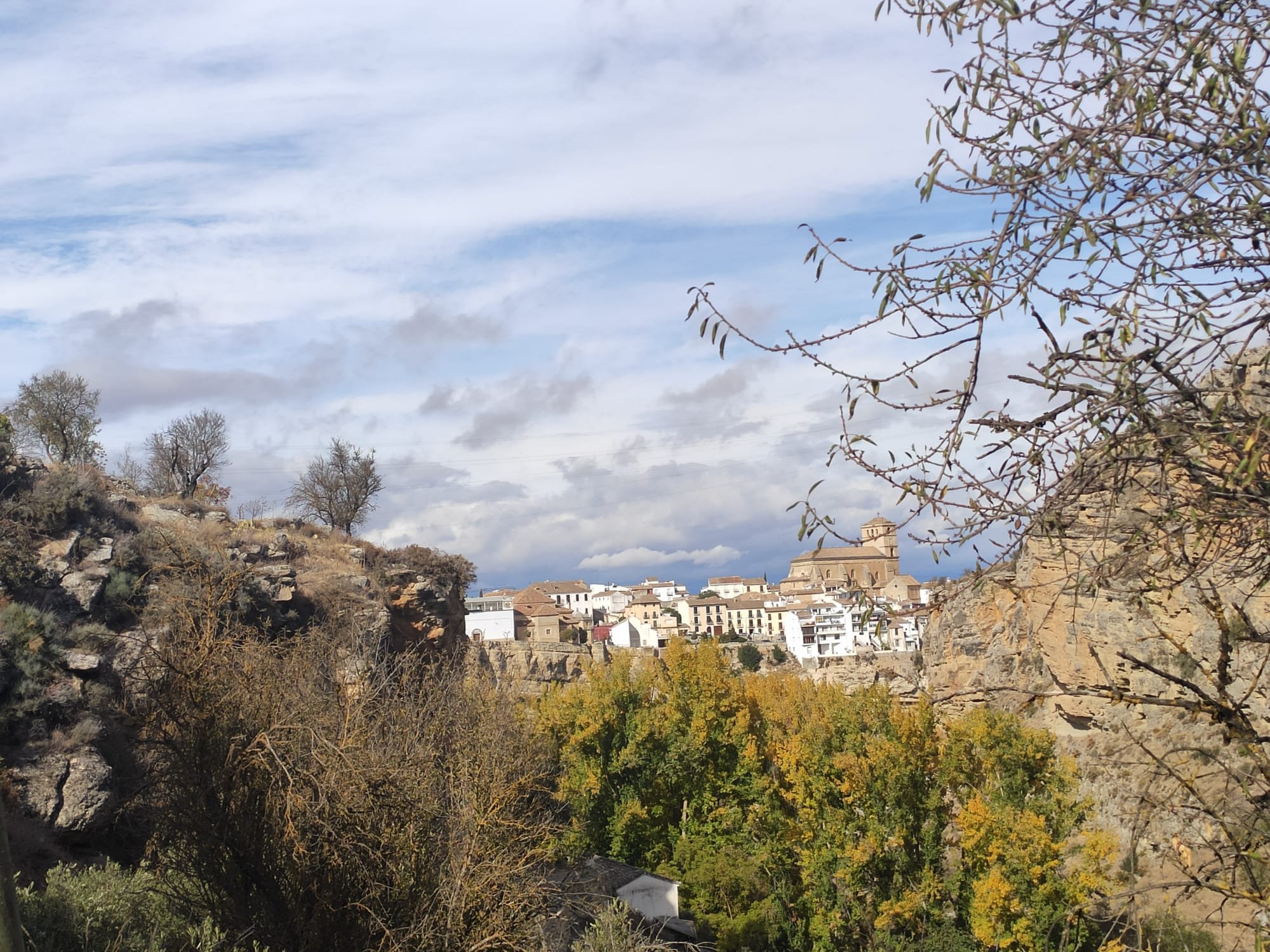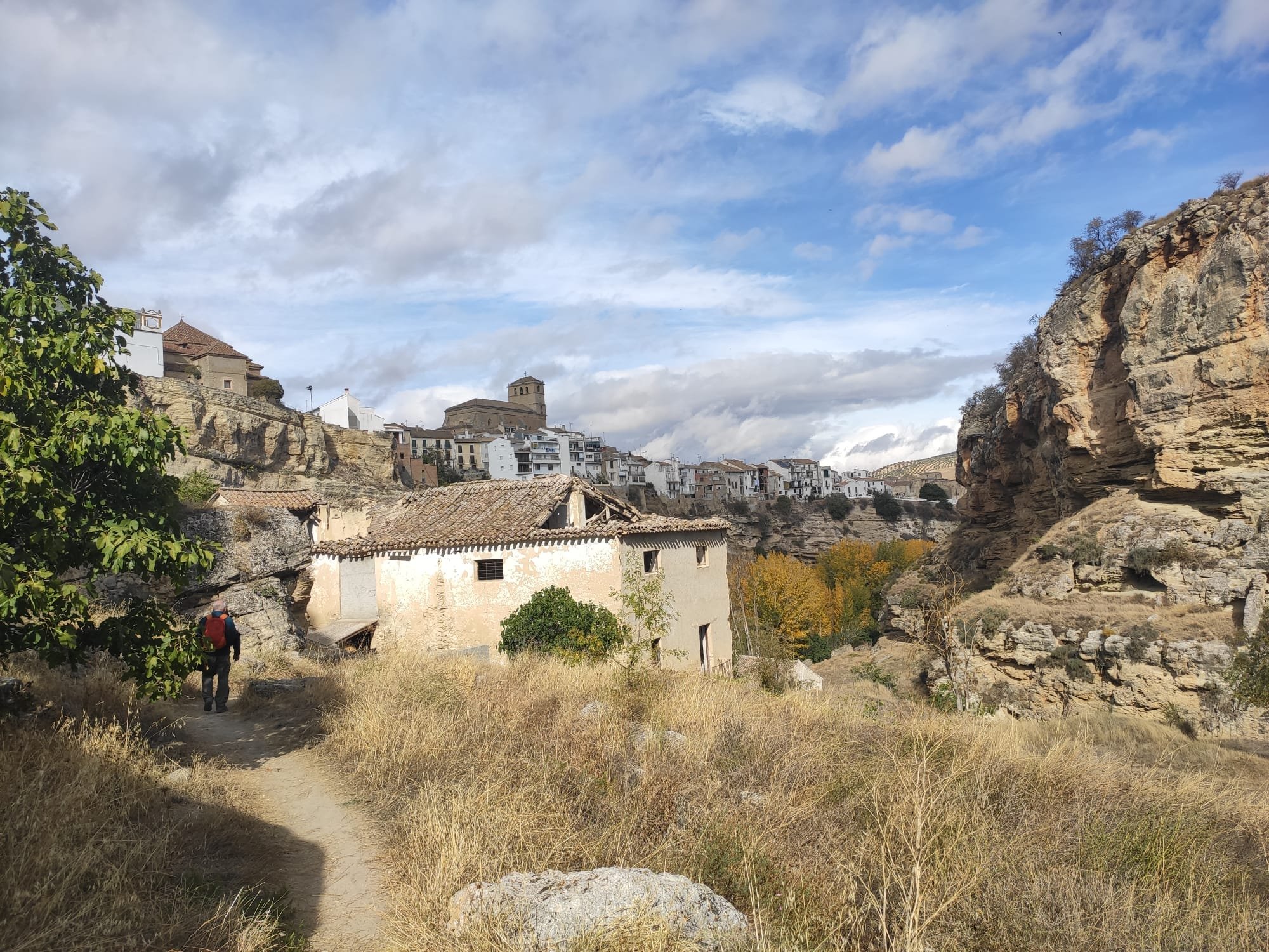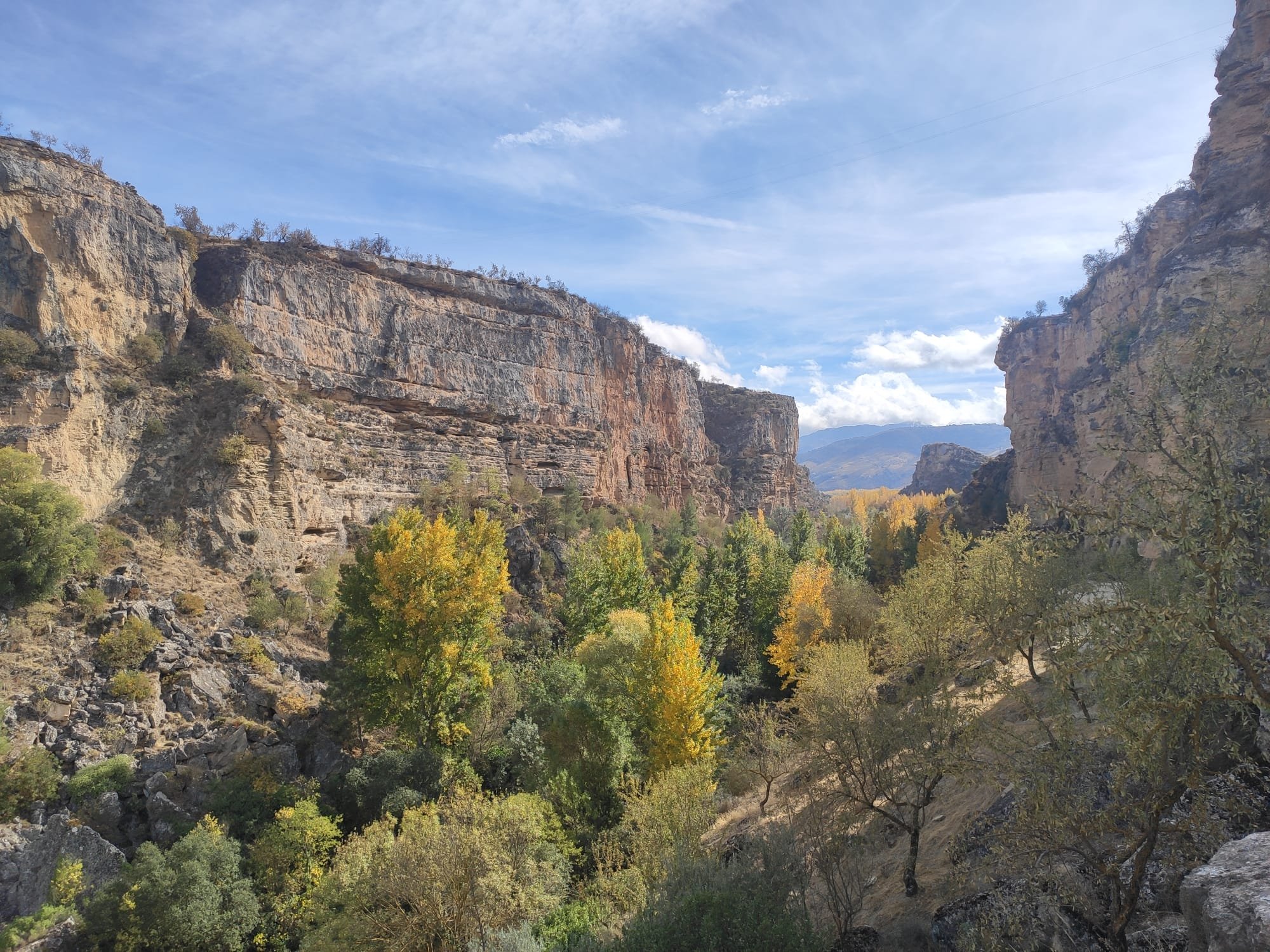 Por la parte de atrás de la quesería encontraremos un carril (muy transitado por las cabras) y pasaremos por una cruz, un cortijo en ruinas, un abrevadero y una fuente con agua fresca que llaman las Pilas de Capillanía. Más adelante nos desviaremos a la derecha y poco después a la izquierda hasta alcanzar de nuevo la carretera A-402. Tras unos 600 m por la carretera y justo antes de una cerrada curva tomaremos un carril que discurre entre unas casitas de recreo en dirección a un pinar. Bajaremos por el pinar hasta llegar a una pantaneta que regula el cauce del río Alhama. Pasada la pantaneta a la izquierda de la carretera sale un camino que discurre junto al río y al monumento natural Tajos de Alhama.