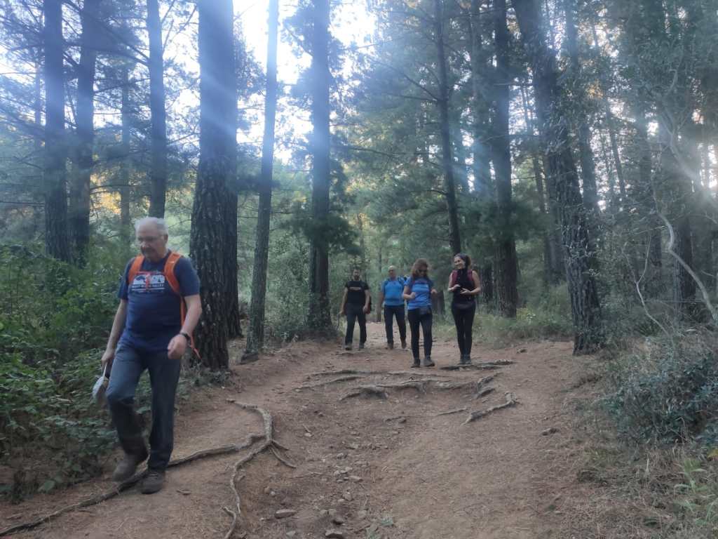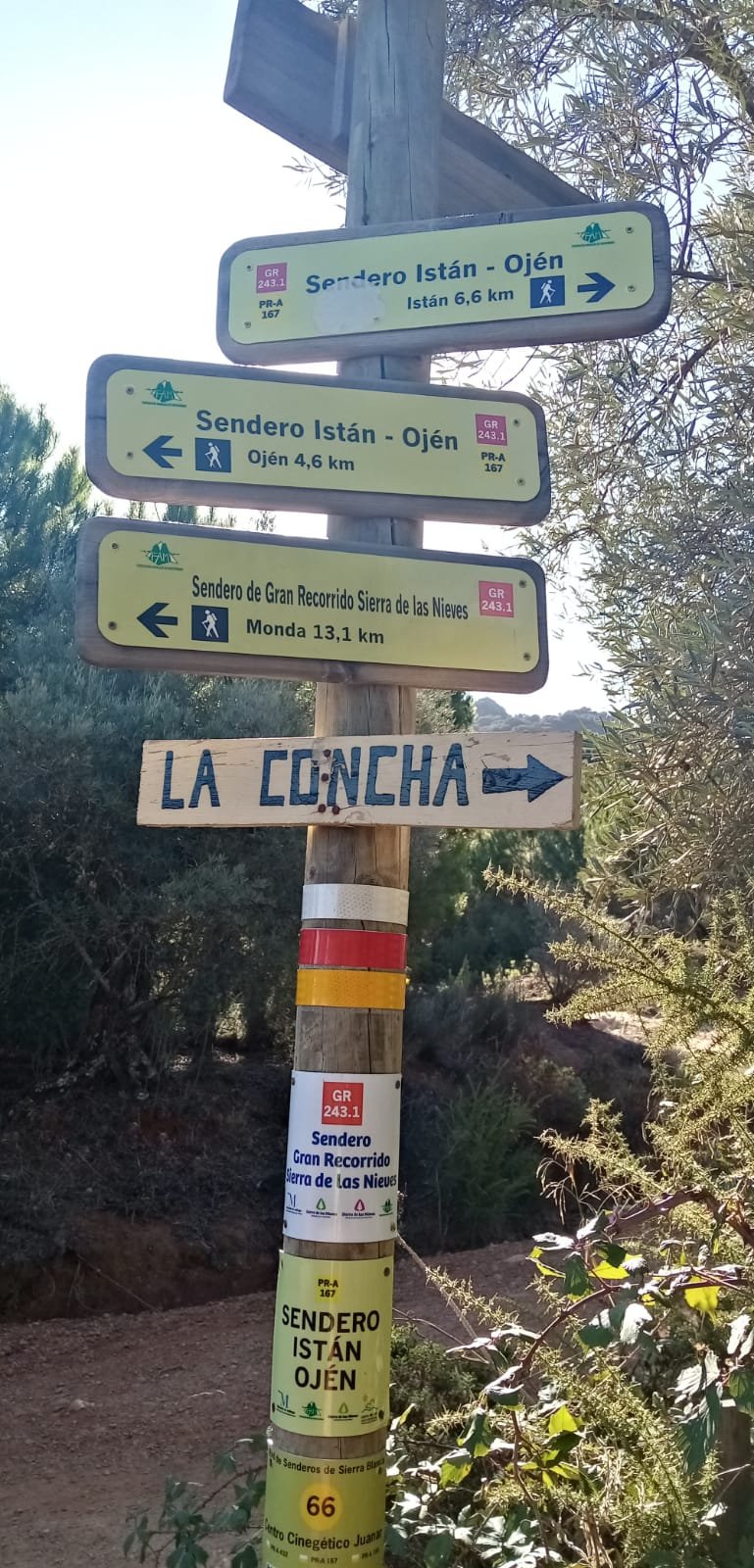Iniciamos el recorrido en el parking junto a la cancela que da acceso al Monte público Sierra Blanca de Ojén. La primera parte de la ruta transcurre por un denso pinar hasta llegar a una zona un poco más despejada en donde encontraremos varias señales: hacia el mirador del Corzo (unos 900 m que nos llevan a un mirador desde el que se divisa Ojén y un aperitivo de lo que puede venir luego) el sendero señalizado Ojén-Istán, y la subida a la concha. Nosotros nos acercamos al mirador mientras esperamos al grueso del grupo, después continuamos siguiendo las señales para la subida a La Concha.