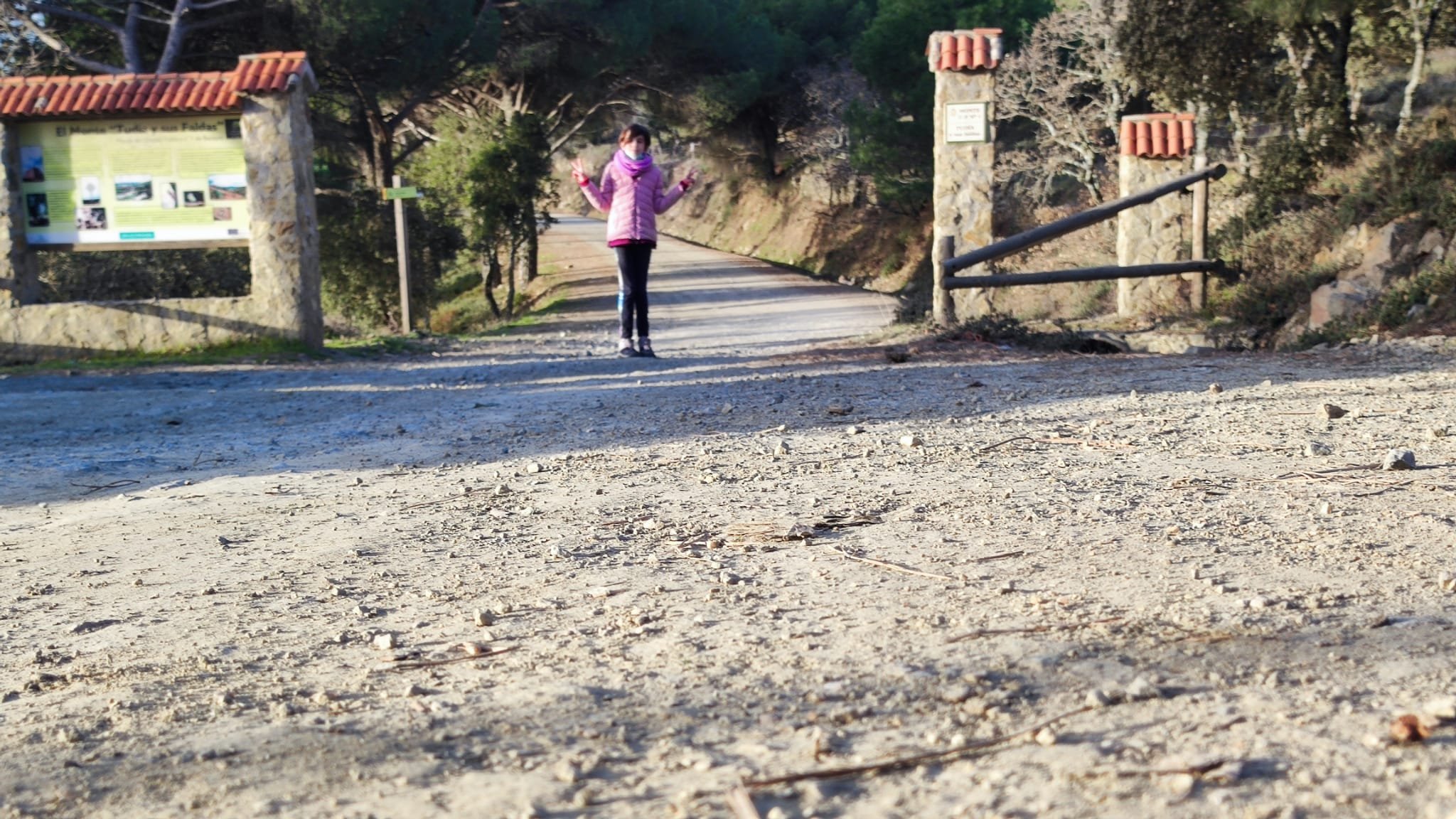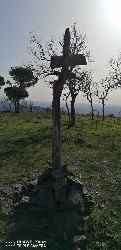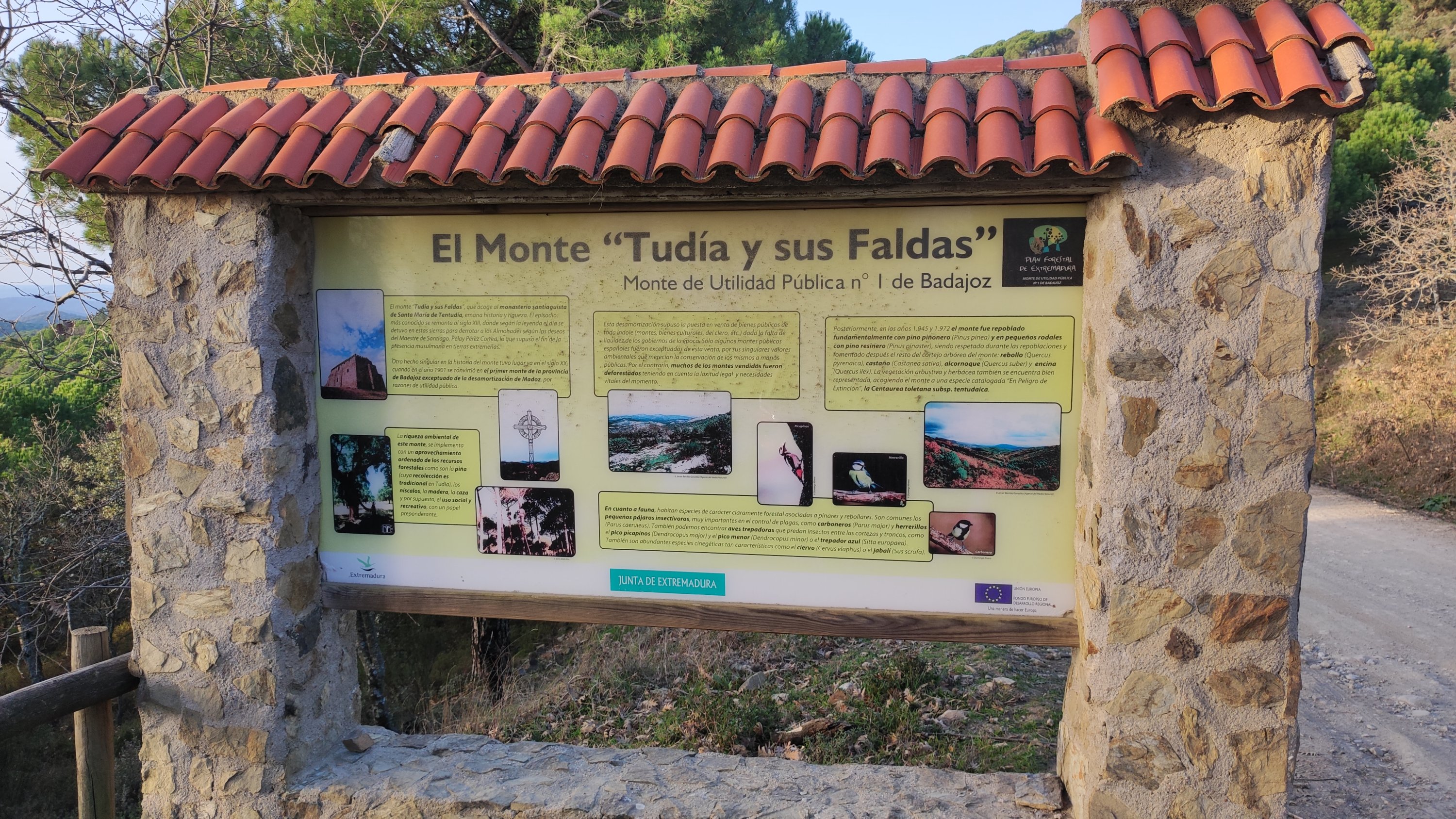 Como en aquella ocasión comenzamos a caminar por la pista forestal que se adentra en el monte de utilidad pública nº 1 de Extremadura en dirección hacia el Monasterio. Pasamos junto a los paneles informativos de las distintas rutas señalizadas que concurren en este espacio y cruzamos la cancela que da entrada a este monte de utilidad pública. Seguimos el carril hasta el desvío de las casas rurales de Tentudía y tomamos el carril/cortafuegos que nos lleva hasta el promontorio de las antenas. A nuestra izquierda van quedando grandes masas de pino negro (piñonero) que lucen majestuosos.