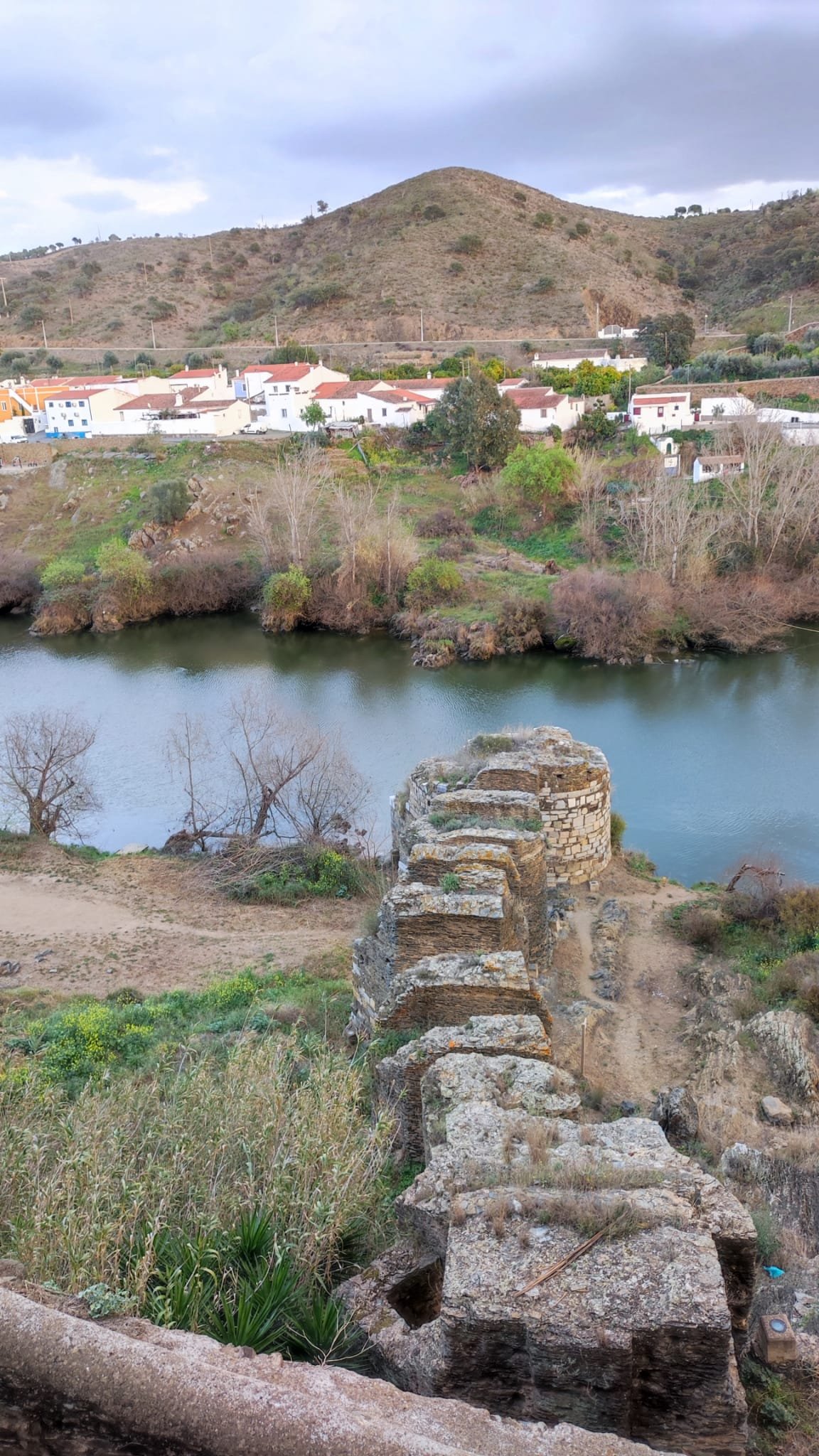 Estos antecedentes históricos nos van a explicar muchas cosas en nuestro deambular por la ciudad. Pongámonos en marcha y comencemos nuestro paseo en la parte baja de la ciudad en un aparcamiento junto al Club Náutico y el río Guadiana. En este punto se puede hacer un paseo fluvial muy interesante y que lo dejamos para otra ocasión. Nos dirigimos en sentido favorable a la corriente del río, junto a los restos de la muralla, y lo primero que nos encontramos son los restos de una posible torre albarrana con varios pilares que podrían ser parte del puente de acceso a la torre. Hay varias hipótesis la más viable es que se trate de un punto defensivo del puerto fluvial que, con la ayuda de una cadena, podría servir para controlar el paso de barcos y mercancías.