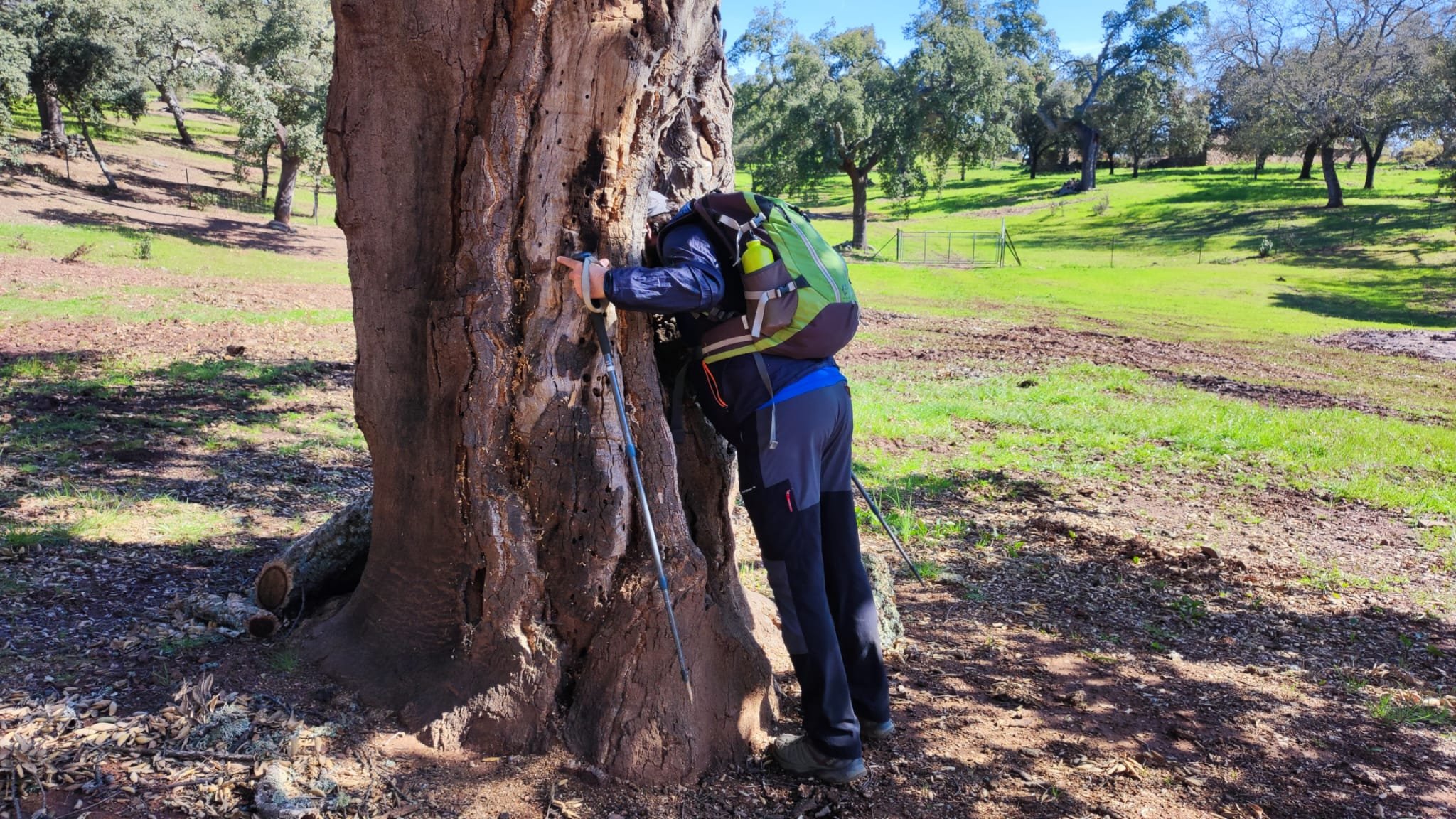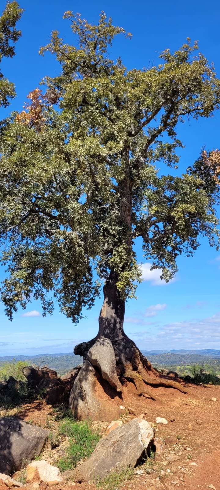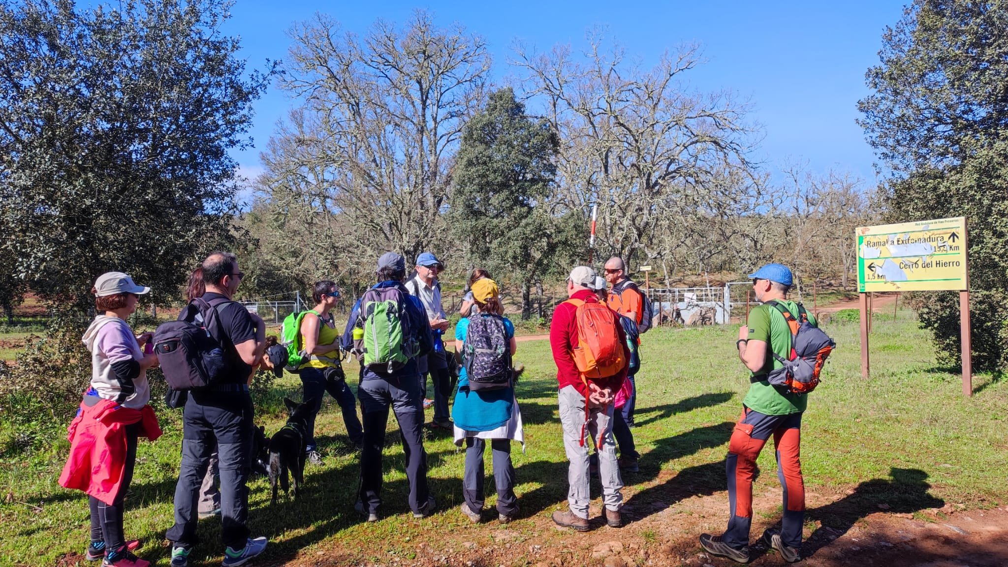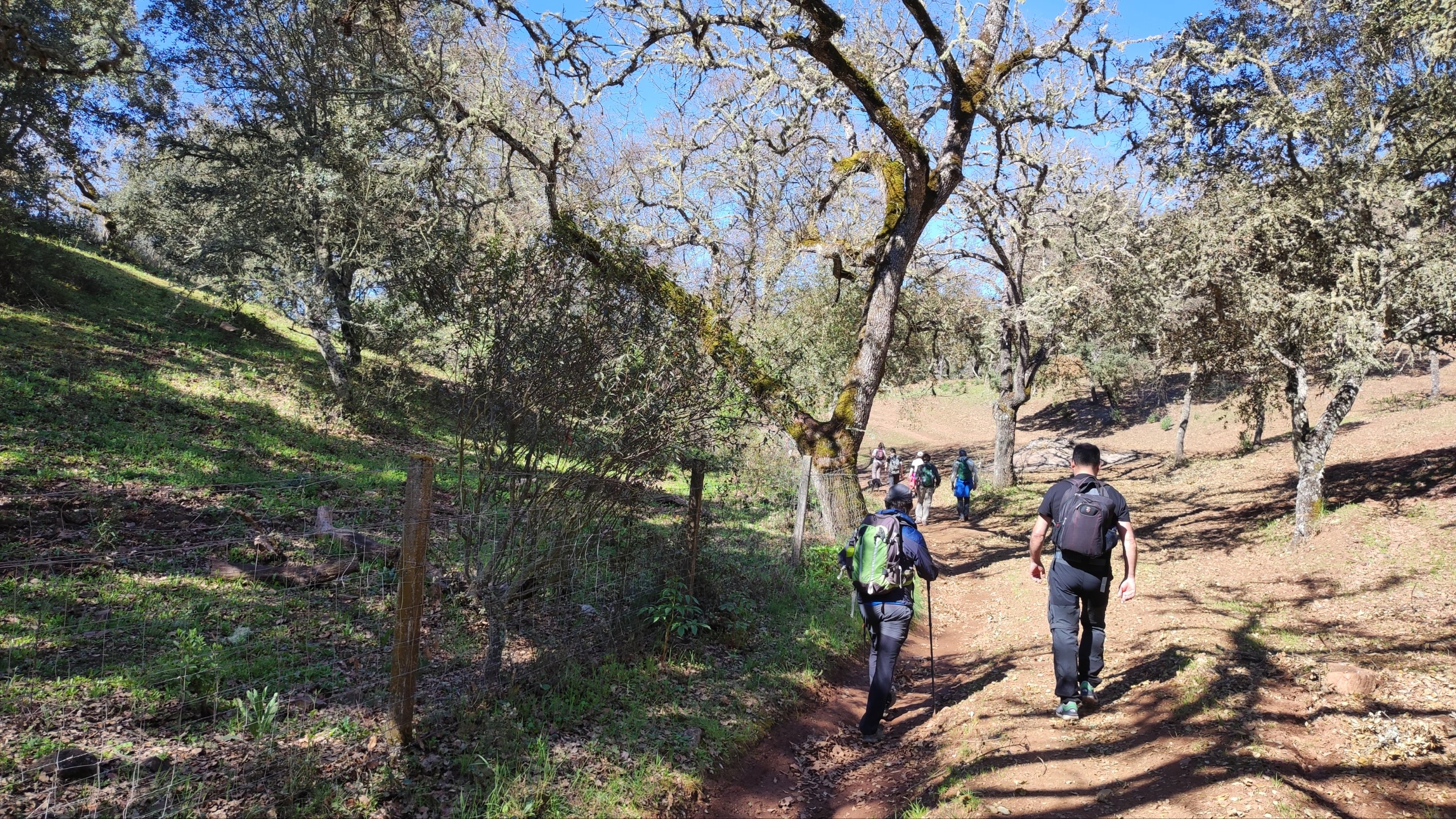 Hace una mañana fresca y soleada y tras el encuentro y los saludos de rigor comenzamos a caminar por la Vía Verde de la Sierra Norte que discurre por el antiguo trazado del ferrocarril minero que llegaba hasta Cazalla. Hacia el km 3,3 de nuestro recorrido abandonamos la Vía Verde por un carril a la izquierda junto al Cortijo del Mojón Blanco, que nos llevará hasta una cancela que atravesamos cuidando de dejarla cerrada. Desde un prado cercano accedemos a la Vereda del Rebollar que nos hará la aproximación hasta el Cerro del Hierro. En el camino atravesamos diversas formaciones vegetales predominando el paisaje adehesado con alcornoques y encinas, algunos robles y quejigos mediterráneos. También encontraremos los arbustos propios de este paisaje como la jara y el cantueso.