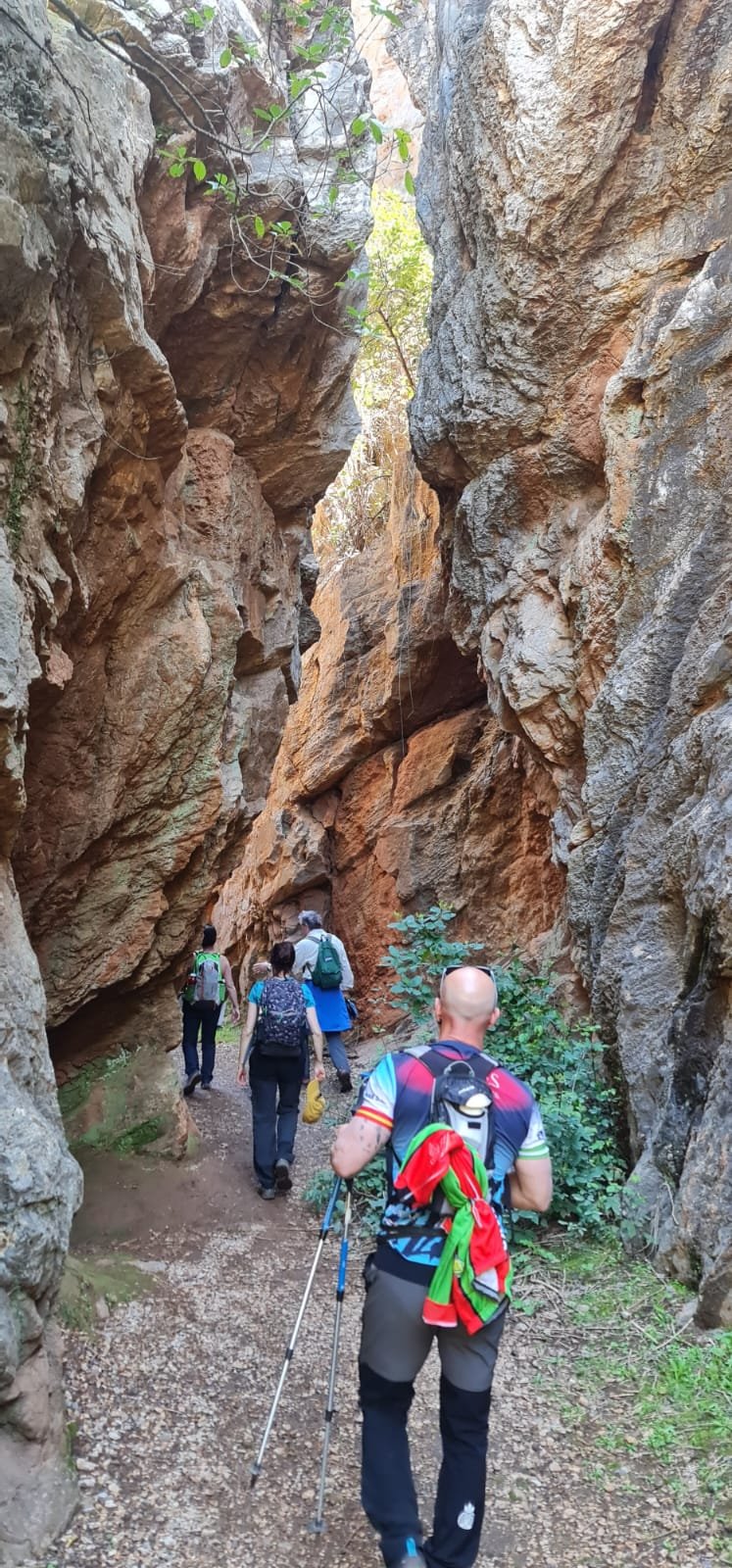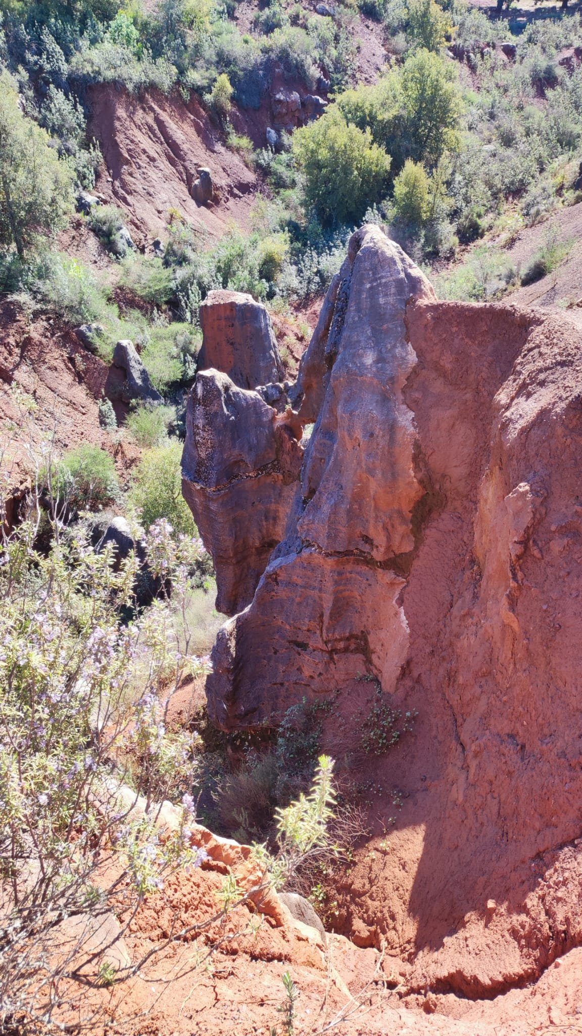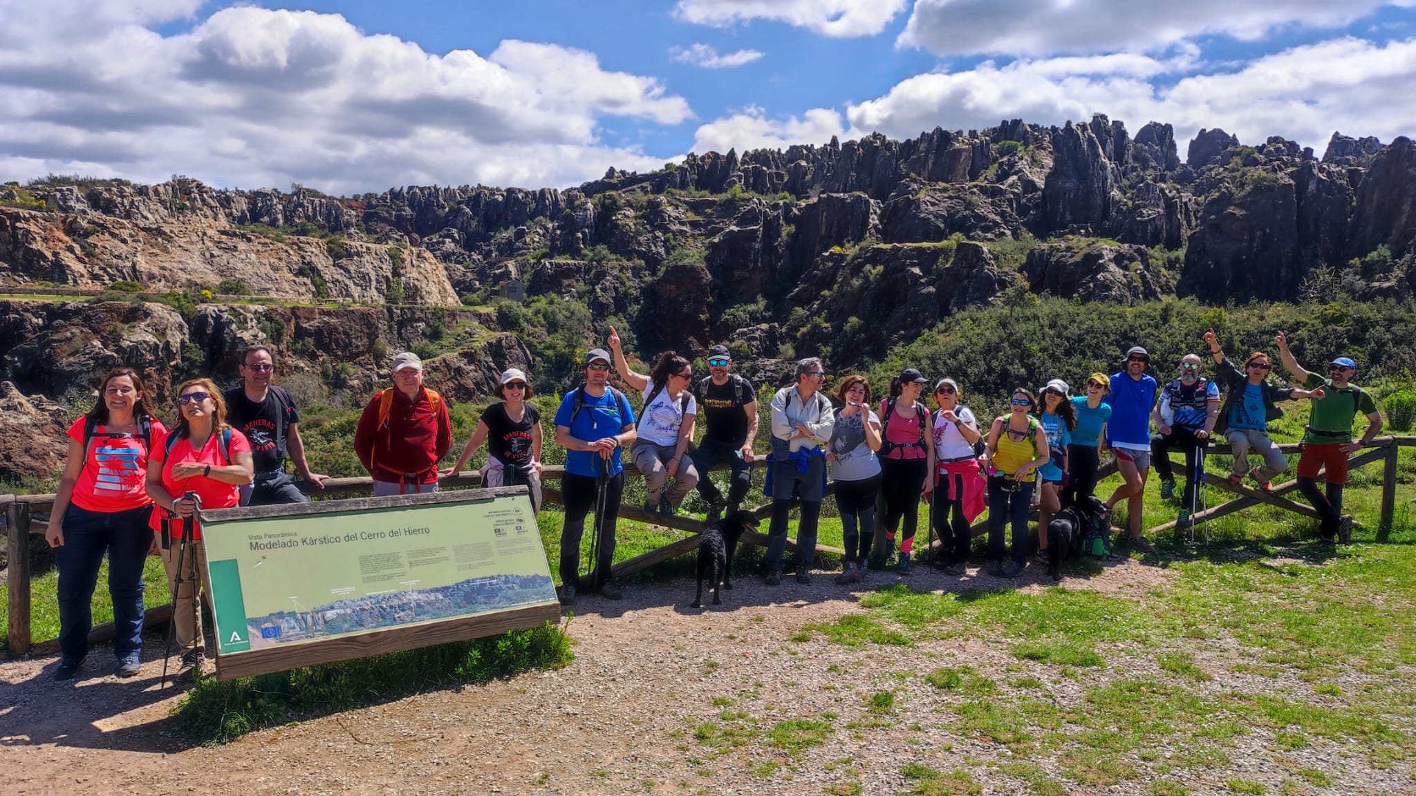 Hacia el km 7 del recorrido comenzamos a ver las primeras afloraciones calizas con pequeños torcales que surgen de la tierra roja. Alguna charca de color mostaza deja patente la presencia del mineral de hierro. En este punto nos adentramos ya en los senderos del Cerro del hierro donde haremos un pequeño receso para tomar una fruta antes de continuar hacia la bajada a los túneles de la explotación minera y una gran bóveda de piedra. Finalmente, por el camino adaptado volvemos al poblado minero buscando el bar La Cantina.