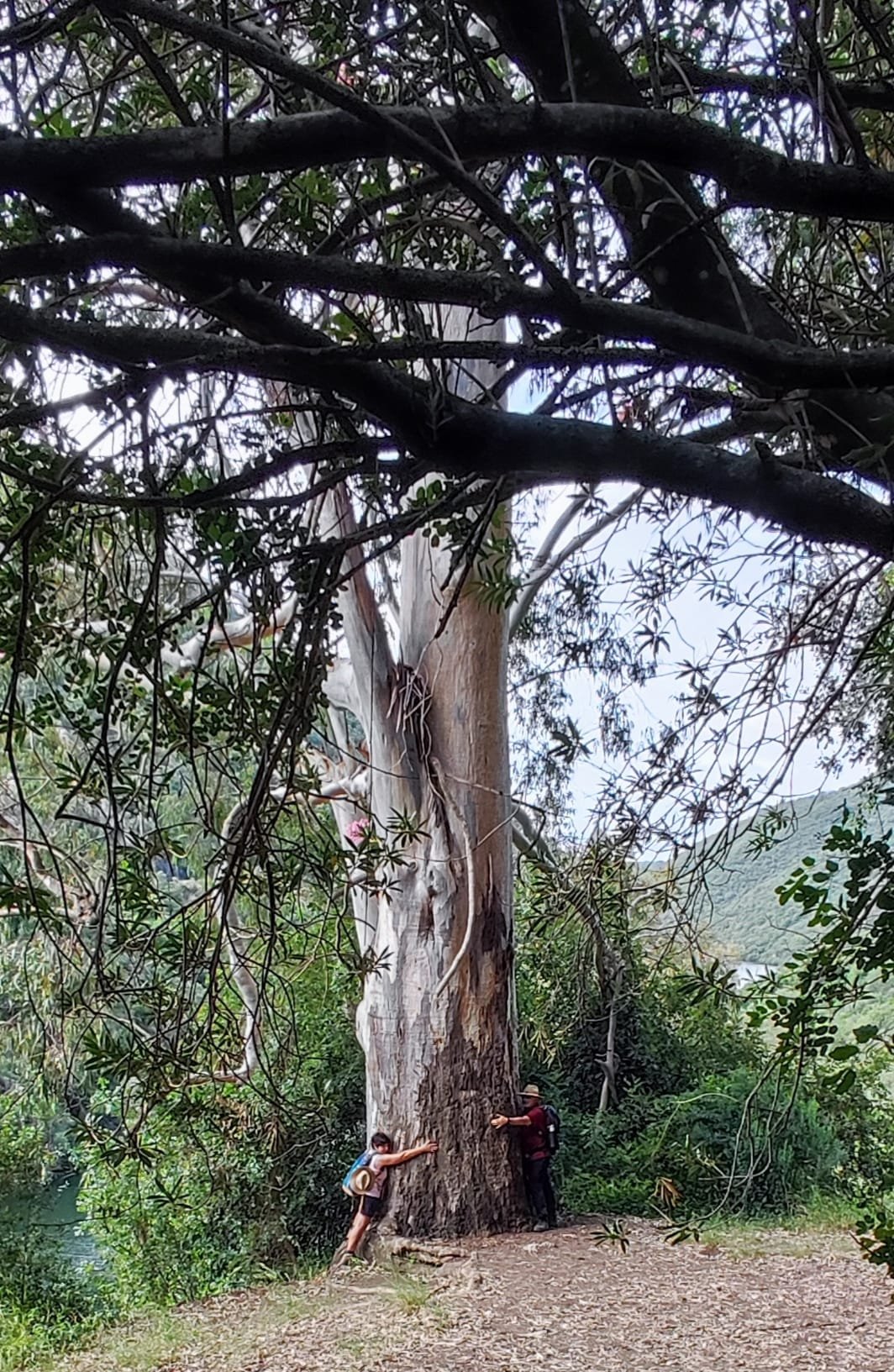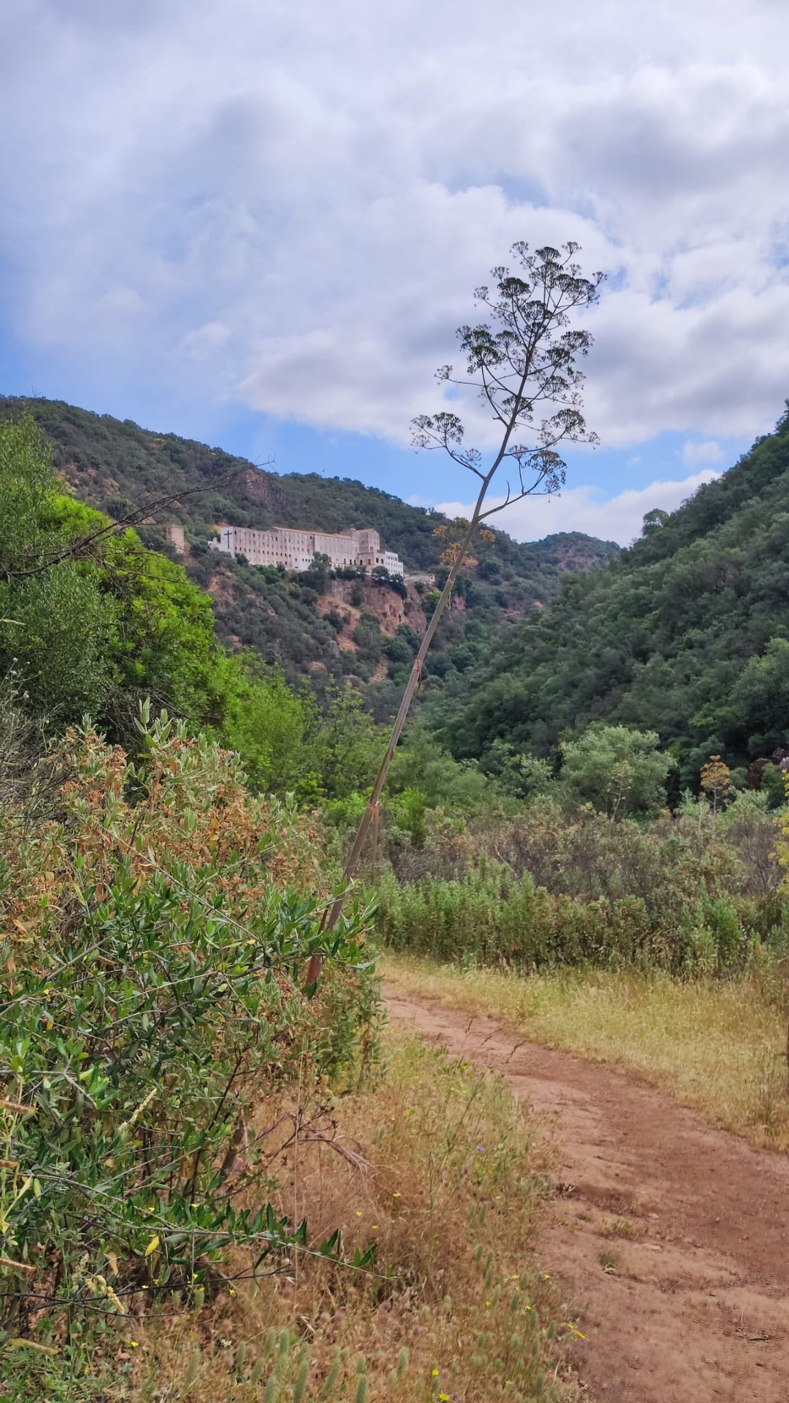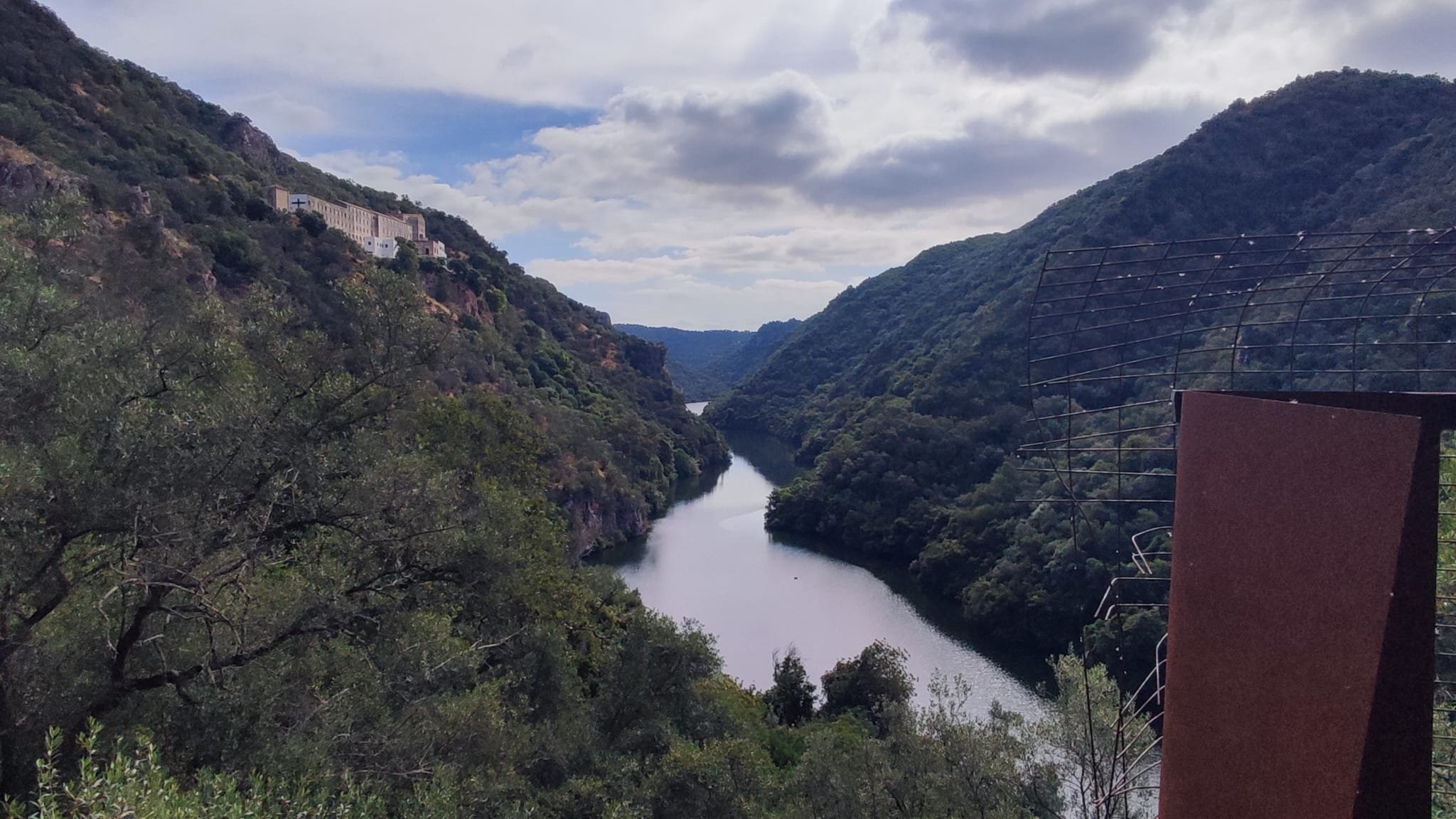 La subida es de apenas un km. Pasamos bajo una puertecilla metálica en la que indican que el seminario está en obras, un grupo de majestuosos eucalitus (uno de ellos caído sobre unas rocas) y llegamos a un pedestal con una cruz de hierro. Aquí las vistas sobre el embalse son magníficas y tras las fotos de rigor, hacemos los 300 m que nos separan del Seminario.