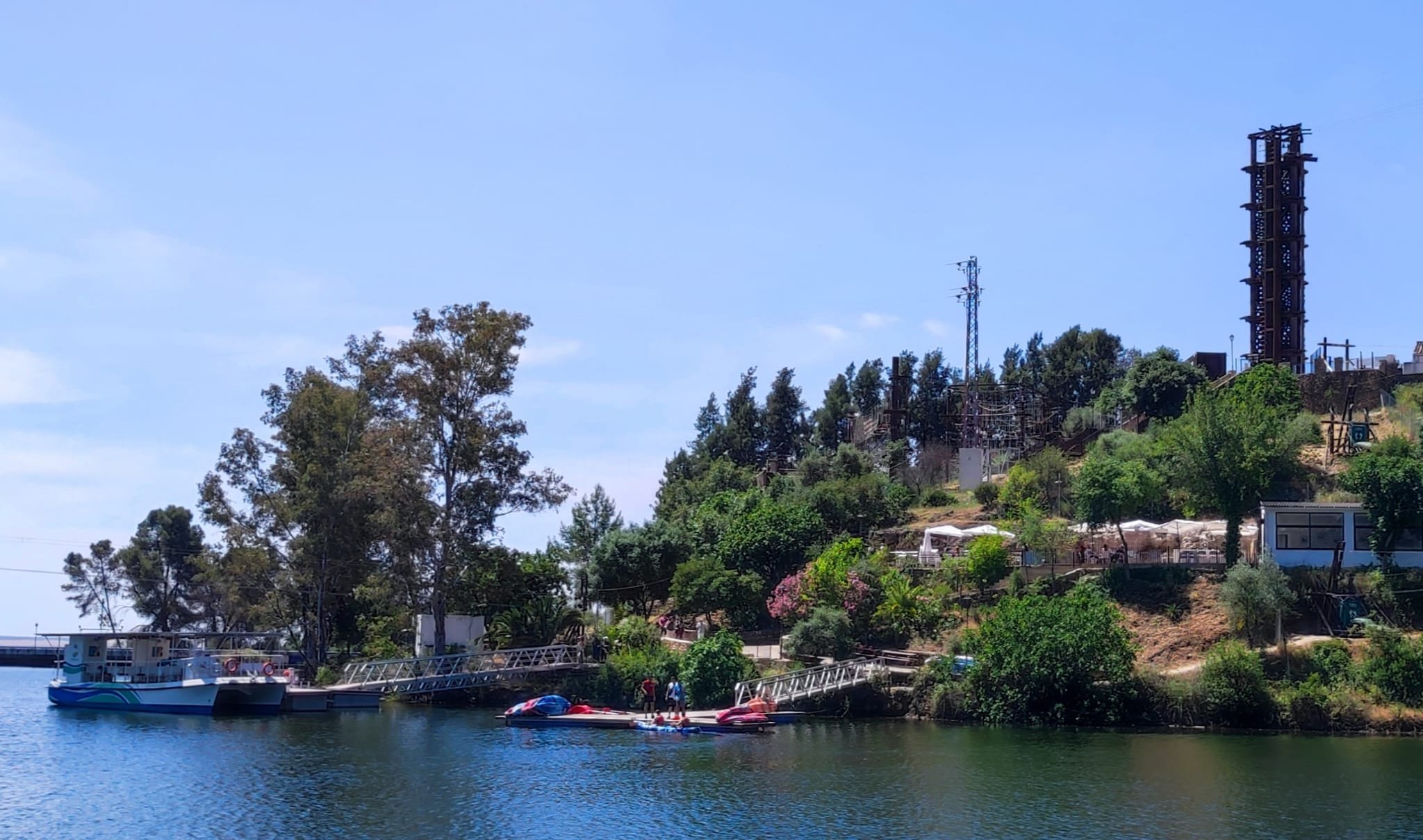 A partir de este punto seguimos un estrecho sendero junto a las aguas del embalse de derivación entre una vegetación propia del bosque mediterráneo mediatizada por presencia de las aguas del embalse. La encina es el árbol más abundante, junto con los acebuches, los jarales y algunos eucaliptus de gran porte. Entre la fauna, vemos algunos buitres leonados, alguna cigüeña negra y el canto de los jilgueros y el arrullo de las palomas. Es tierra de linces, pero lo frecuentado del sendero hace imposible su avistamiento. Hacia el km 5 de nuestro camino llegamos a la fuente de la amistad, el amor y la suerte que marca el comienzo de la pequeña ascensión. Es una fuente con tres caños nombrados de la amistad, del amor y de la suerte. Hoy no era el día del amor ya que de ese caño no manaba agua.