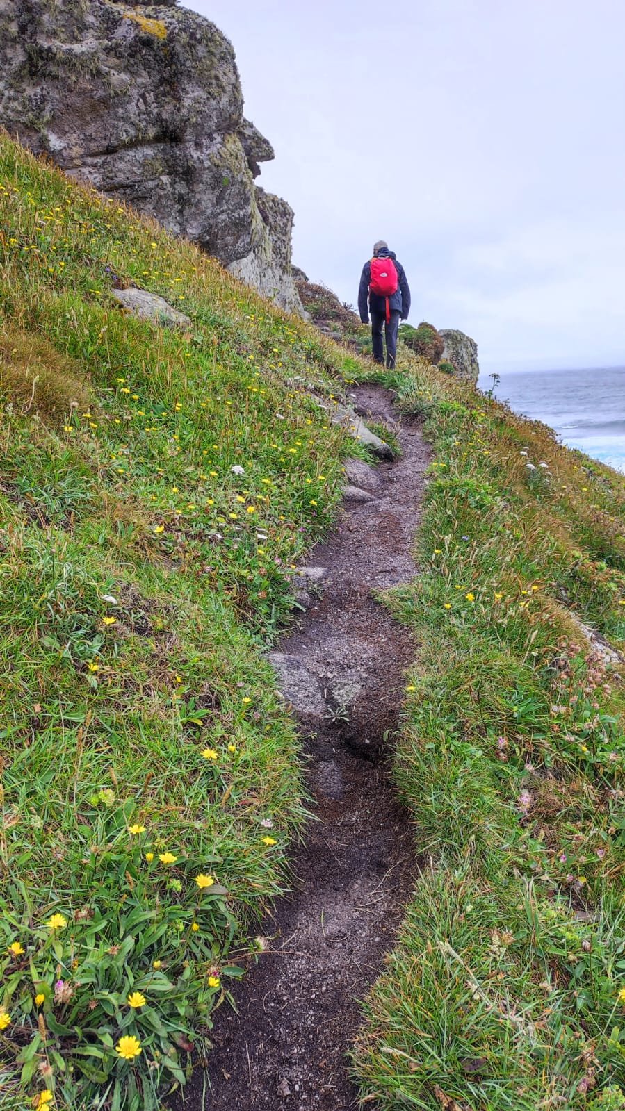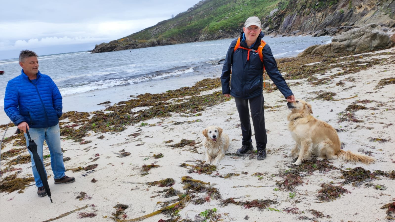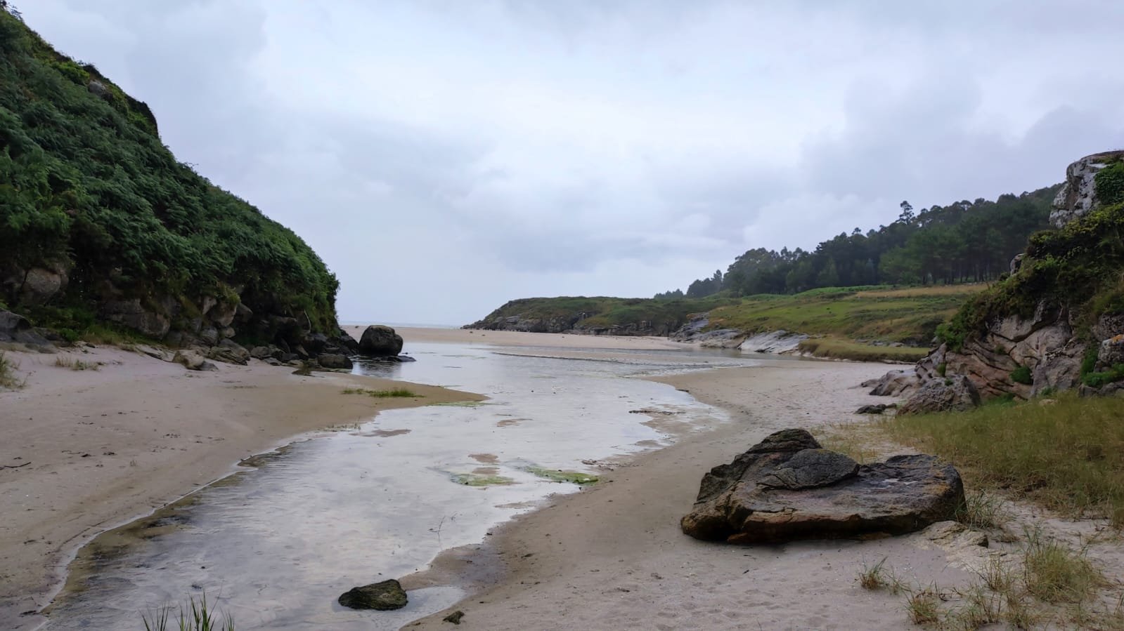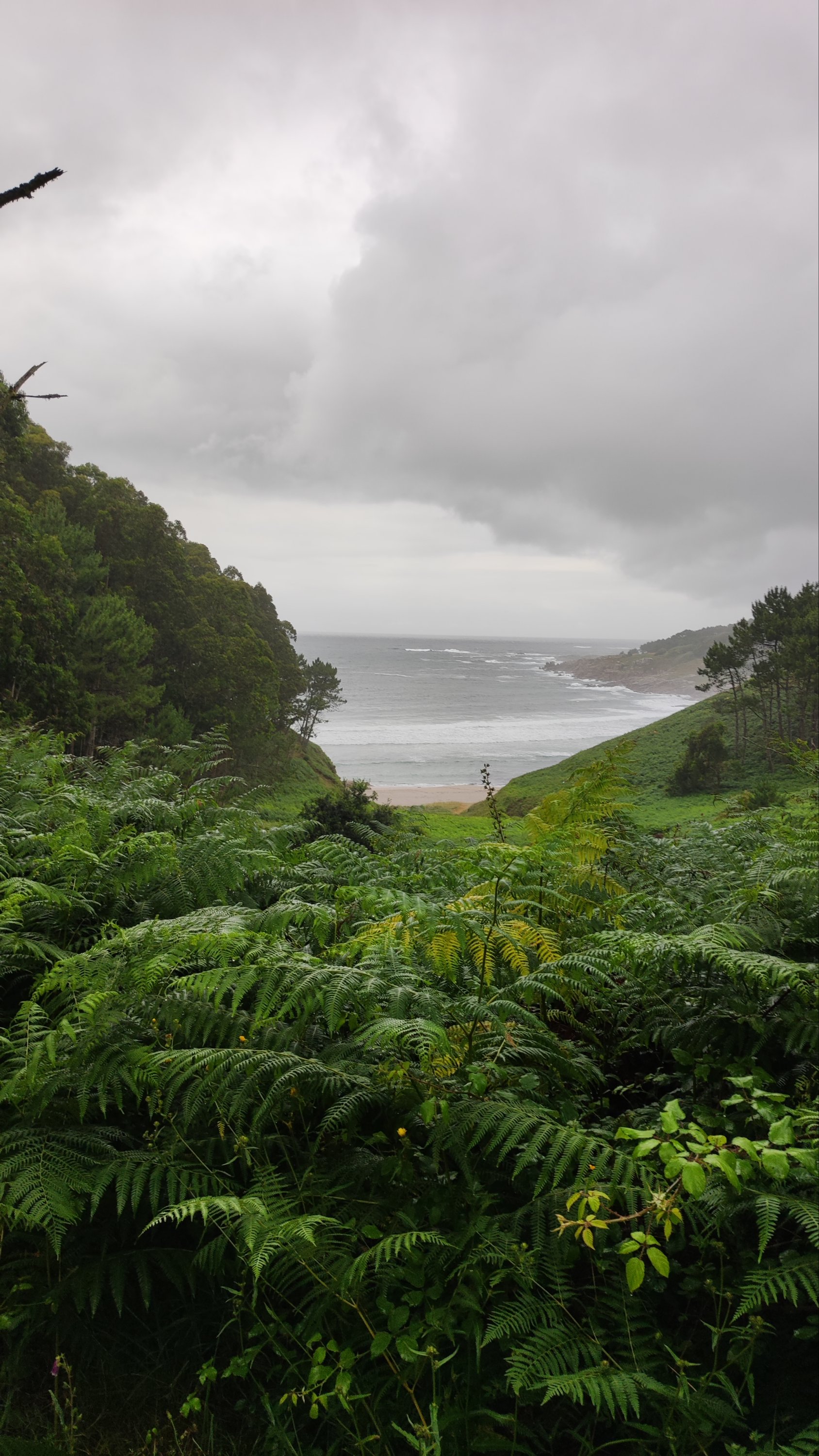 Comenzamos esta segunda etapa en la playa de Niñons, justo donde la terminamos ayer. Ha estado lloviendo toda la noche en Ponteceso, pero cuando José Luis, nuestro taxista, nos deja en la playa no llueve aunque el cielo está muy encapotado. Bajamos a la playa y a la izquierda vemos las flechas verdes que nos dirigen a una zona boscosa por la que discurre una bucólica vereda que deviene en pista forestal de la que sale otra vereda que nos asoma al acantilado. Avanzamos por el acantilado, avistamos la playa do Morro azotada por un fuerte oleaje, cruzamos un pequeño regato, cuando comienza a lloviznar.
