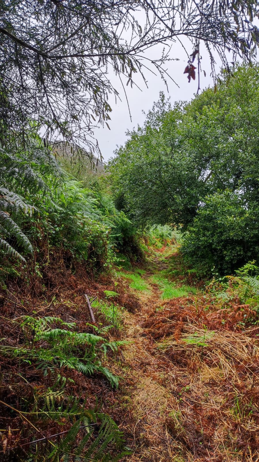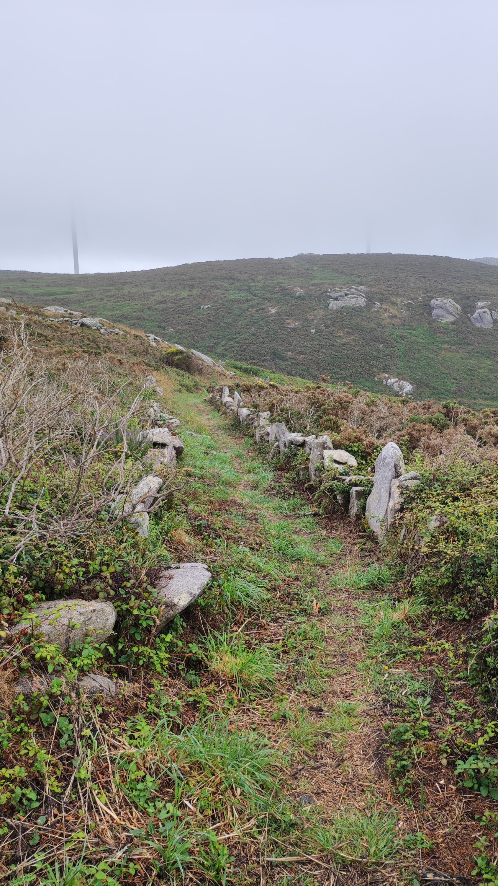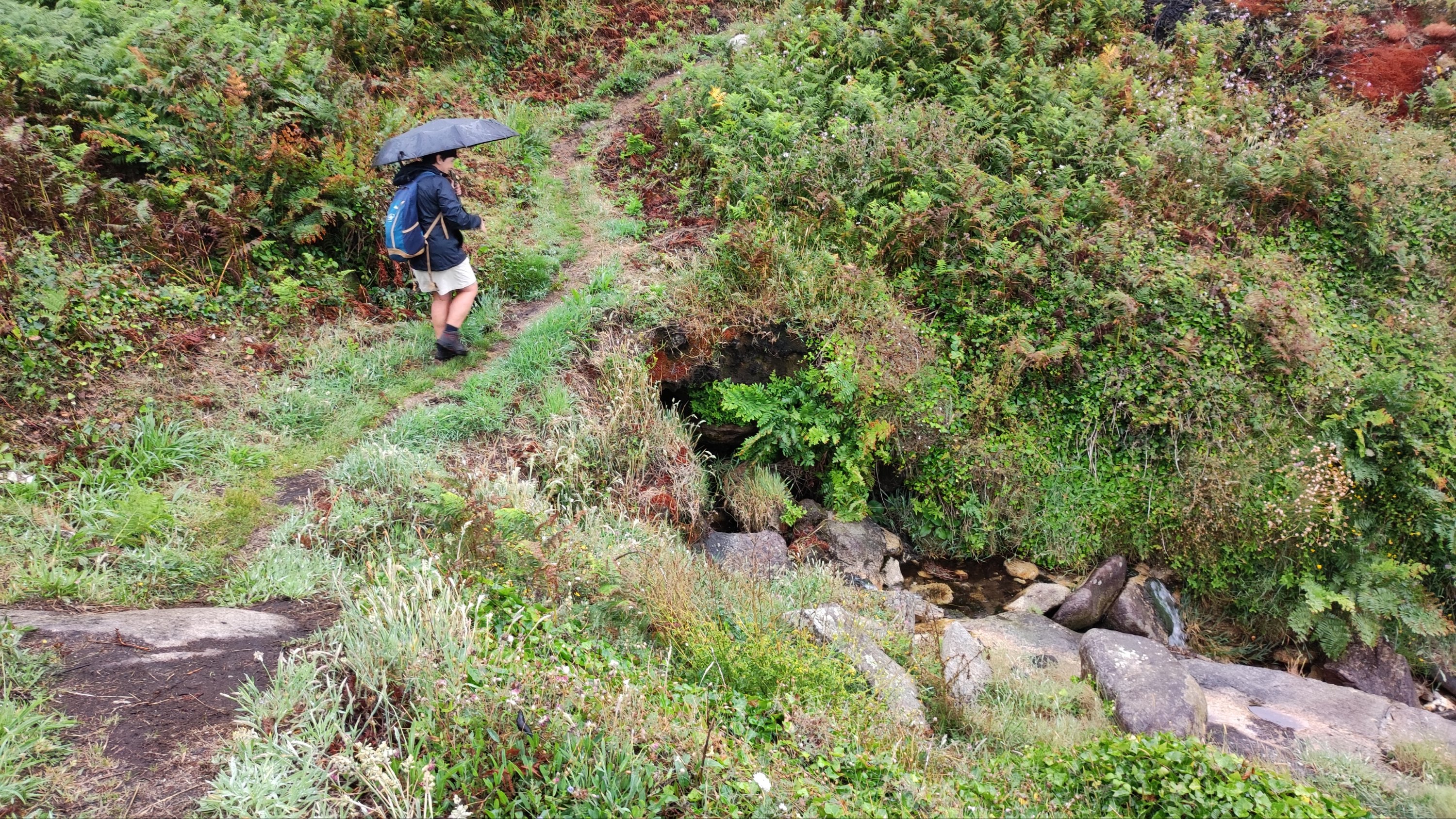 En la playa nos encontramos con un paseante con dos perros con el que conversamos un momento mientras tomamos unos dátiles y nos refrescamos antes de afrontar el siguiente tramo que nos llevará a la aldea de O Roncudo. Pasamos por la punta de Espiñeira y su cruz, por las puntas de Castro y das Eiras por un sendero a mitad del acantilado recién desbrozado, lo que hemos celebrado adecuadamente.La alegria ha durado poco. Desde la Punta Percebellosa iniciamos una fuerte subida con los helechos por la cintura.Vuelve a llover, con lo que la sensación es la de estar cruzando una ría cuesta arriba. Pasamos junto a un parque de aerogeneradores y nos adentramos en un denso bosque cruzado por un regato. La subida se hace mas empinada hasta que llegamos a la aldea de O Roncudo, con unos bonitos hórreos, casa de piedra muy cuidadas y un grifo para llenar agua. Dejamos la aldea por la carretera de servicio del parque eólico que pronto se transforma en pista y, después, en sendero. Un descenso hasta la cota de 20 m, que hay que gestionar con sumo cuidado, y su posterior subida hasta la Pedra Frades nos ponen el faro de O Roncudo a la vista. Para llegar al faro aun tenemos que sudar un poco y recorrer un rocoso sendero de unos 1500 m.