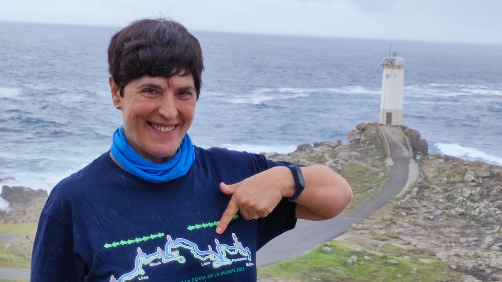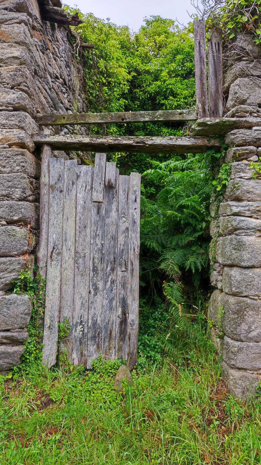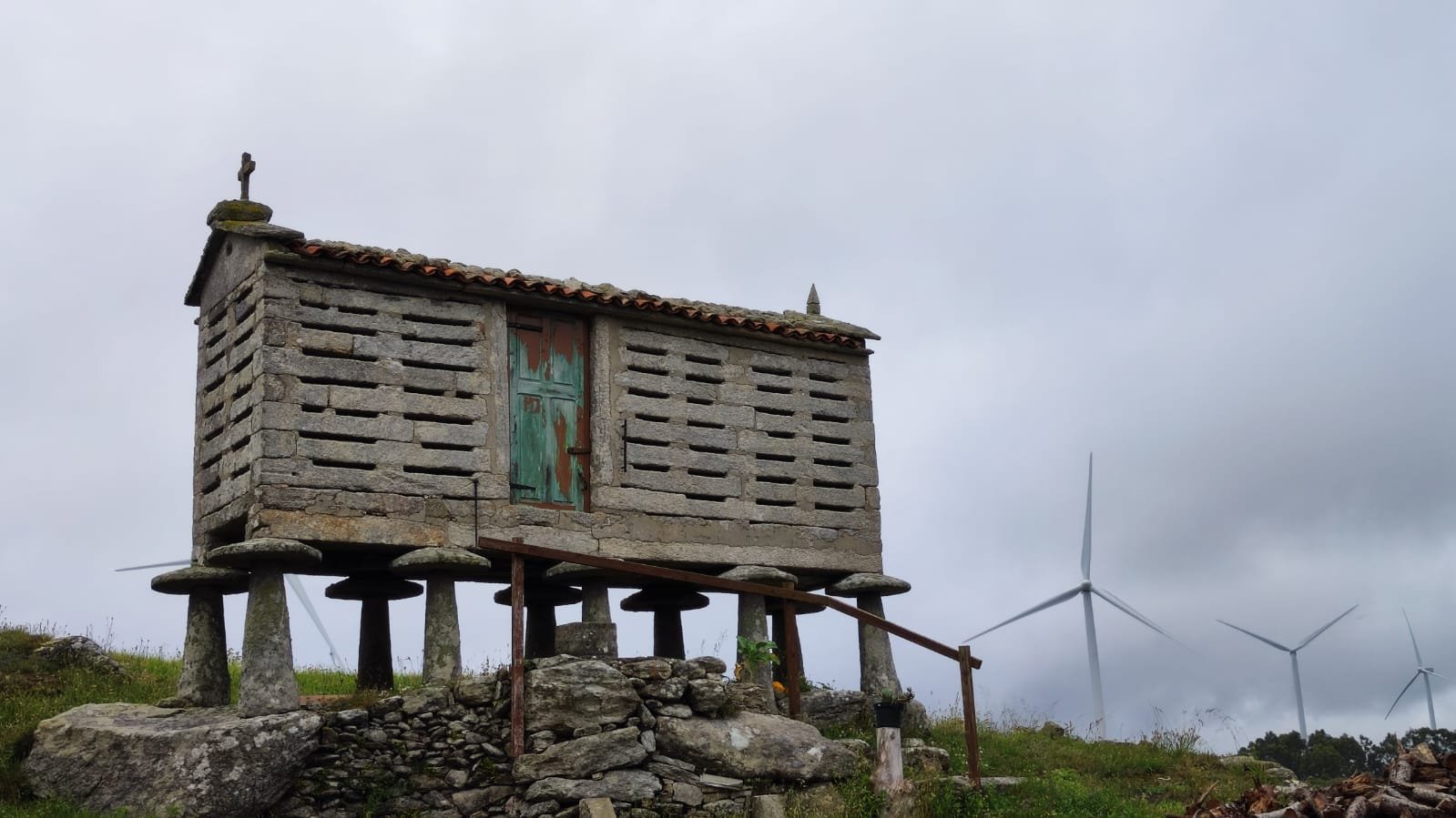 En la playa nos encontramos con un paseante con dos perros con el que conversamos un momento mientras tomamos unos dátiles y nos refrescamos antes de afrontar el siguiente tramo que nos llevará a la aldea de O Roncudo. Pasamos por la punta de Espiñeira y su cruz, por las puntas de Castro y das Eiras por un sendero a mitad del acantilado recién desbrozado, lo que hemos celebrado adecuadamente.La alegria ha durado poco. Desde la Punta Percebellosa iniciamos una fuerte subida con los helechos por la cintura.Vuelve a llover, con lo que la sensación es la de estar cruzando una ría cuesta arriba. Pasamos junto a un parque de aerogeneradores y nos adentramos en un denso bosque cruzado por un regato. La subida se hace mas empinada hasta que llegamos a la aldea de O Roncudo, con unos bonitos hórreos, casa de piedra muy cuidadas y un grifo para llenar agua. Dejamos la aldea por la carretera de servicio del parque eólico que pronto se transforma en pista y, después, en sendero. Un descenso hasta la cota de 20 m, que hay que gestionar con sumo cuidado, y su posterior subida hasta la Pedra Frades nos ponen el faro de O Roncudo a la vista. Para llegar al faro aun tenemos que sudar un poco y recorrer un rocoso sendero de unos 1500 m.