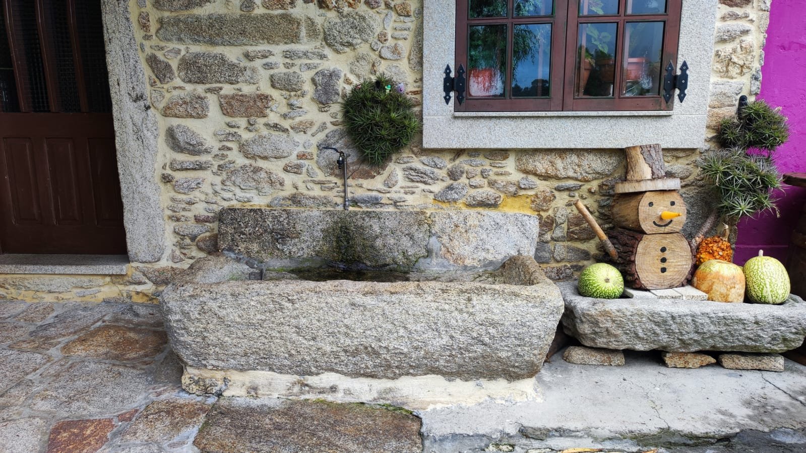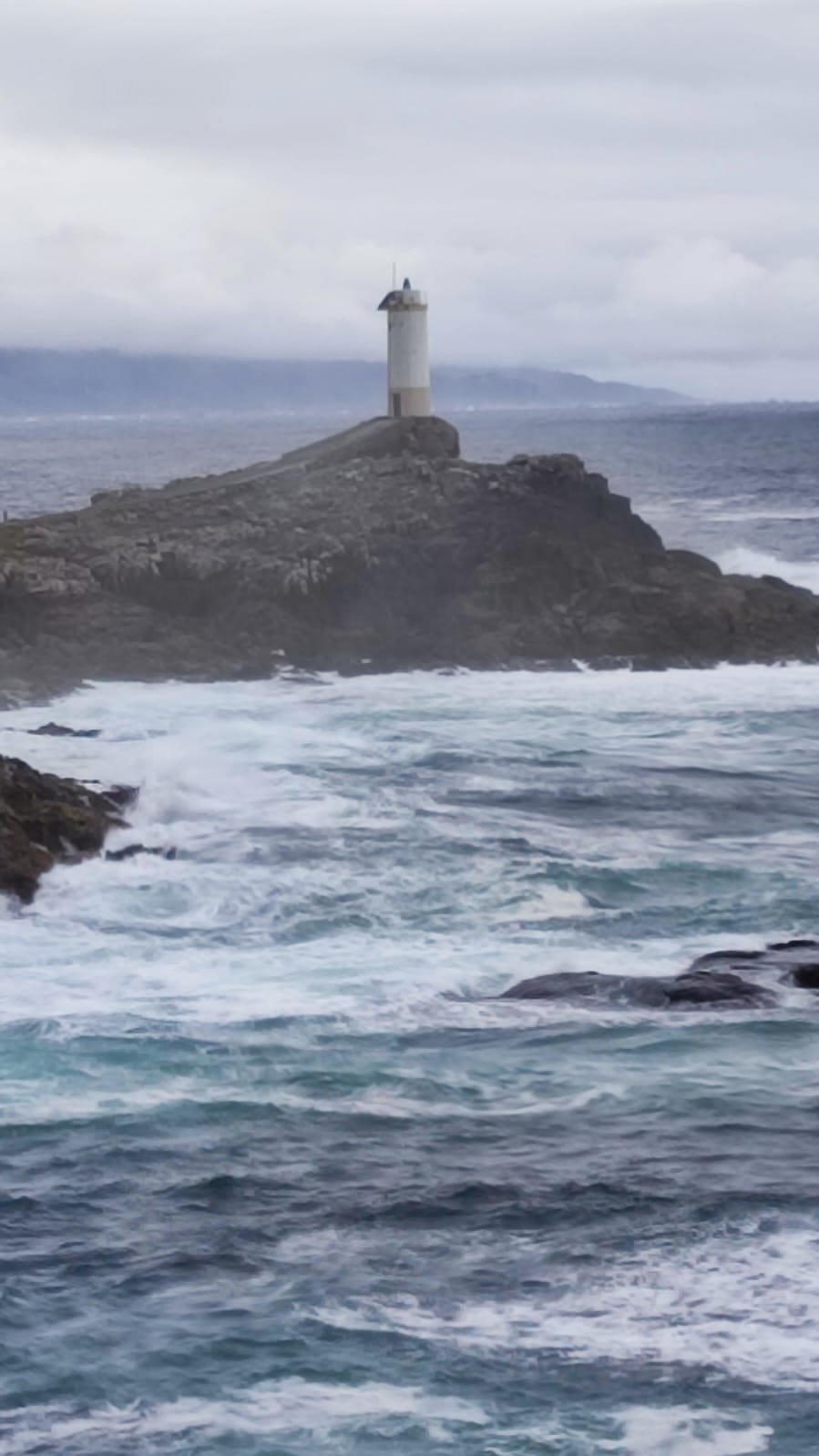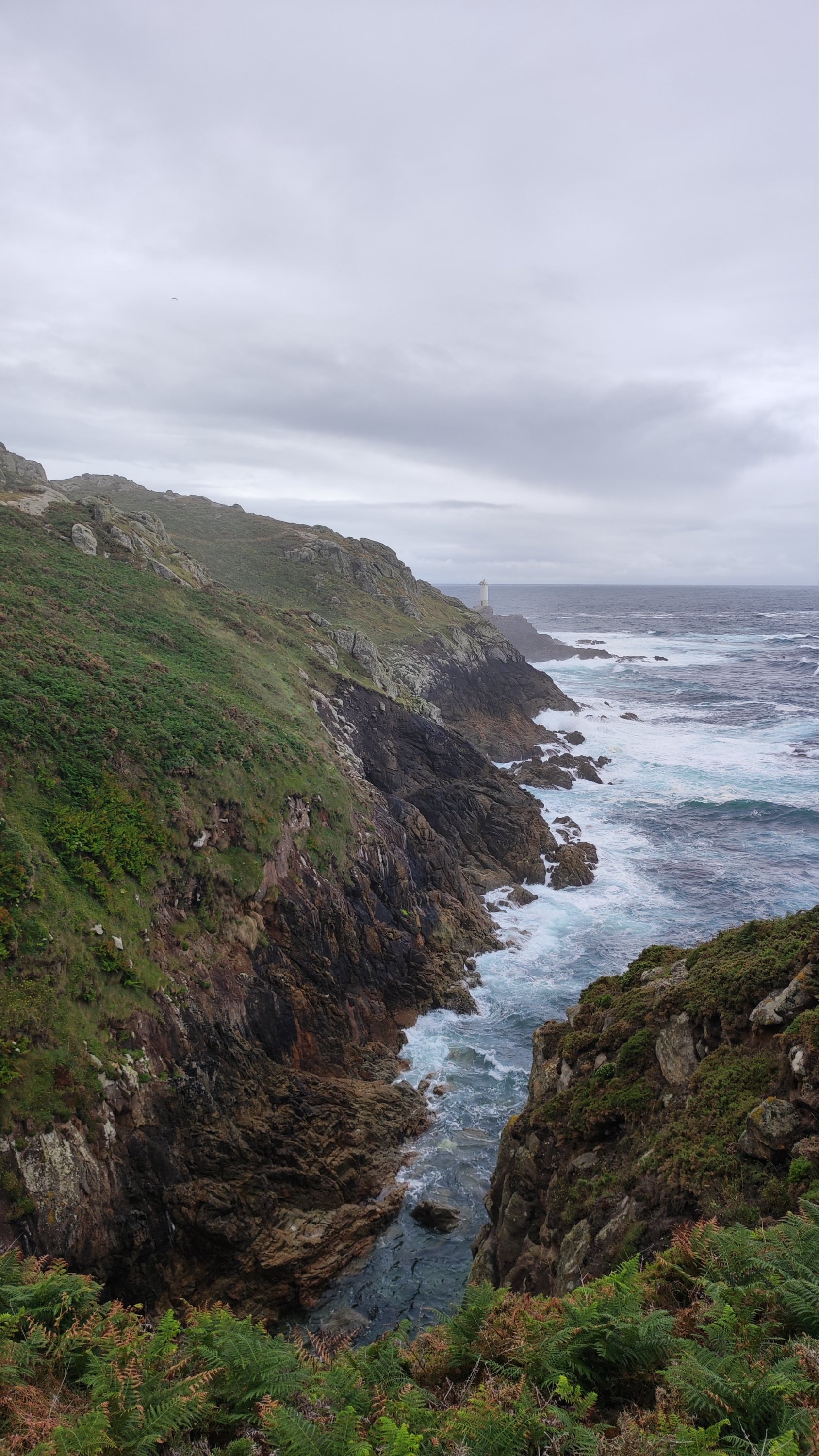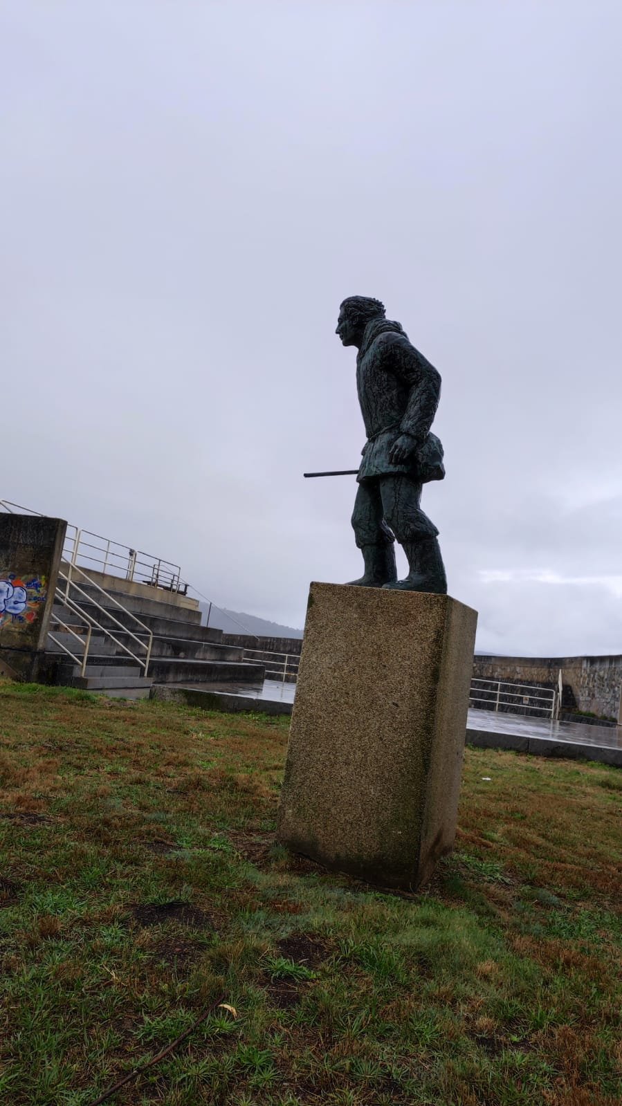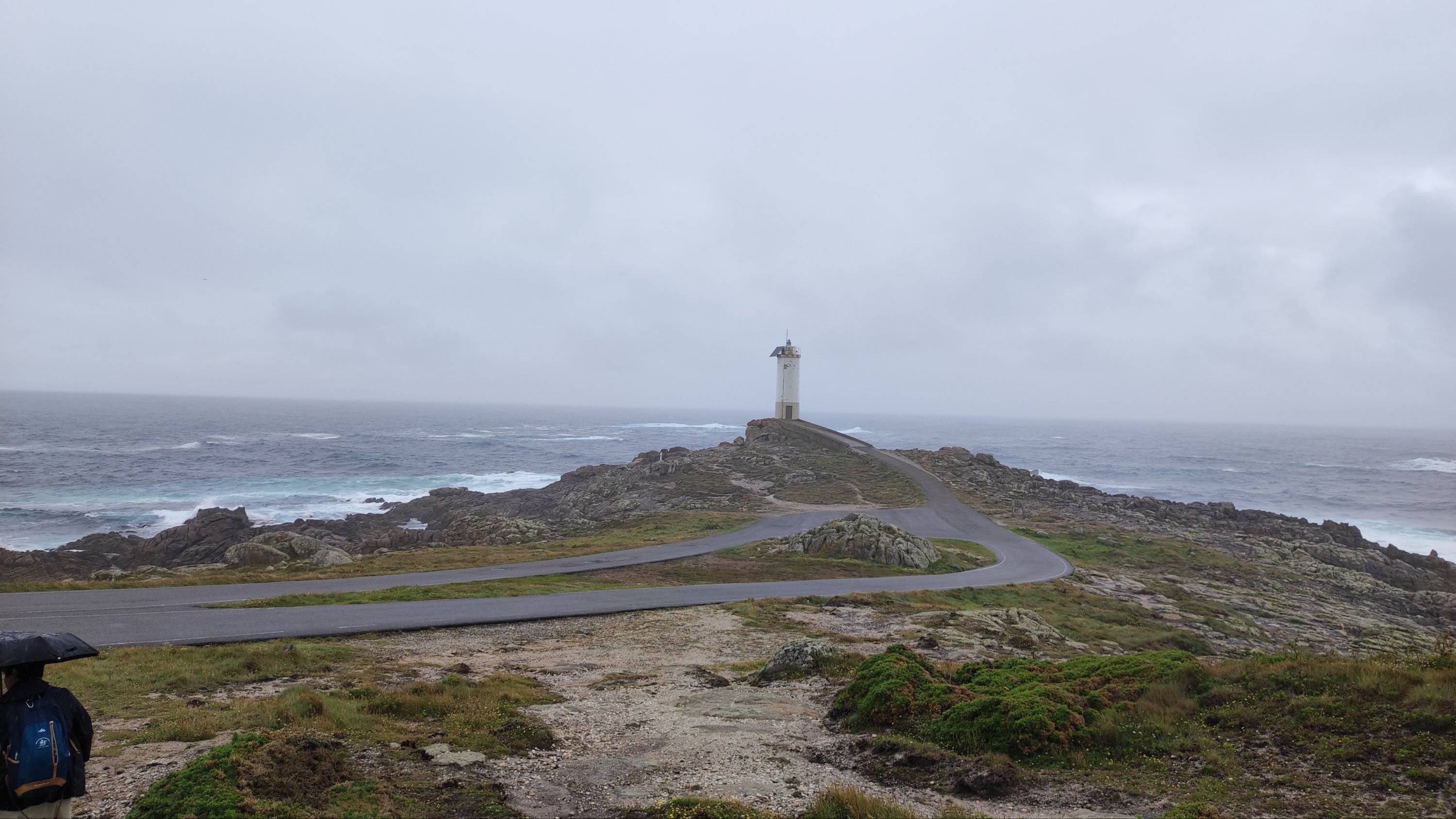 Con el faro a la vista escogemos unas piedras confortable. y nos comemos los bocadillos aprovechando que no llueve. Timing perfecto, nada más terminar comienza a chispear de nuevo. Nos hacemos las fotos de rigor en el faro y emprendemos la marcha hacia Porto do Corme bajo un franco aguacero. Siguiendo las marcas verdes, es decir por las rocas, pasamos por varios acantilados azotados por la tormenta. El camino desemboca nuevamente en la carretera del faro por la que hacemos cómodamente el ultimo kilometro y medio hasta llegar a Porto do Corme sobre las cuatro de la tarde. Pasamos por la estatua a los percebeiros y tomamos un cafe en la plaza mientras esperamos a Jose Luis.