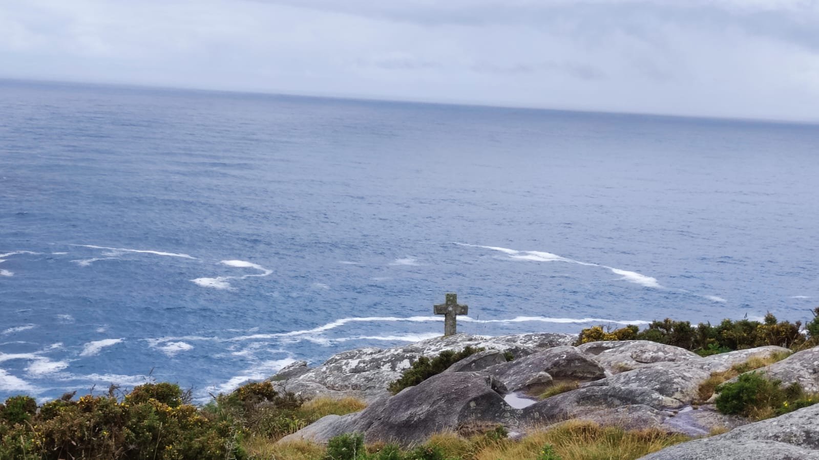 El sendero está bastante despejado y avanzamos a buen paso hasta el puerto y la playa de Santa Maríña. Nada más pasar la playa el camino se adentra hacia el interior y comienza el ascenso hacia el alto del monte Meán, punto en el que nos encontramos con Hulla, un sueco que va hasta Finisterre para volver a Santiago por el epílogo. Tras unos minutos de charla proseguimos el ascenso cada uno a su ritmo. El camino pasa por una zona calcinada por un antiguo incendio y el avance se hace dificultoso, no tanto como el descenso hacia la bonita playa de Barda y su ensenada.