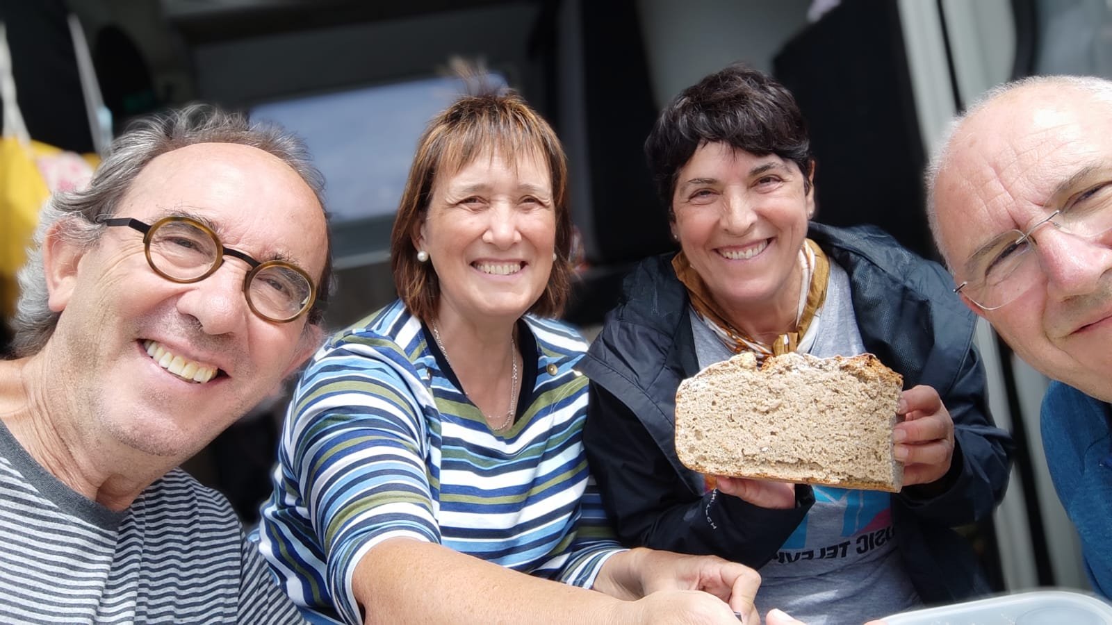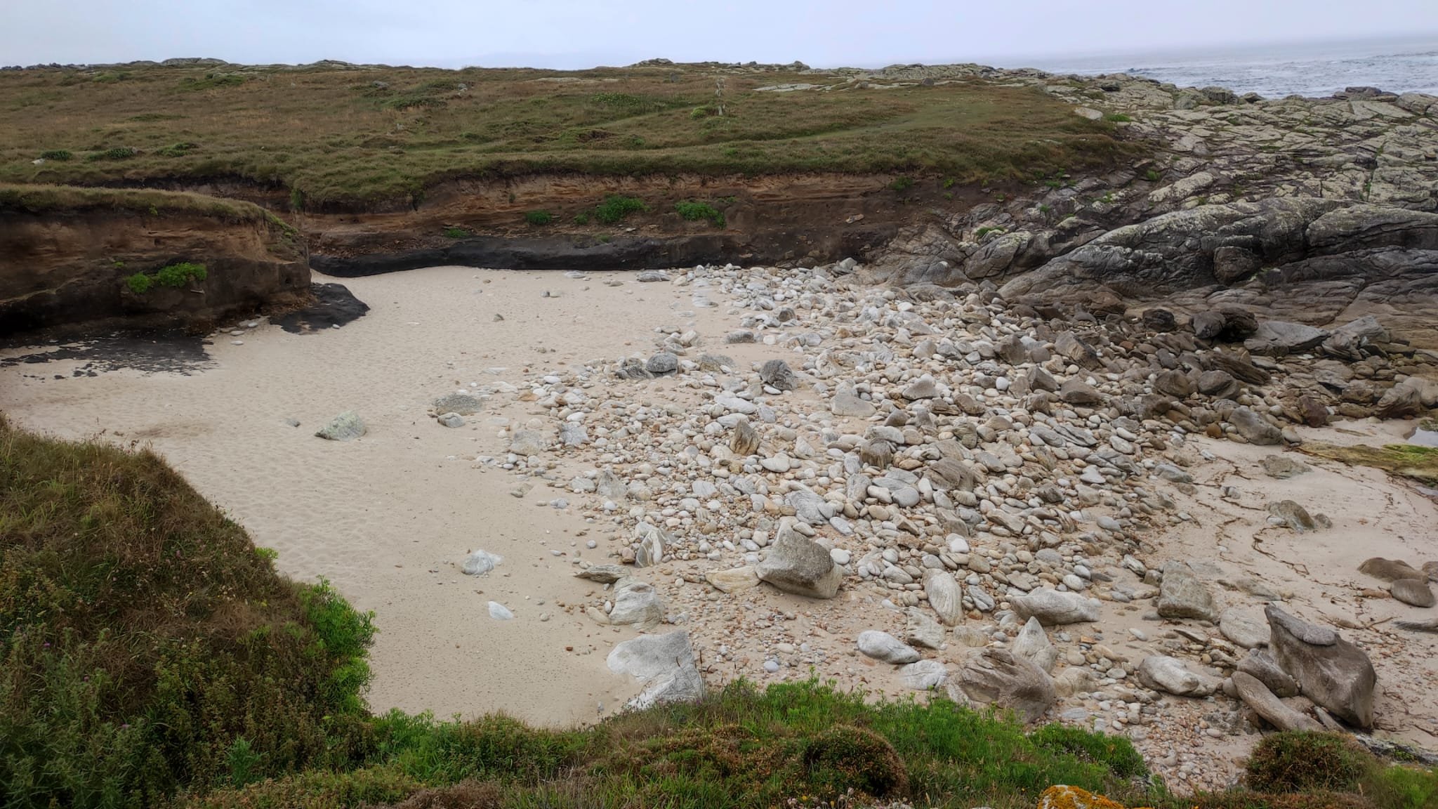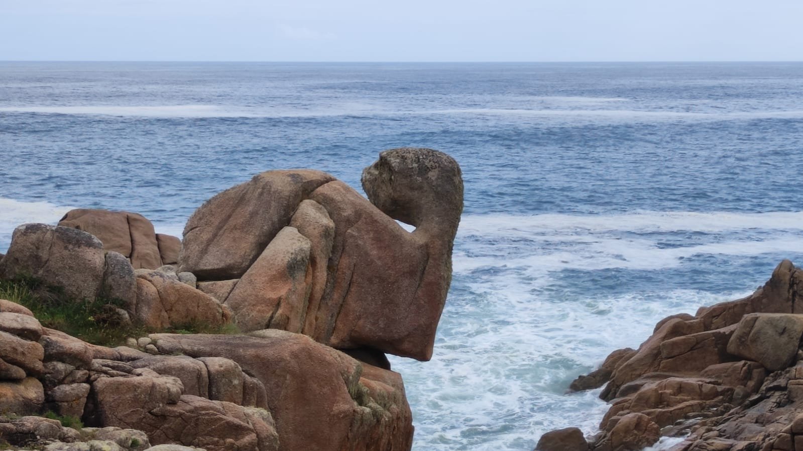Una playa casi virgen con cuatro barcas y unas casetas de aperos. El camino vuelve a los grandes bloques de piedra con formas caprichosas. El tramo, y nuestra etapa finalizan en Porto de Santa Mariña. El acceso se hace por la playa saltando por encima de grandes cantos rodados. Llegamos al Porto con nuestros amigos Juantxo y Rosa con los que comemos opiparamente en su furgoneta.