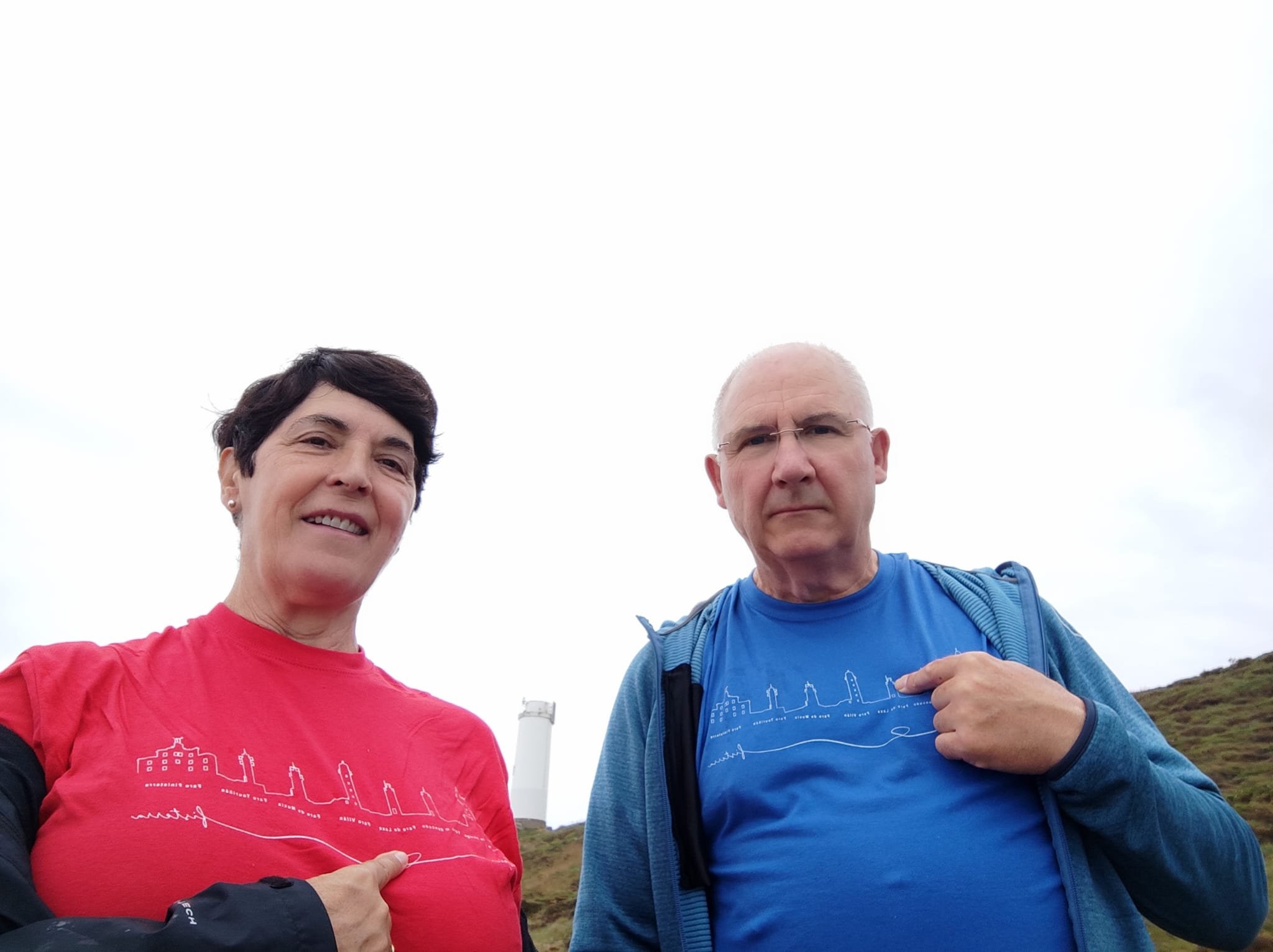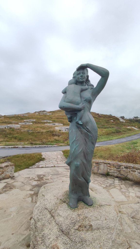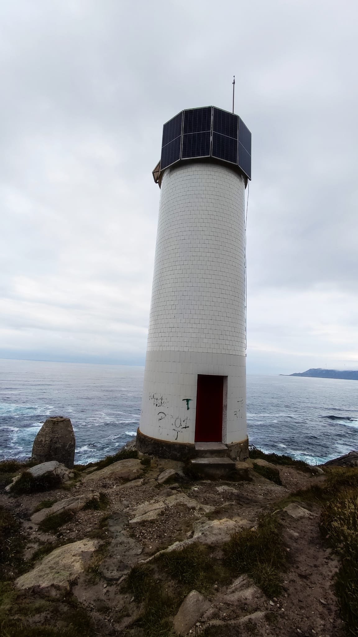 Casi sin darnos cuenta llegamos al faro, un cilindro blanco cubierto de azulejos blancos. Cerca del faro hay una escultura homenaje a los hombres de la mar. Las vistas, a pesar de la niebla y el cielo encapotado, impresionantes: desde el faro de O Roncudo, Porto Corme, Balarės, al otro lado el camino que nos queda por recorrer.