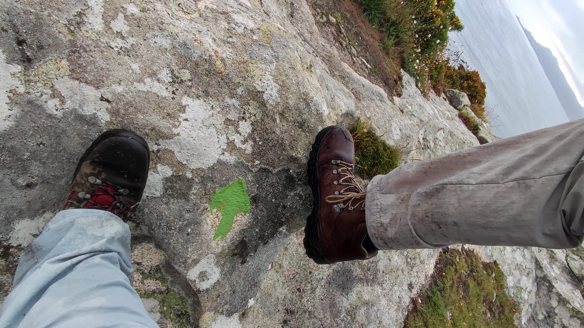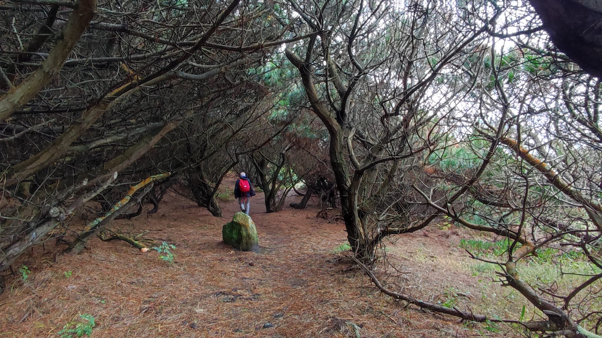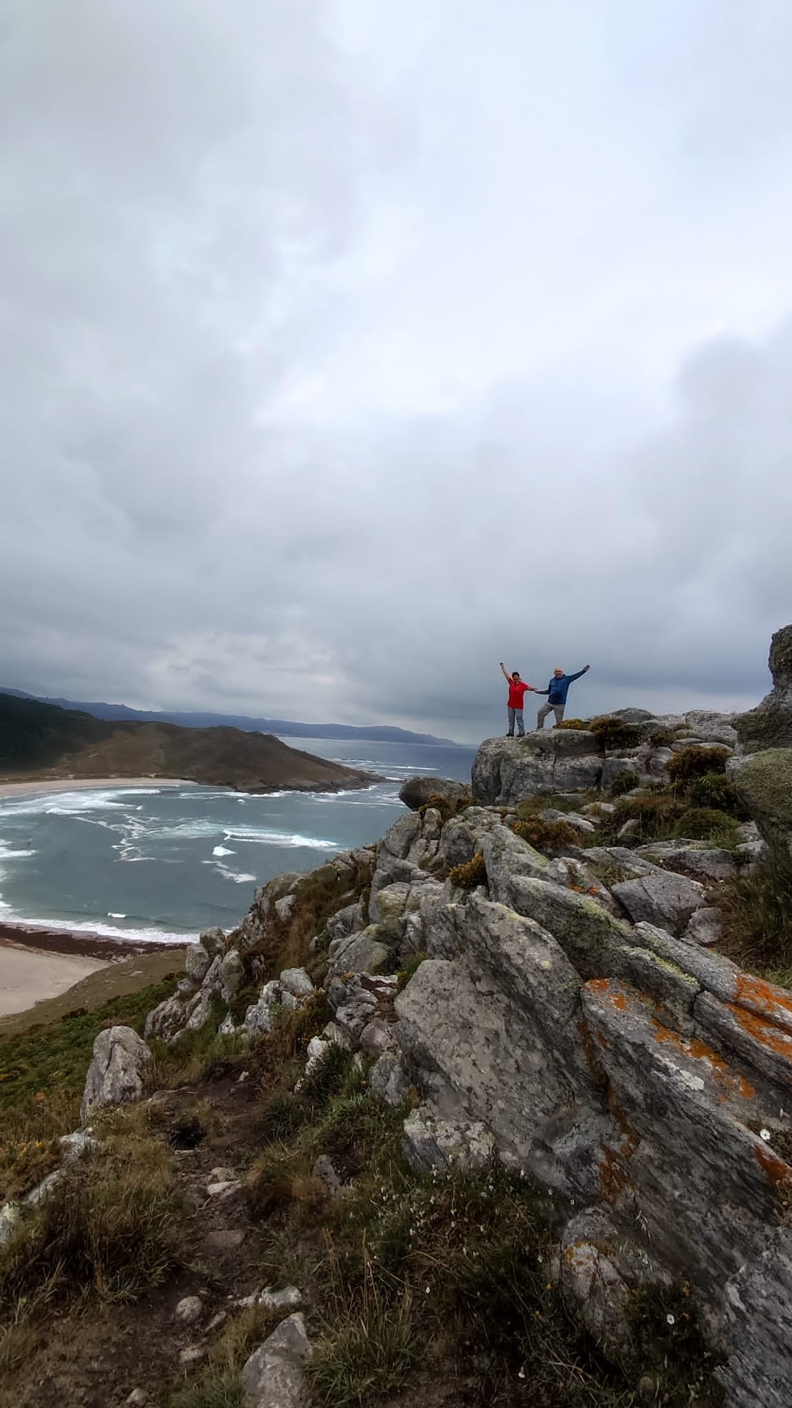 Continuamos el recorrido y pasamos por la Furna da Espuma, con la marea alta el batir de mar hace una espesa espuma, la playa de Os Cristais un lugar en el que se arrojaban botellas y otros recipientes y el mar los devuelve pulidos. El camino bordea el cementerio y se introduce en un Helechal de más de un metro de alto que con la lluvia de la noche nos deja completamente empapados. Asi alcanzamos la ensenada da Baleeira, nos dirigimos por un estrecho sendero hacia la Punta do Castro y nos desviamos a la izquierda para subir al Peñón de Soesto, máxima elevación de la etapa. Desde la cima otra panorámica impresionante: hacia atrás el camino recorrido hoy por el Monte da Insua a la izquierda la playa de Soesto y la punta de Catasol. En la cima nos encontramos con María y Laura que comenzaron el camino de los faros en Malpica y que hoy lo dejaban por compromisos académicos.