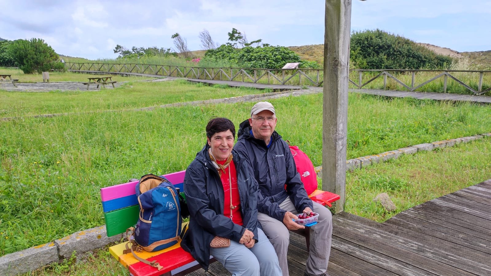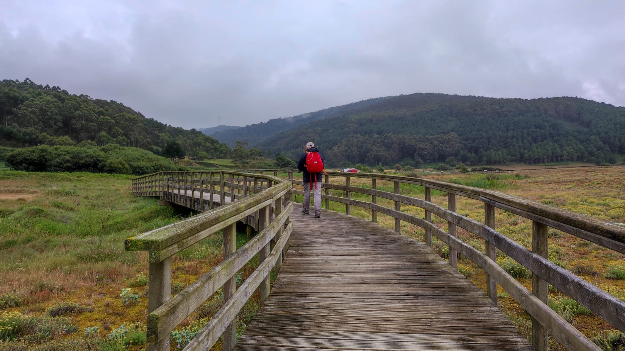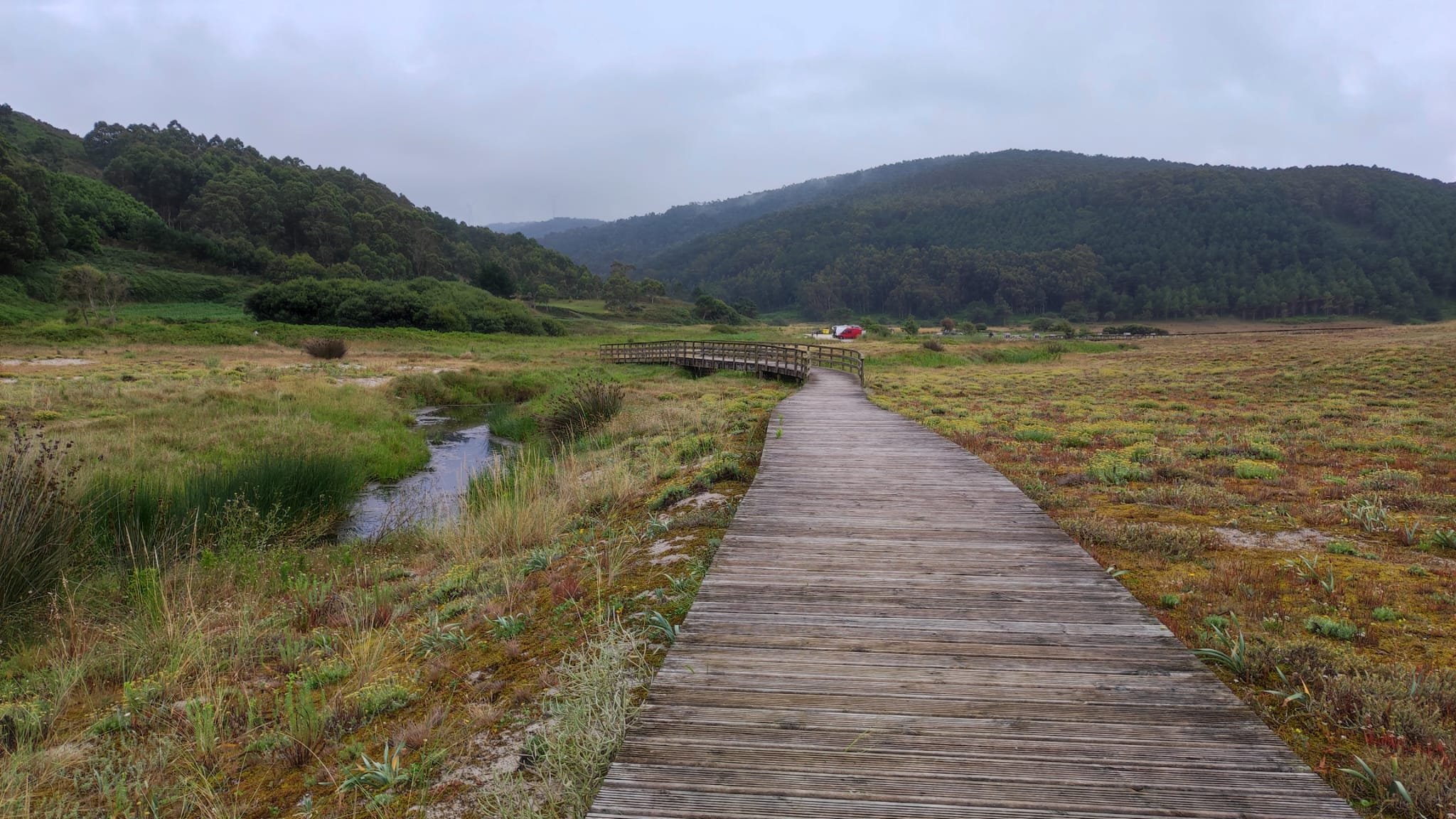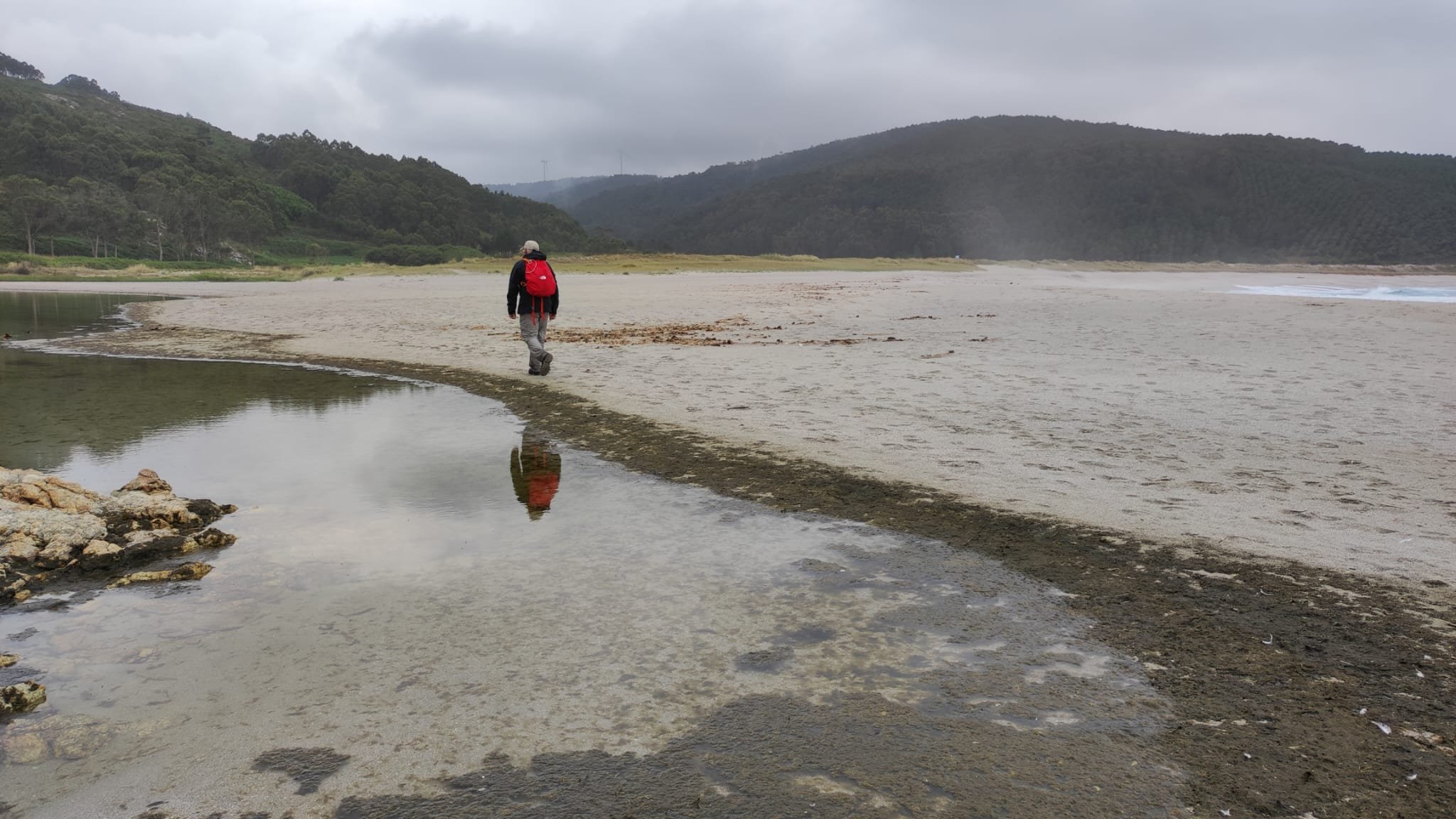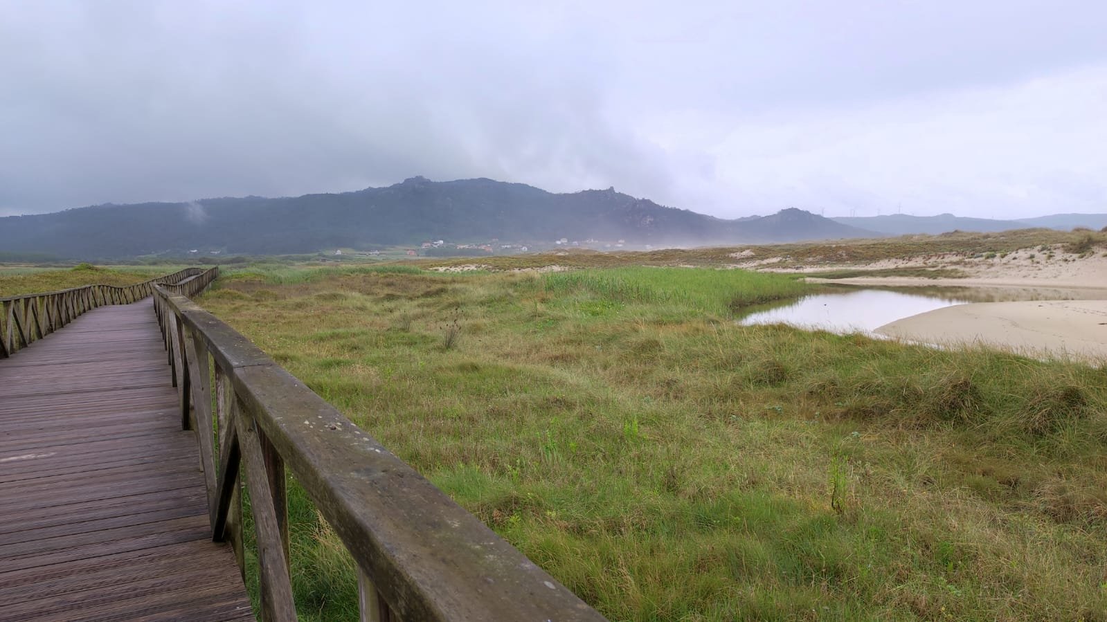 Tras un descenso muy resbaladizo llegamos a la playa de Soesto. Cruzamos un riachuelo que desemboca en la misma playa y nos dirigimos a las dunas por una amplia pasarela que lleva hasta la playa y laguna de Traba.