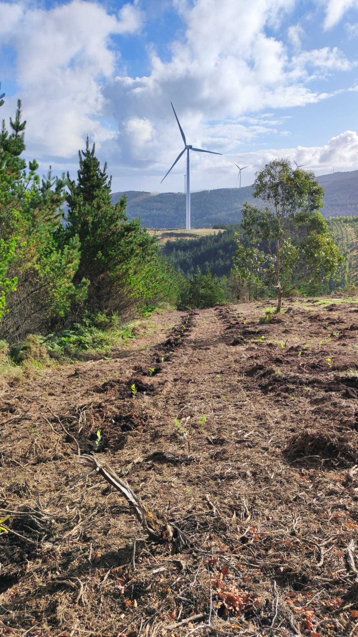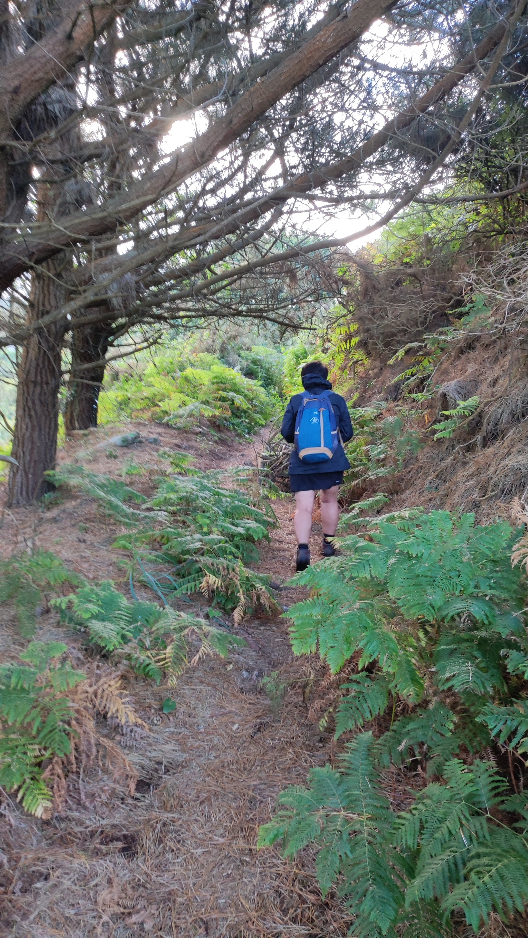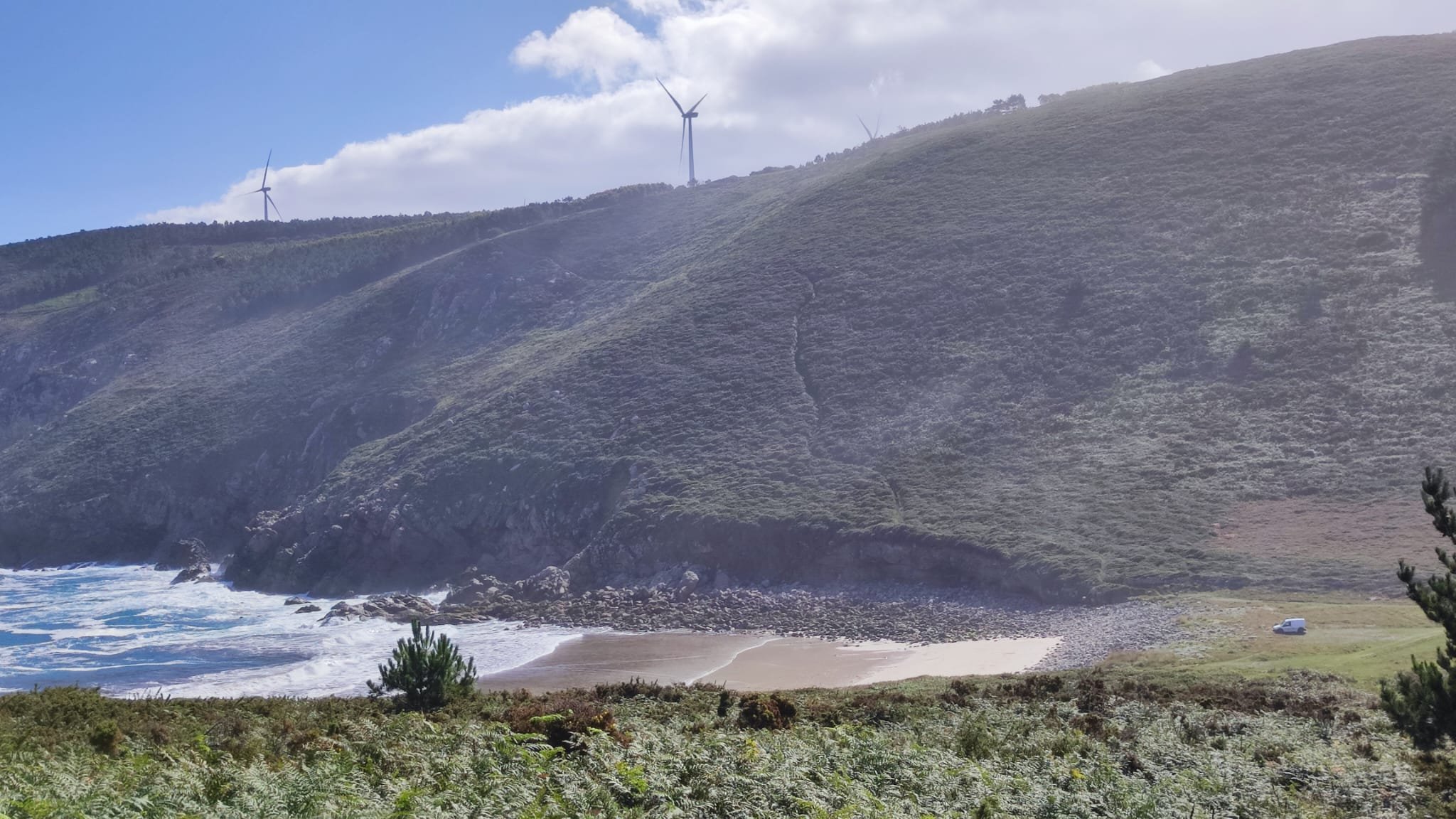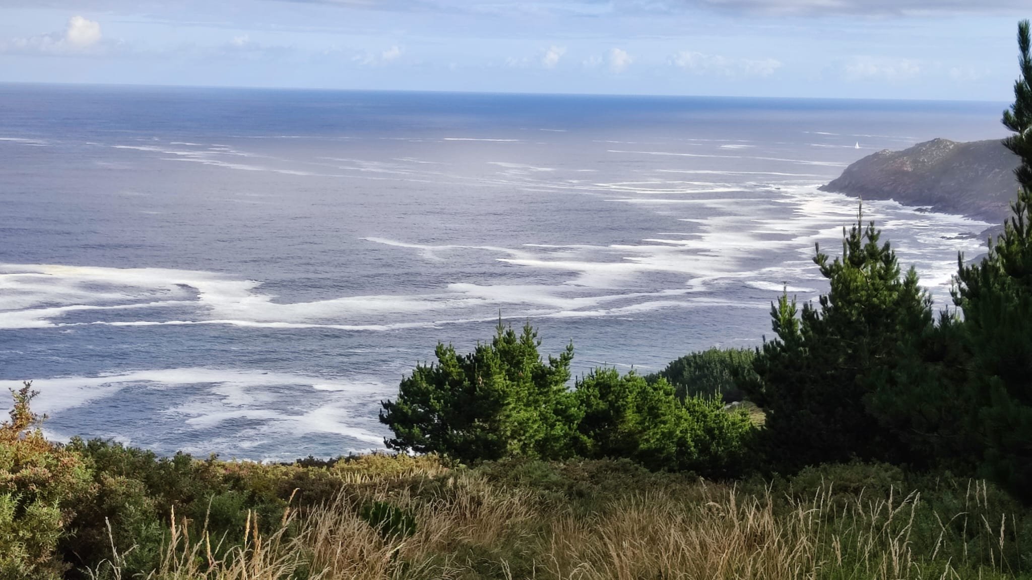 Después del tramo de asfalto nos desviamos a la derecha por una pista rural ascendente hasta un mirador que se ha quedado sin vistas por el crecimiento de un pinar que tenía delante. Continuamos por ese camino hasta la aldea de Talon, clásica aldea del rural gallego, y un poco más adelante la playa de Nemiña llena de surfistas.
