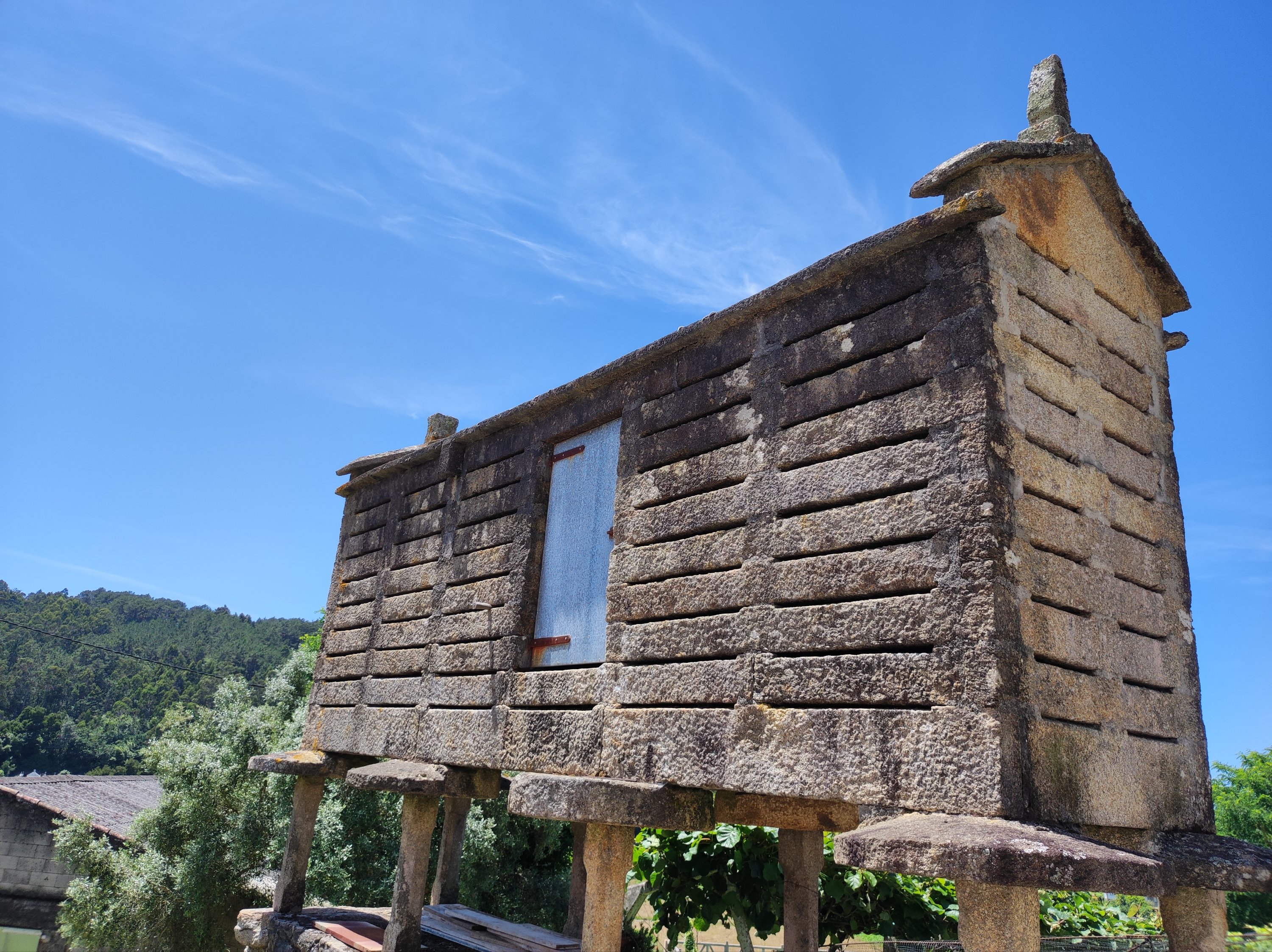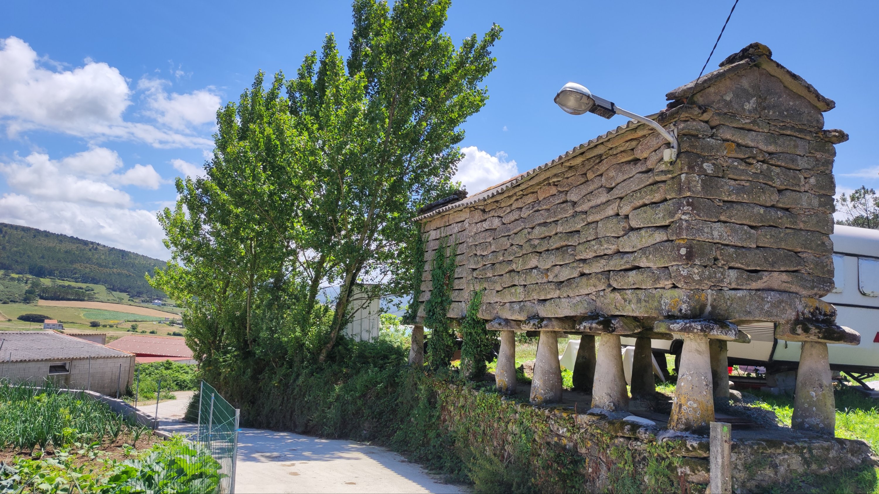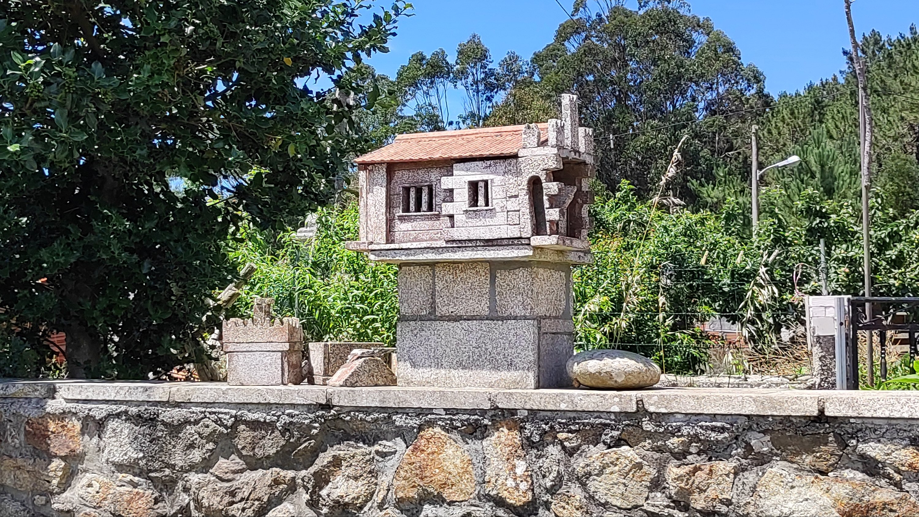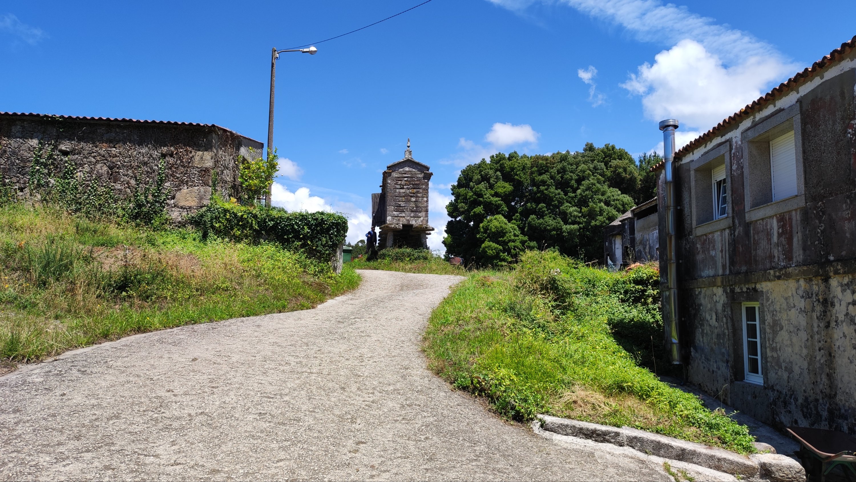 A las 8 y 20 de la mañana nuestro taxista de Muxia, Jesús, nos deja a la entrada de la Aldea de Cuño, media docena de casas, otros tantos hórreos y una rulotte permanente con su buzón artesano. El pronóstico meteorológico es bastante bueno, así que nos bajamos hasta el Coido de Cuño, lleno de bolos de todos los tamaños imaginables, nos hacemos la foto de rigor ante el buzón de la rulotte y estrenamos el protector solar. El camino sigue paralelo a la línea de costa hasta llegar a un arroyo cantarín que hay que cruzar como se pueda.