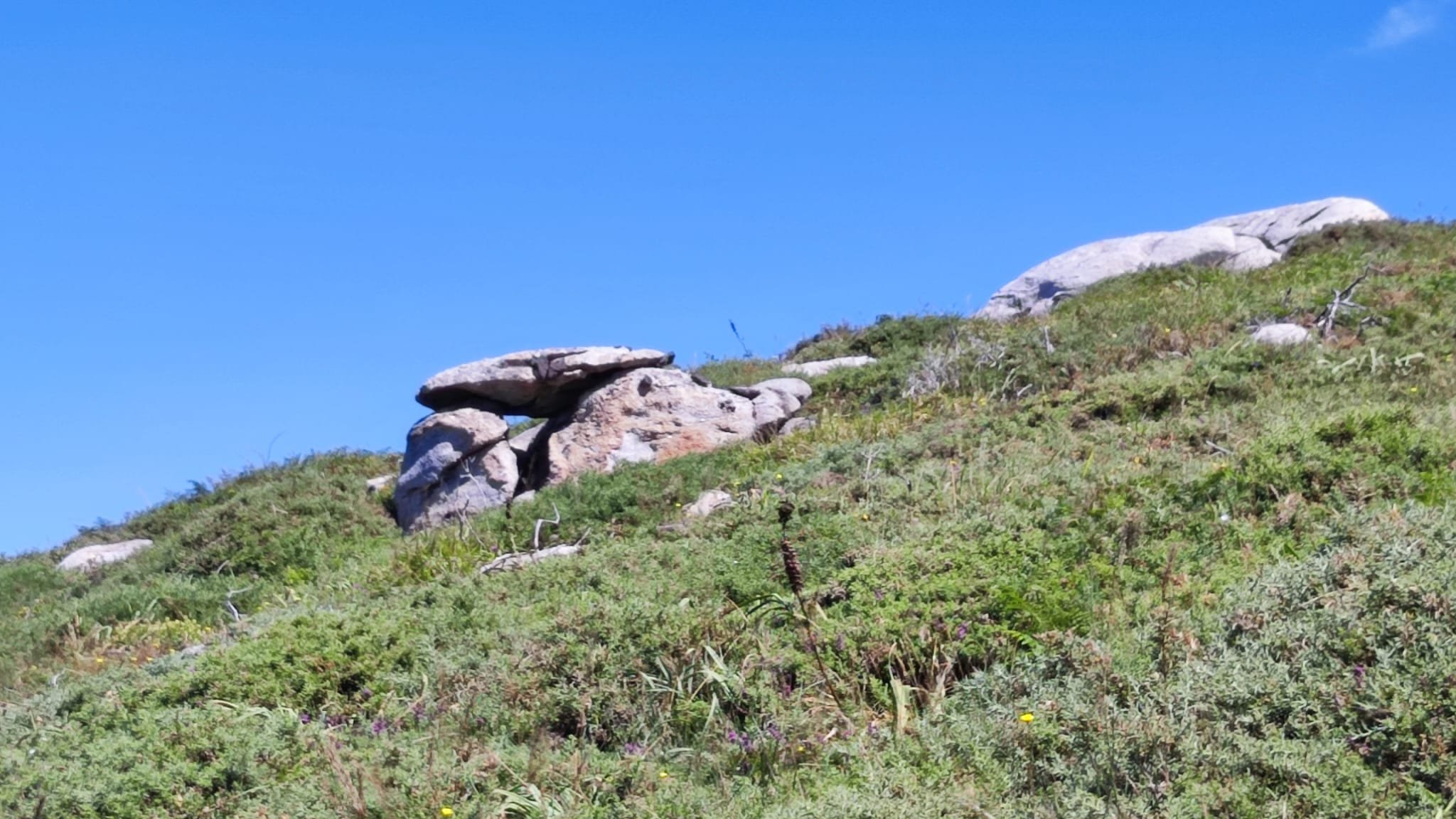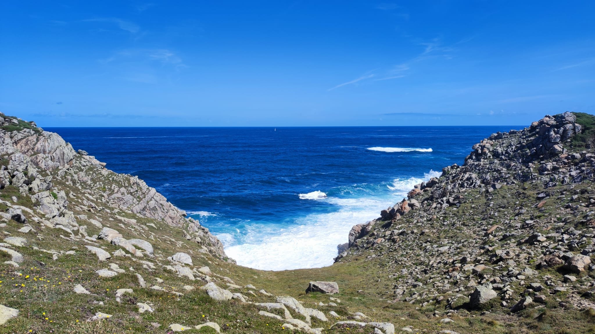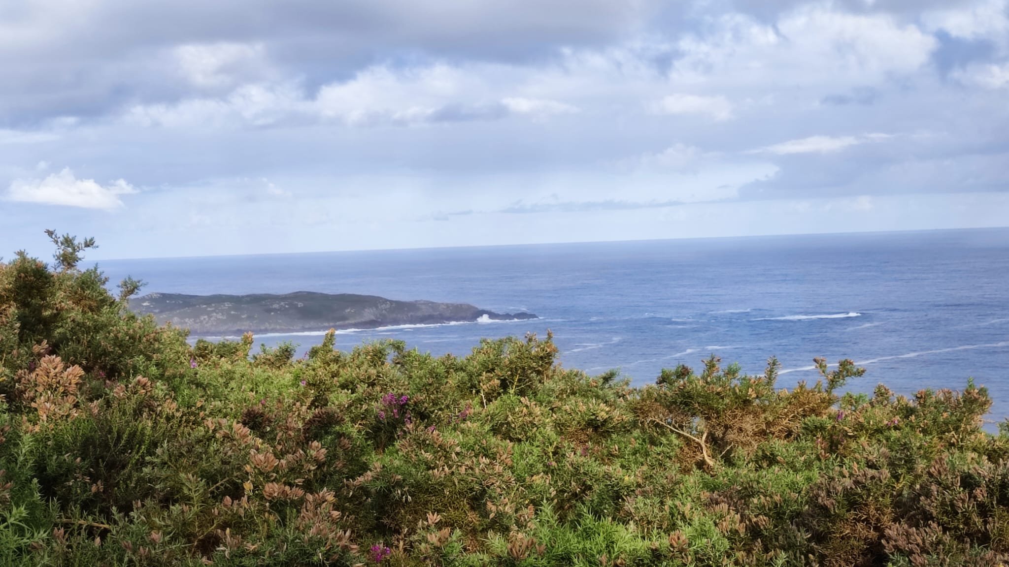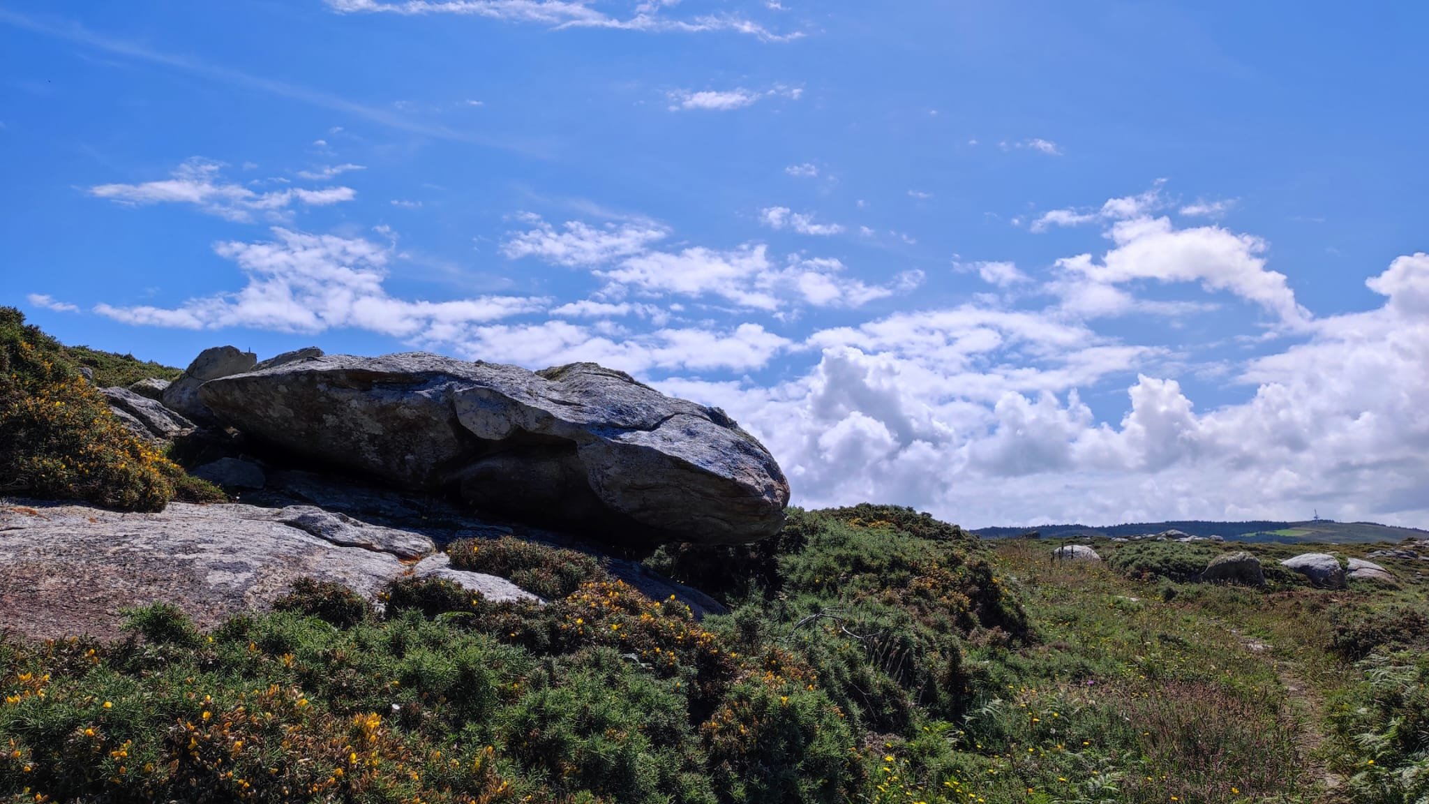 El antiguo faro Touriñan se puso en marcha en 1898 con la óptica retirada del faro Vilan. El actual faro es de 1982 y es una esbelta torre cilíndrica de 11 metros. Nos sentamos en un cómodo banco ante el faro y nos tomamos la fruta seca y fresca mientras van llegando personas en coche para ver la torre. Nos levantamos del cómodo banco y tomamos el camino a la izquierda de faro desde el que podemos ver la Illa do Castelo o Herbosa, punto más occidental de la Península. El camino continúa bordeando el cabo hasta el Coido de Touriñan repleto de bolos de todos los tamaños hasta regresar a la carretera del principio.