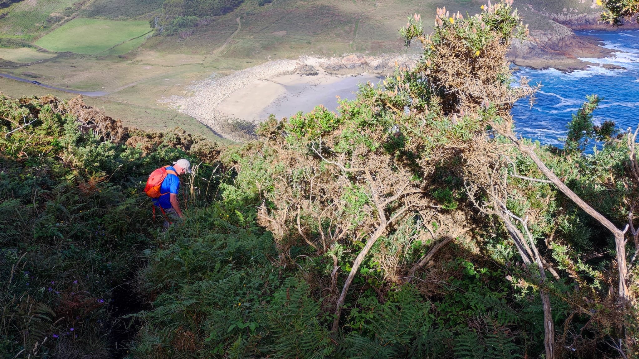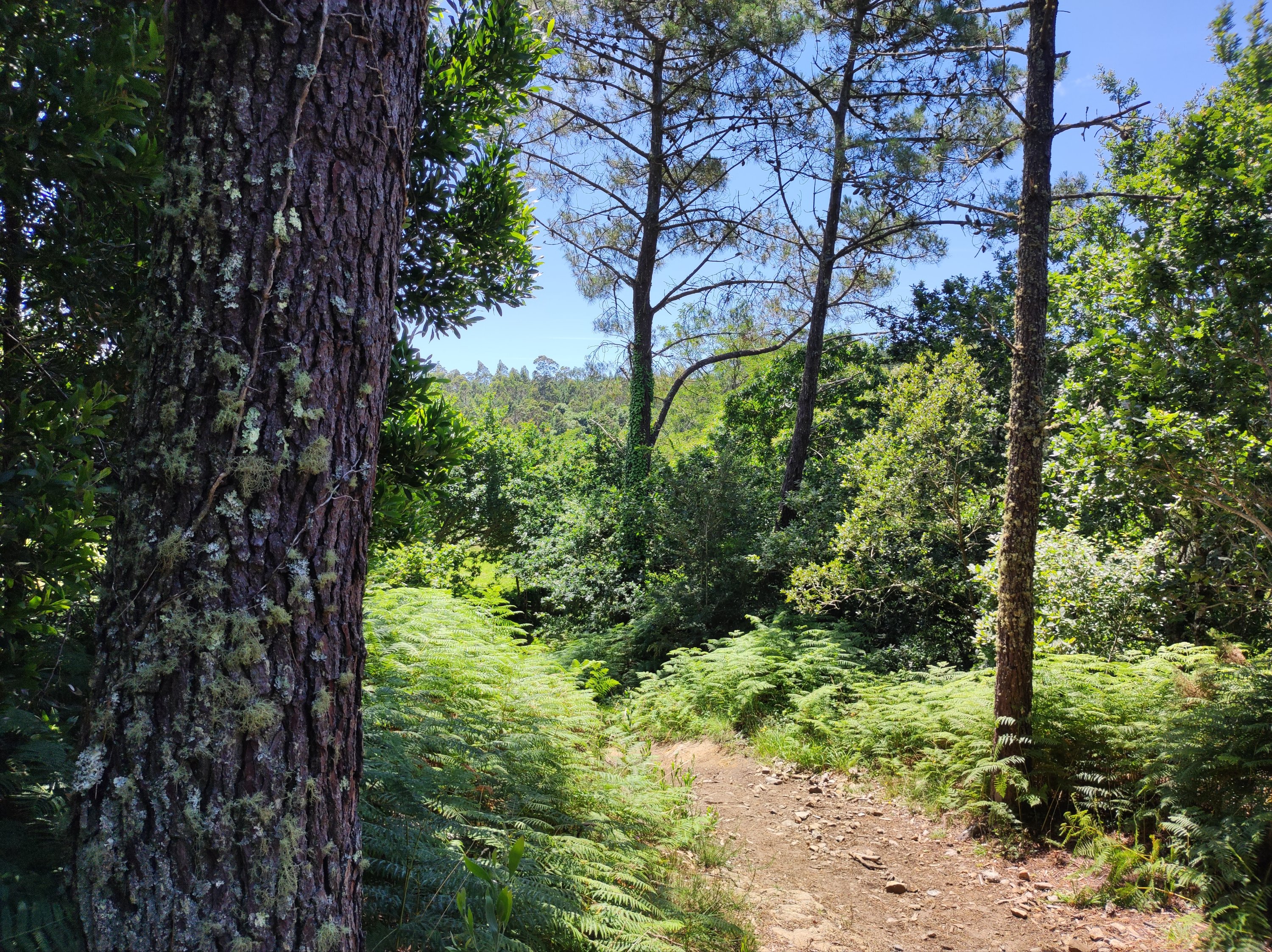 Nada más cruzar el arroyo comienza la subida al Monte Pedrouzo, de 262 m de altura que se sube en dos tramos. El primero por un denso bosque galería paralelo al arroyo que desemboca en una pista forestal junto a un rodal de eucaliptos recién plantados. El segundo tramo de subida, un poco más suave, transcurre entre dos muretes cargados de vegetación que se termina en una meseta con un amontonamiento de rocas de gran tamaño. El descenso hacia la playa Moreira también se hace en dos tramos unidos por un sendero llano, y hay que hacerlos con mucha precaución tanto por el desnivel como por el estado del sendero, los toxos de los lados (no hay donde agarrarse) y el riesgo de caída.