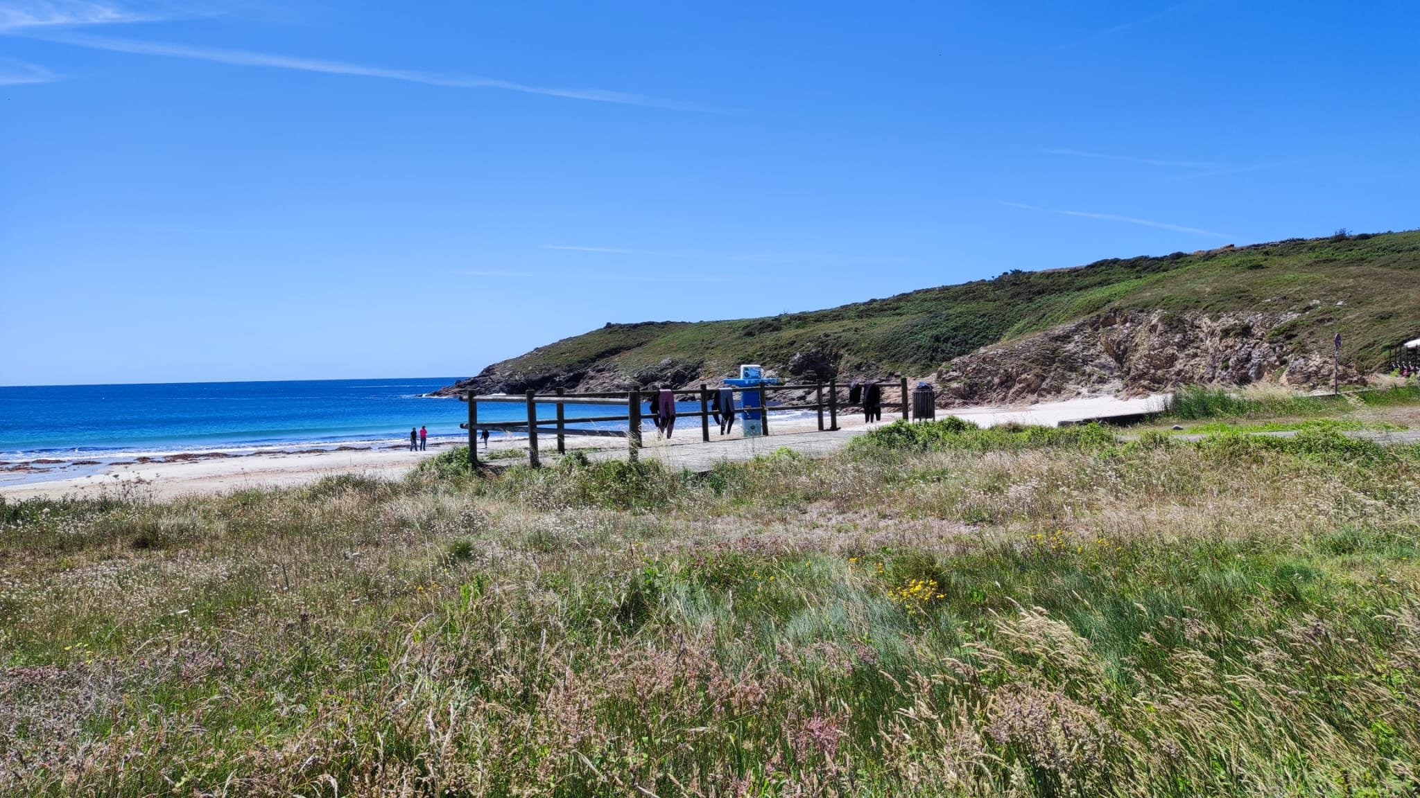 La playa de Moreira tiene una primera línea de bolos y luego una arena finísima. Tiene acceso por un carril asfaltado y para continuar nuestro camino hacia el faro Touriñan tenemos que cruzar un arroyo por donde podemos. Hay una pequeña cuesta que termina en una pista forestal y luego un tramo de asfalto que pasa por las aldeas de Touriñan y Campos para luego tomar un desvío a la derecha por un estrecho carril agrícola que bordea toda la punta del cabo. El carril deviene en estrecho sendero con los toxos más pinchantes de todo el camino. Este sendero nos acerca a los acantilados de Gaivoteira contra los que se estrella el Atlántico a toda potencia. Continuamos y vemos el faro y la casa de los fareros en pocos metros.