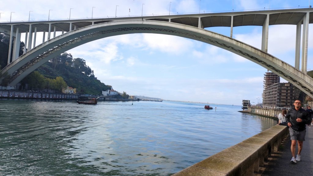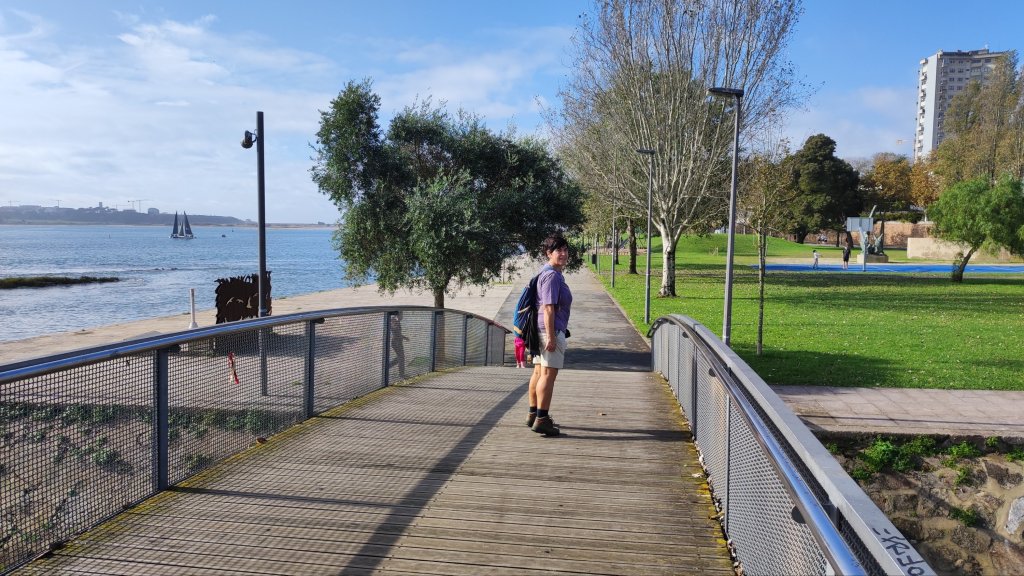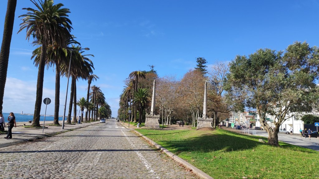 Caminamos por el viaducto do Cais das pedras, no apto para vertiginosos, mientras aparece al fondo el puente da Arrábida un colosal arco de hormigón armado. Por el camino nos encontramos puentecillos, esculturas y fuentes más o menos míticas y reconocibles. Acompañamos al Duero hasta su desembocadura en el Atlántico siempre bravo. Poco antes de que esto ocurra, dos obeliscos nos dan paso al Jardim do Passeio Alegre, un formidable parque flanqueado por dos hileras de palmeras con diversos elementos, kiosko de música, observatorio de aves, etc. que hacen las delicias de todos los que pasan. No falta un atento castañero que nos ofrece su sabrosa mercancía junto al fuerte de Sao Joao Baptista, fortificación abaluartada que preservaba la entrada fluvial por el Duero.