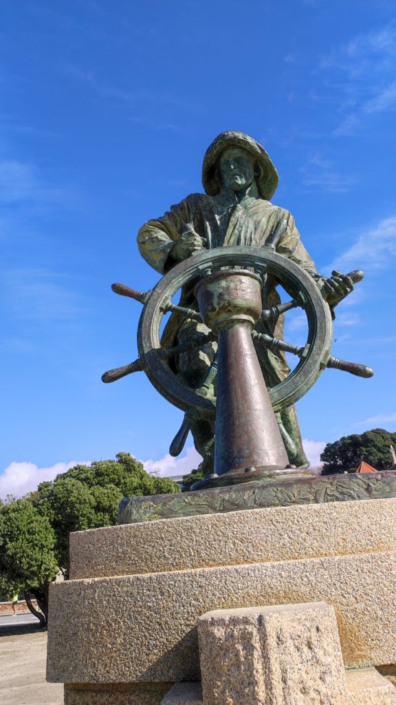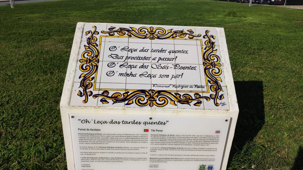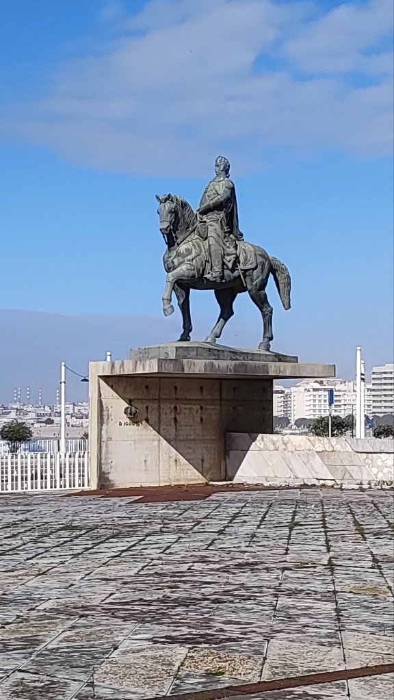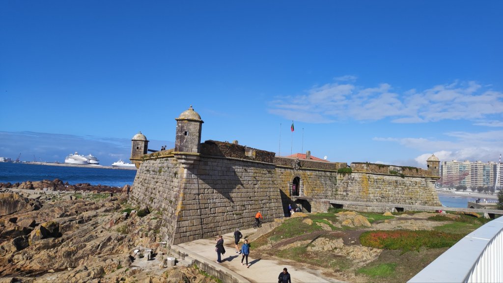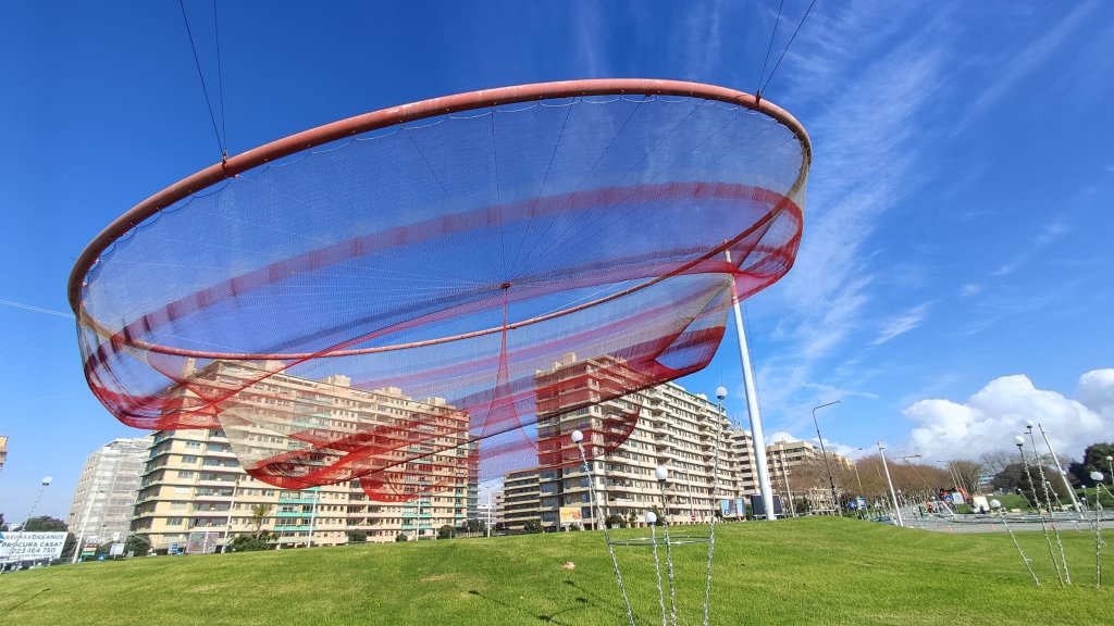 Continuamos nuestro caminar con el Atlántico a nuestra izquierda y pasamos bajo la hermosísima Pérgola da Foz de inicios del siglo XX, un precioso balcón sobre la playa do Molhe y pórtico de un parque con las esculturas del salvavidas, homenaje a los que salían a salvar vidas en medio de la tempestad y el Hombre del timón, escultura que rinde homenaje a los pescadores. Finalmente llegamos a una rotonda en la que se encuentra el Fuerte de San Francisco Javier y la estatua ecuestre de D. Joao VI. Esta rotonda marca el final de Oporto, también es la meta de la maratón y el comienzo de la playa de Matosinhos con una instalación, la Anémona, una red roja muy colorida.