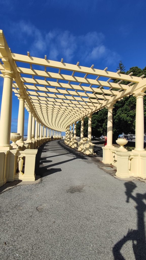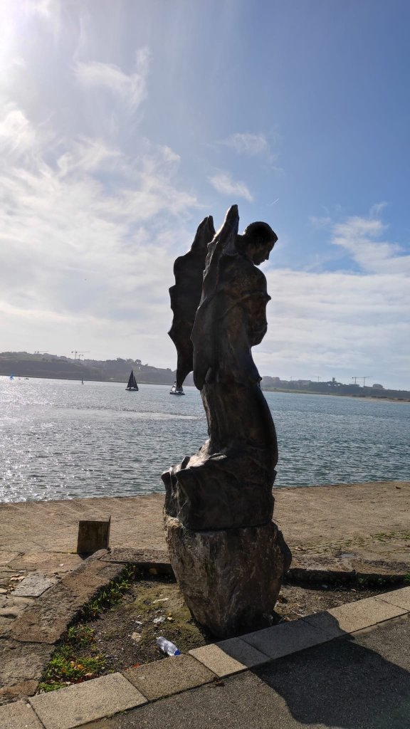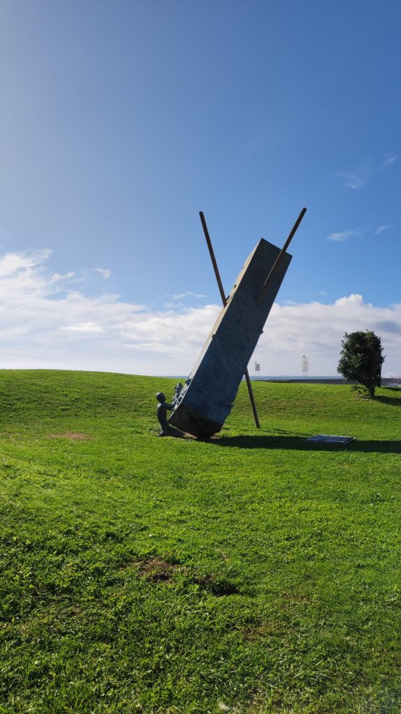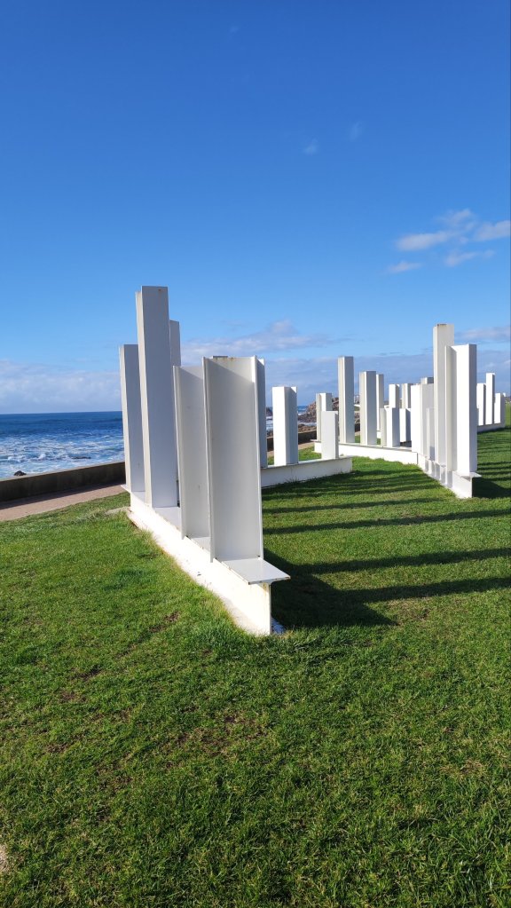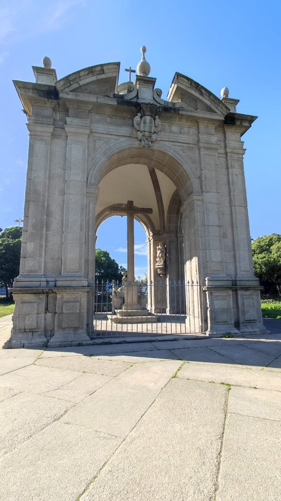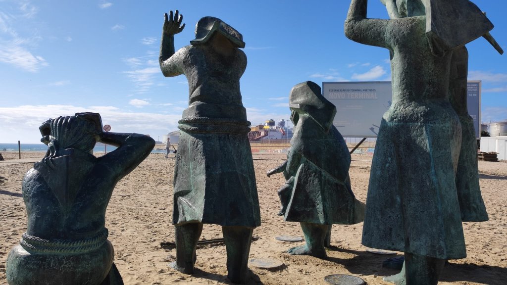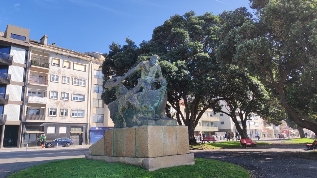Continuamos paralelos a la playa, llena de paseantes esperando la hora de comer y llegamos al punto de información del Camino Portugués, cerrado en esta época, y un grupo escultórico que recuerda los numerosos naufragios acontecidos en esta costa. Muy cerca está el Padrao do Bom Jesus de Matosinhos, un pórtico abovedado con una cruz en su interior que da paso a un paseo lleno de asadores de pescado al aire libre y que está casi abarrotado pese a lo temprano de la hora.