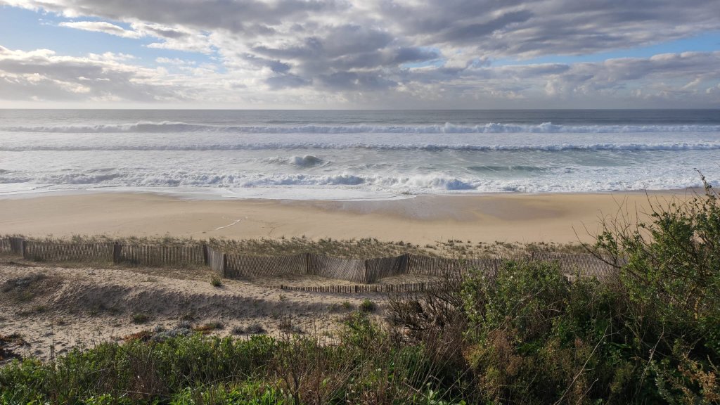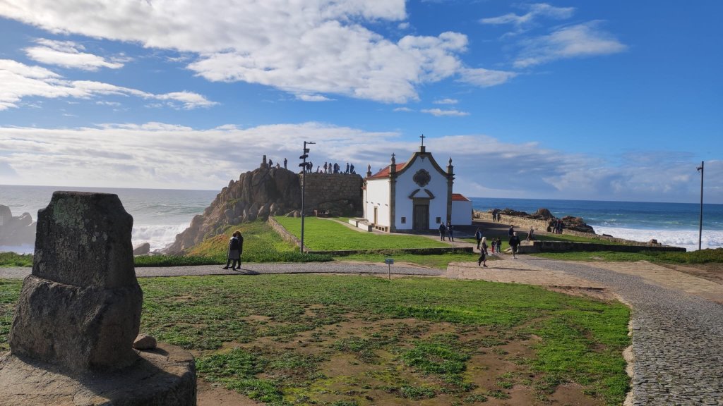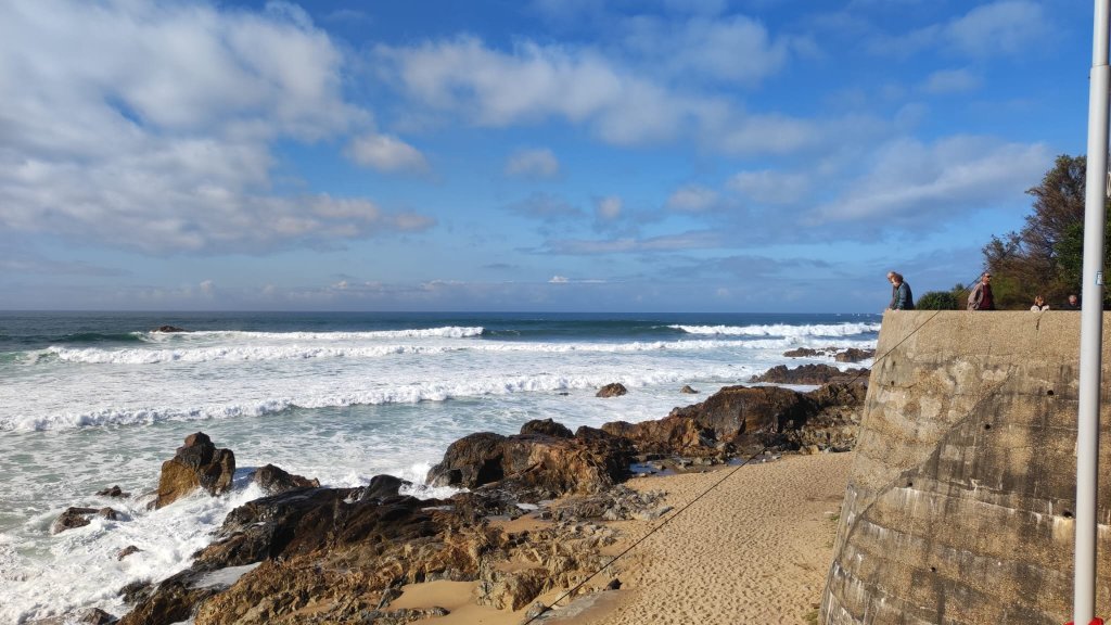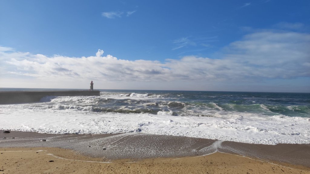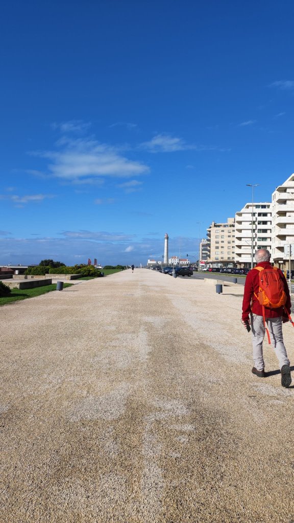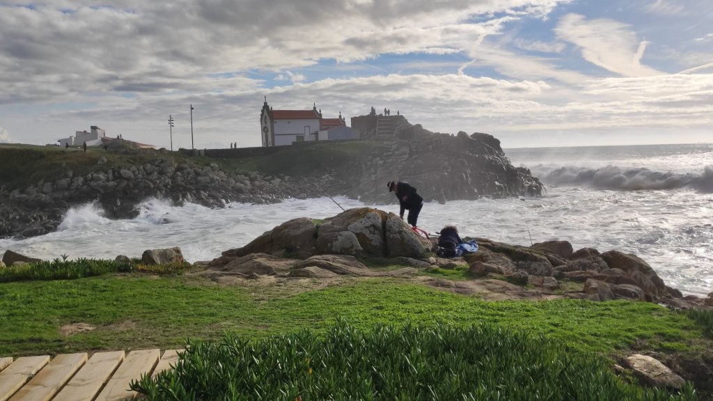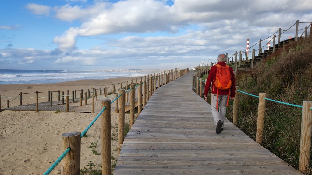 Salvamos el río Leça sobre la plataforma de un puente levadizo, cruzamos Leça por el interior hasta llegar de nuevo a un amplio paseo marítimo con el imponente faro de Leça al fondo, una torre de 46 m de alto rematada con una linterna circular con una barandilla de color rojo. Muy cerca del faro vemos la Capela da Boa Nova, junto a un mirador sobre el Atlántico con impresionantes vistas que impresionan por el oleaje y el imponente chirrido de los cantos que ruedan en la bajamar. En este punto, sólo nos quedan 3 km y medio de pasarelas de madera que sobrevuelan una paisaje dunar impresionante. Nos sentamos en un chiringuito y tomamos un prato del día.