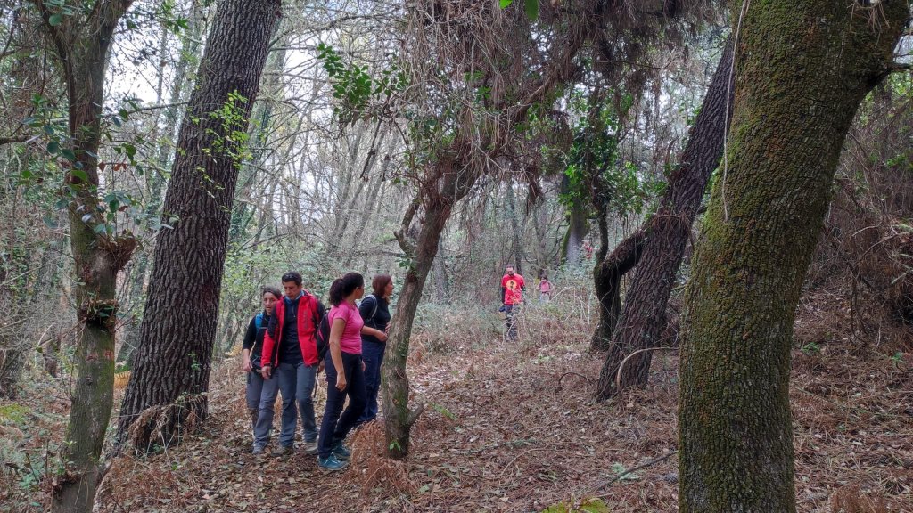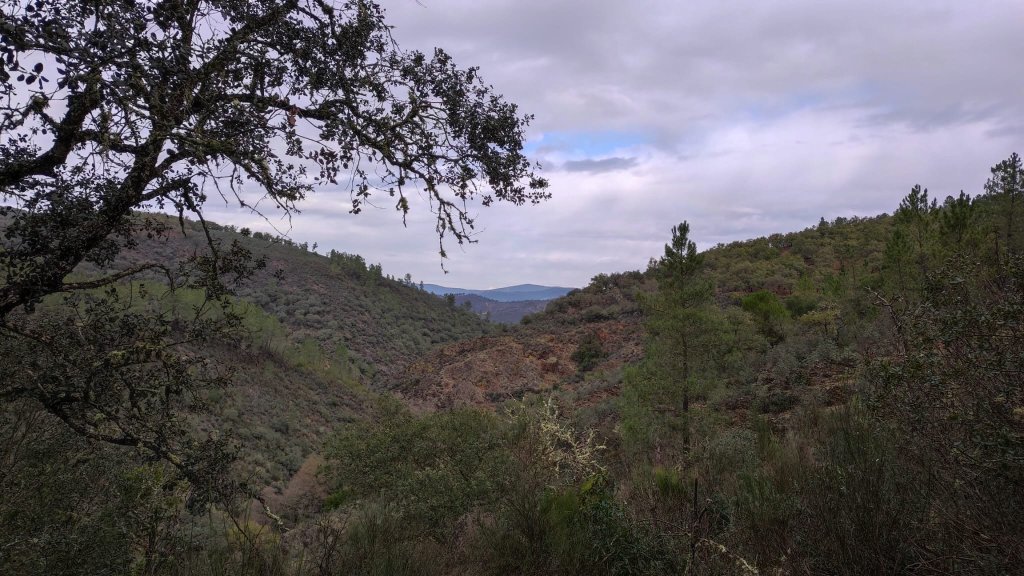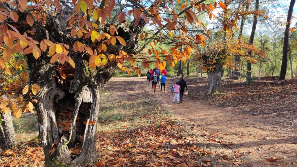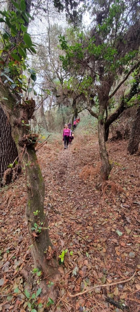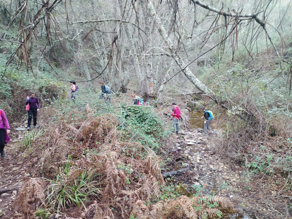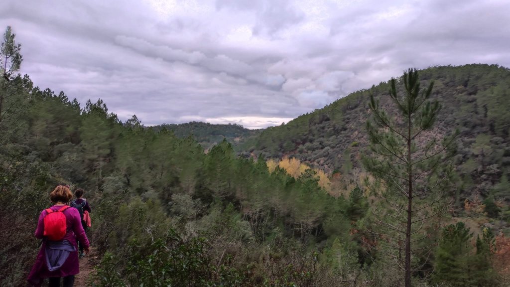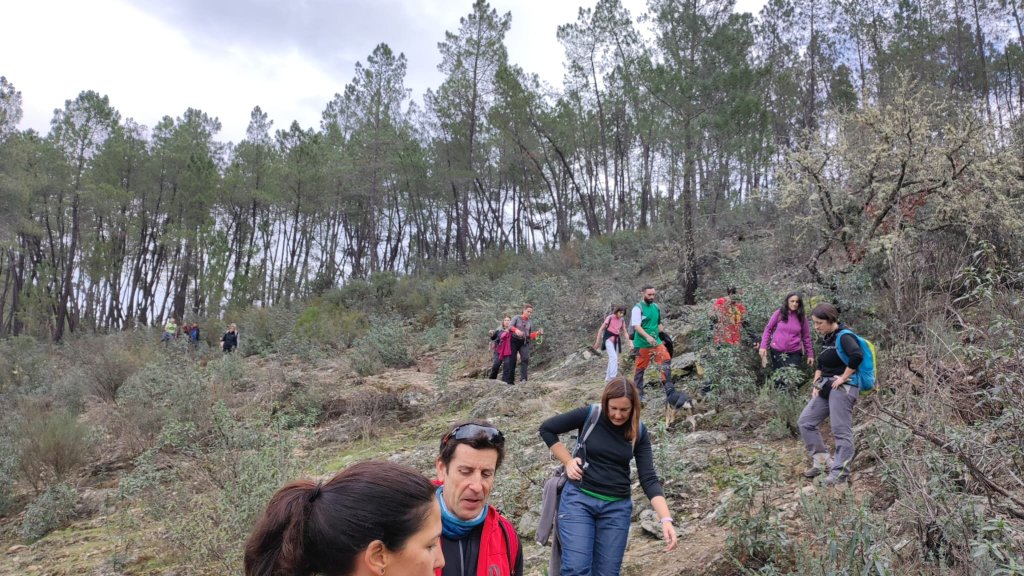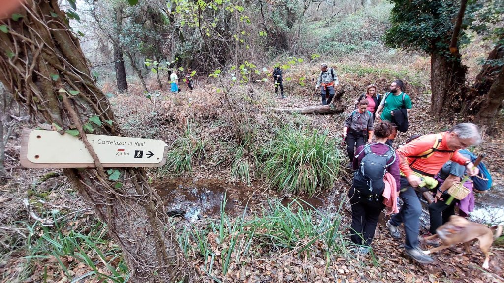 Tras unos 400 m por la carretera tomamos una bifurcación a la derecha y nos internamos en un bosque de pinos por el que, tras pasar un arroyo seco, afrontamos la subida al «techo» de la jornada, un cerrete de 721 m de altura en la que el grupo se va alargando en cuestión de minutos. Tras una parada de reagrupamiento iniciamos el descenso hacia Cortelazor junto a unos aparcamientos a la entrada del mismo. Continuamos la marcha por un camino que desciende en dirección a los lavaderos. Pasados los lavaderos comenzamos una nueva subida hasta la cota de los 650 m. en dirección al Arroyo de Valdelarco. Dejamos el camino y por una vereda señalizada pero un poco difusa descendemos para cruzar el arroyo. Iniciamos otra subida, por una senda junto a unos riscos y al pasar junto al Cortijo de la Pastora enlazamos con un camino en suave descenso hasta el Arroyo de Valdelarco. Sin cruzar el arroyo continuamos en ligera subida por una zona con algunas casas rurales.