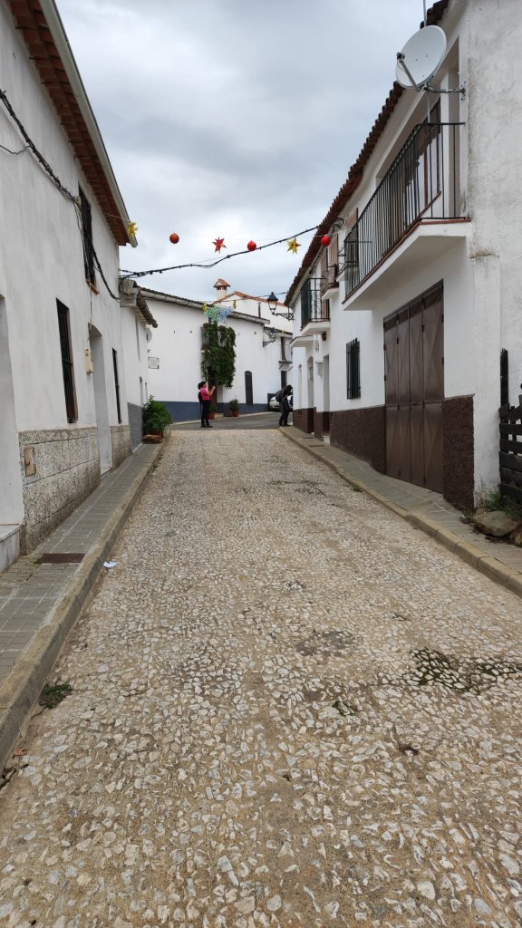 La subida termina a la entrada de Navahermosa. Callejeamos por el pueblo buscando la carretera que, en suave descenso nos llevará de vuelta al Área Recreativa. Una vez en el área recreativa, donde se disfruta de un bosquecillo de roble melojo, celebramos la asamblea con los socios del Club presentes.