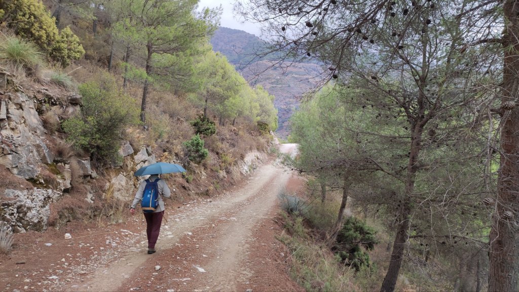 Comienza nuestra caminata junto a la la Ermita de Santa Ana, un templo sencillo que data del siglo XVI en el punto más elevado del pueblo, construida sobre los restos de una antigua fortaleza y desde la que tenemos una magnífica vista de las sierras próximas: La Maroma, el Río Turvilla y el mar al fondo. Bajamos en dirección al cementerio para llegar al paraje de Las Cuestas donde nos encontramos con los restos de dos antiguas calzadas empedradas (algunos afirman que de origen romano) que se unen a través del puente sobre el Río Turvilla también de origen romano. En la actualidad es un camino de herradura catalogado como Vía Pecuaria. Tras subir la segunda calzada nos encontramos en una pista asfaltada conocida como Camino de Renzuelas. Aproximadamente 1 km más adelante tomamos un desvío a la derecha por un camino de tierra entre casas de recreo y fincas agrícolas. Tras una fuerte subida nos encontramos en la parte más alta de la ruta y entramos a un bosque de pinos y monte bajo conocido como Los Lisos.