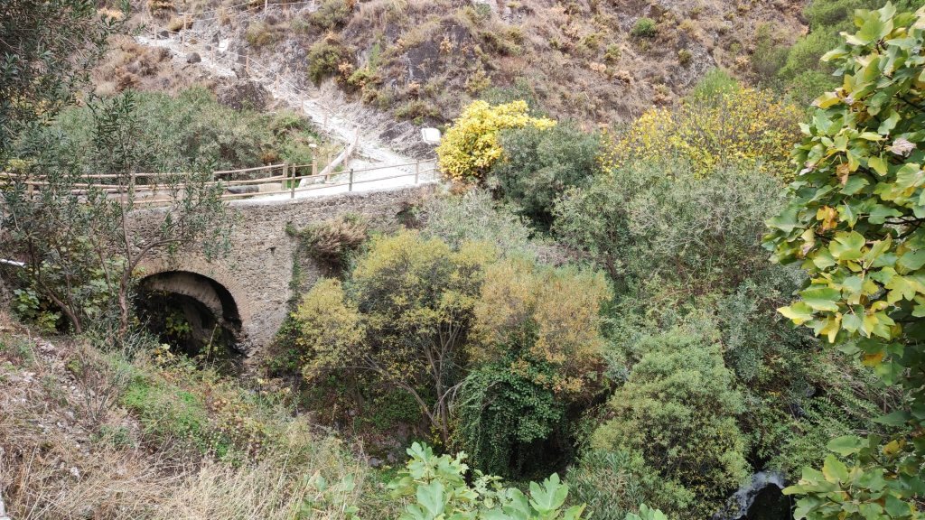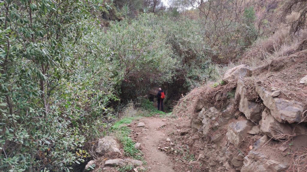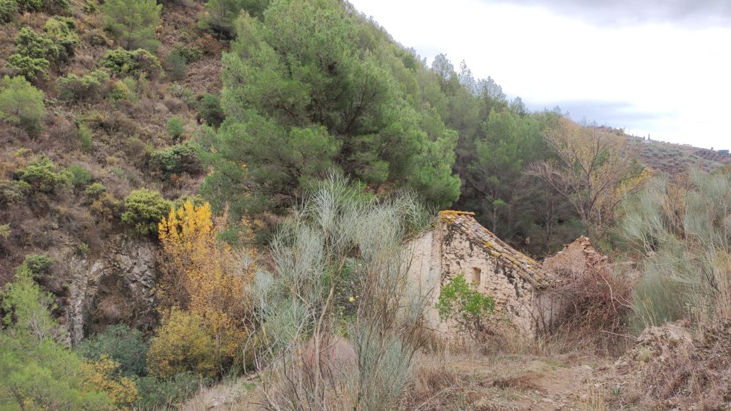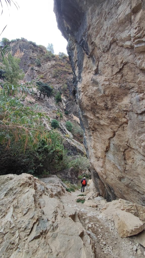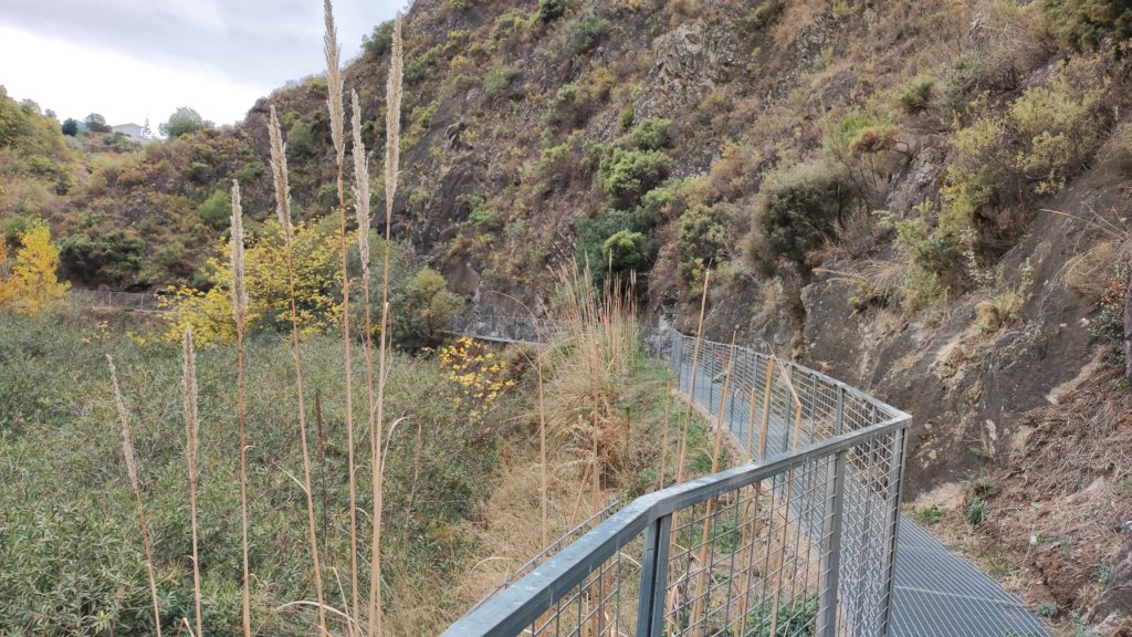 Nada más salir del bosque y entrar en una zona de olivar y aproximadamente en el km 6 de nuestro recorrido tomamos una senda a la derecha bastante difuminada por la hierba para entrar en el Sendero Los Lisos-Cruz del Muerto. Comenzamos a descender y cruzamos por primera vez el Río Cájula (en esta zona está todavía seco). El sendero es muy agradable de caminar y, como a media bajada, ya comenzamos a escuchar el rumor del agua. Nos acercamos al cauce del río junto al Cortijo de Rafaelita un antiguo molino harinero actualmente en ruinas. Desde este punto cruzaremos el río en numerosas ocasiones a través de puentes de madera en bastante buenas condiciones. El paseo es muy agradable, entre huertos, terrazas con aguacates, naranjos y limoneros. Un placer para la vista y los sentidos. Finalmente, entramos en una zona de grandes cortados, con paredes con oquedades que dan paso a un camino más amplio ya en el paraje de la Cruz del Muerto y junto a otro molino.