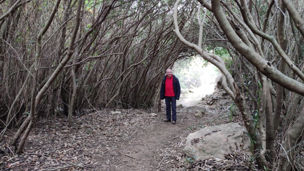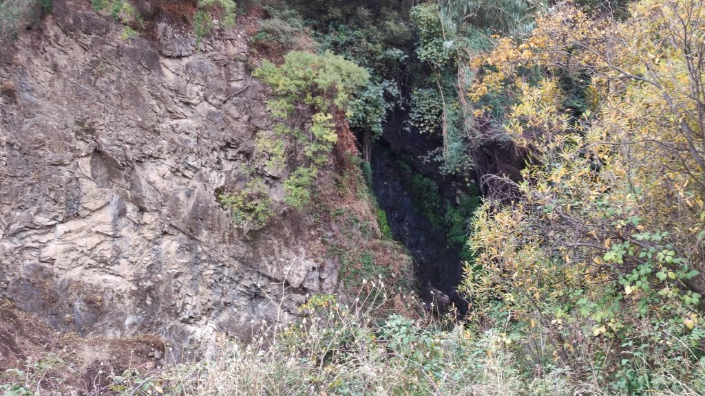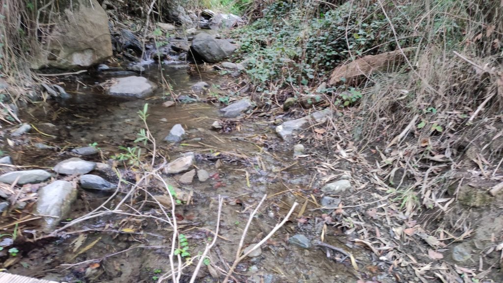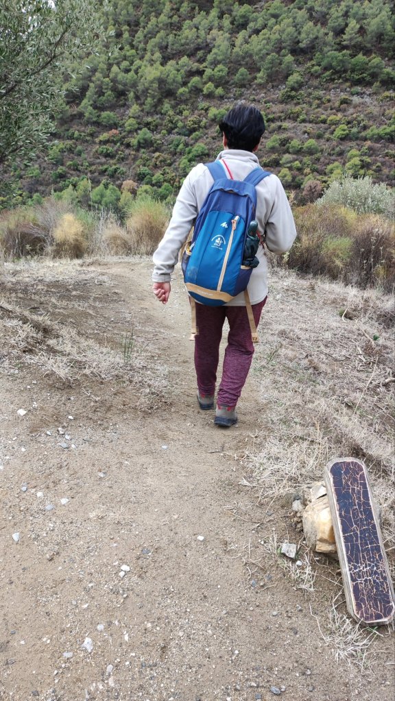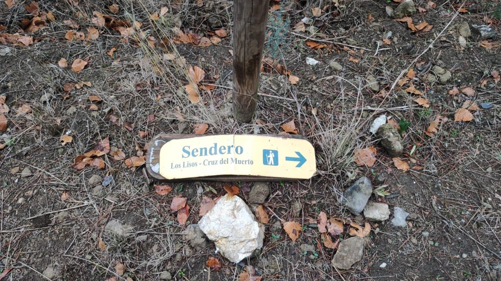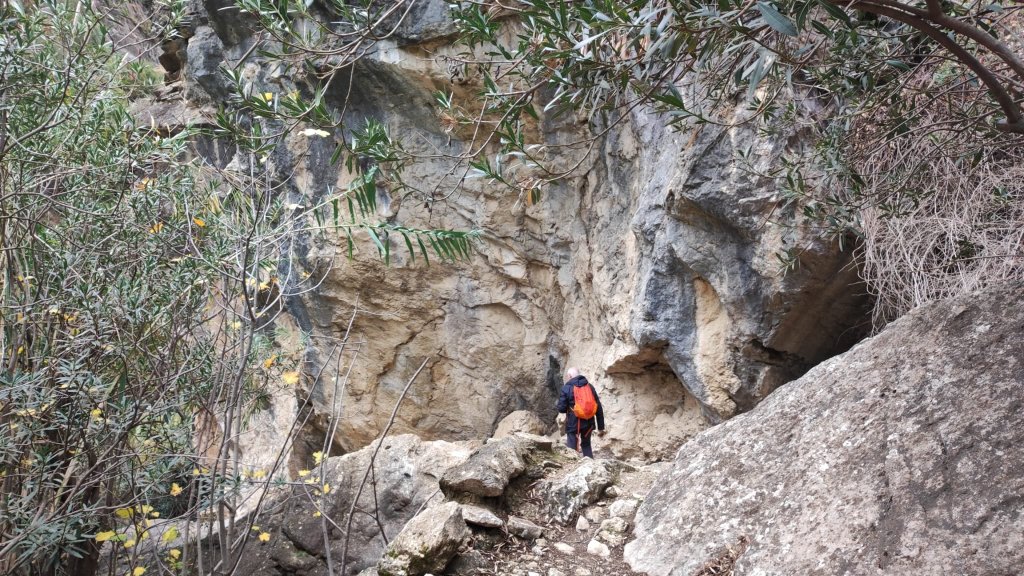 Nada más salir del bosque y entrar en una zona de olivar y aproximadamente en el km 6 de nuestro recorrido tomamos una senda a la derecha bastante difuminada por la hierba para entrar en el Sendero Los Lisos-Cruz del Muerto. Comenzamos a descender y cruzamos por primera vez el Río Cájula (en esta zona está todavía seco). El sendero es muy agradable de caminar y, como a media bajada, ya comenzamos a escuchar el rumor del agua. Nos acercamos al cauce del río junto al Cortijo de Rafaelita un antiguo molino harinero actualmente en ruinas. Desde este punto cruzaremos el río en numerosas ocasiones a través de puentes de madera en bastante buenas condiciones. El paseo es muy agradable, entre huertos, terrazas con aguacates, naranjos y limoneros. Un placer para la vista y los sentidos. Finalmente, entramos en una zona de grandes cortados, con paredes con oquedades que dan paso a un camino más amplio ya en el paraje de la Cruz del Muerto y junto a otro molino.