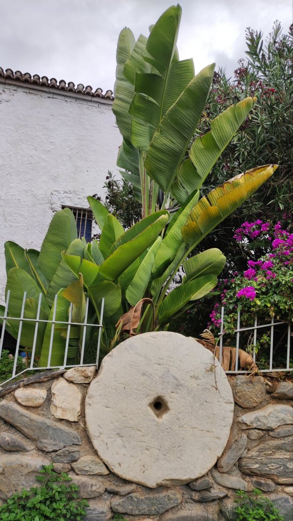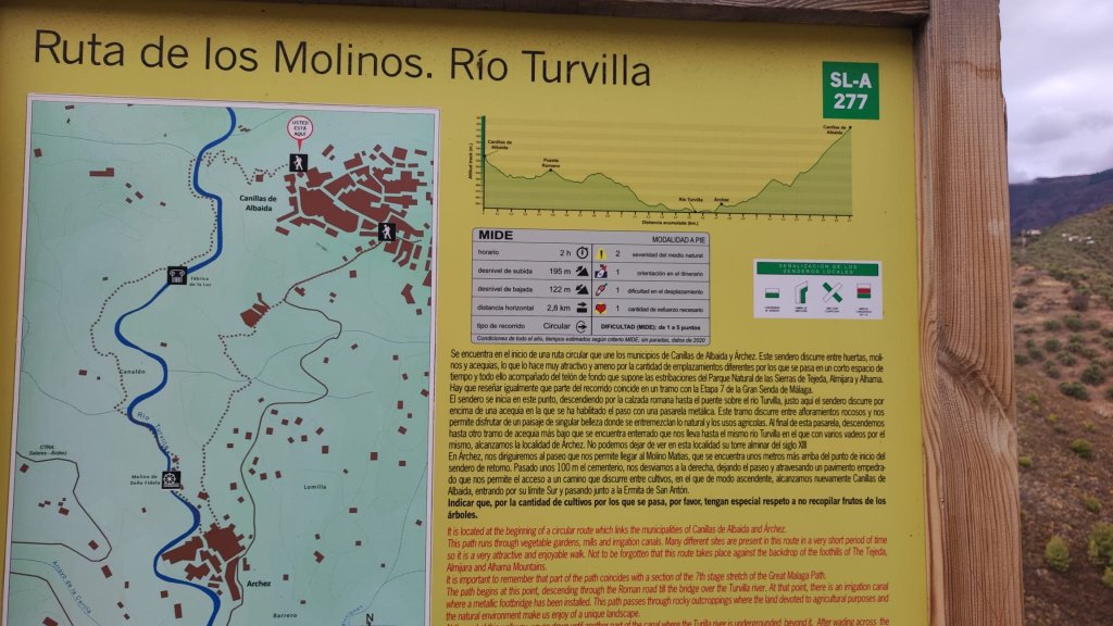 Cruzamos de nuevo el río y entramos en la pista asfaltada por la que accedimos al puente romano sobre el Río Turvilla. Aquí tenemos dos opciones: o tomar de nuevo la calzada empedrada para volver a Canillas, o cruzar de nuevo el río y tomar el sendero de los Molinos. Nos decidimos por esta segunda opción. Una pasarela metálica de unos 800 metros nos lleva sobre una acequia que servía para derivar agua hacia El Molino Matías que fue la primera fábrica de la luz que se creó en 1915, situado en el término municipal de Canillas de Albaida. Era de poco voltaje (150-155 voltios) y daba luz a Canillas, Corumbela. Árchez, Daimalos y Arenas. Funcionó hasta 1920 y después de la guerra se convirtió en molino harina. A partir de este punto el sendero vuelve a pasar por huertas de aguacates, limoneros y naranjos, pasamos por otro Molino transformado en Casa Rural y cruzamos el río un par de veces, en esta ocasión sobre unas piedras, para entrar en el núcleo urbano de Árchez.