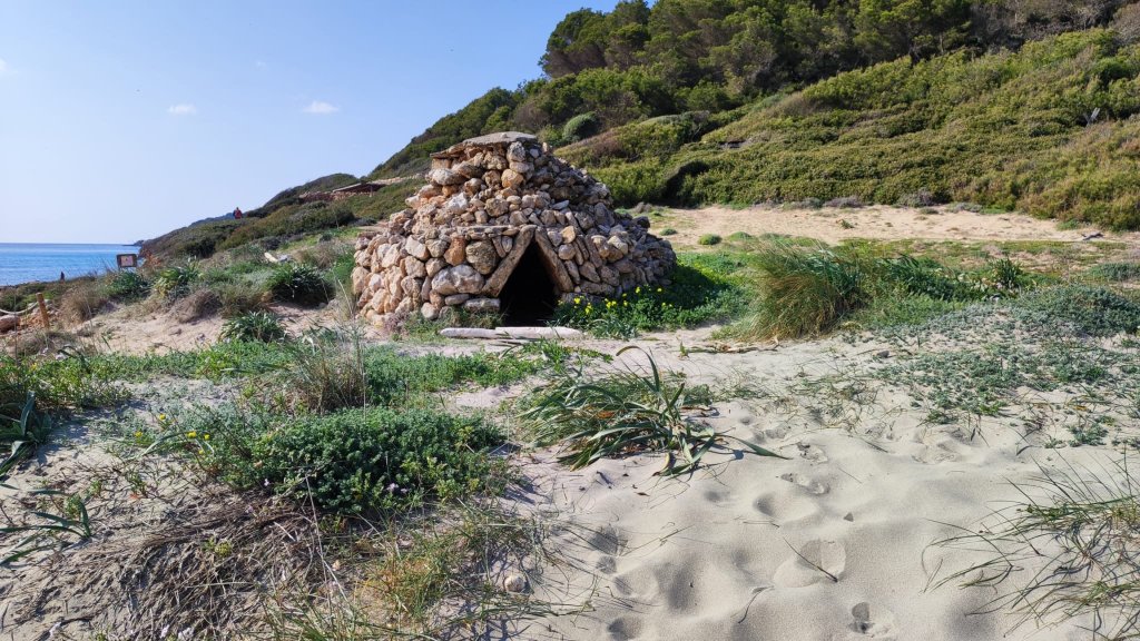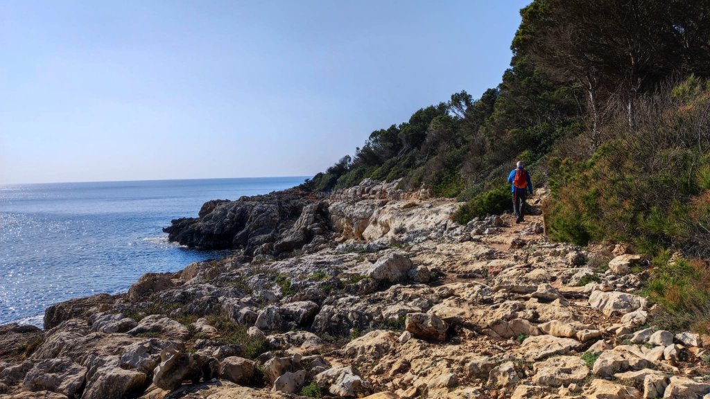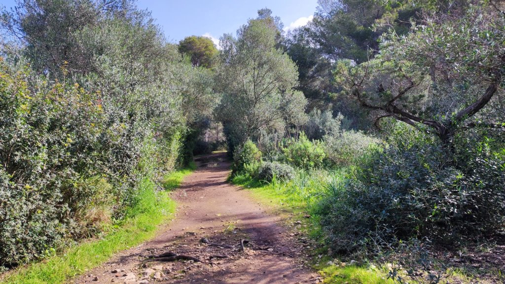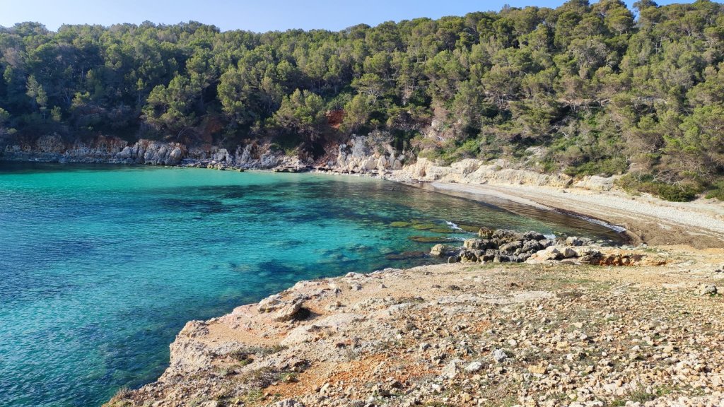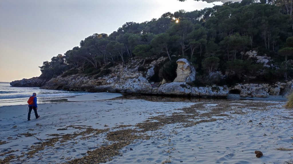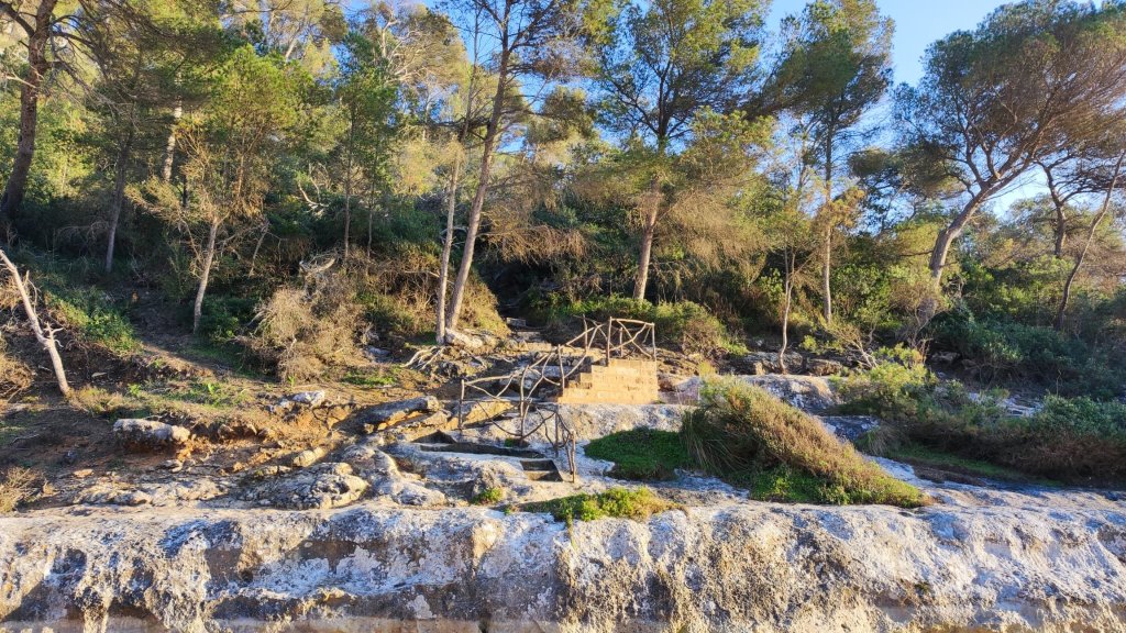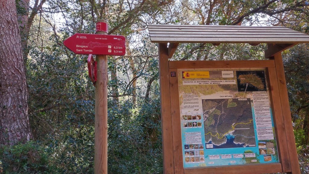 Siguiendo la señalización del Camí llegamos a una puerta que es el acceso hacia Cala Mitjana, una bonita playa de arena blanca protegida por acantilados calcáreos. Siguiendo los hitos del Camí subimos una rampa en constante ascenso mientras pasamos por algunos hornos de cal y un aljibe. Pasamos varias puertas “menorquinas” transitando por un denso bosque mientras nos alejamos de la costa hacia el interior.