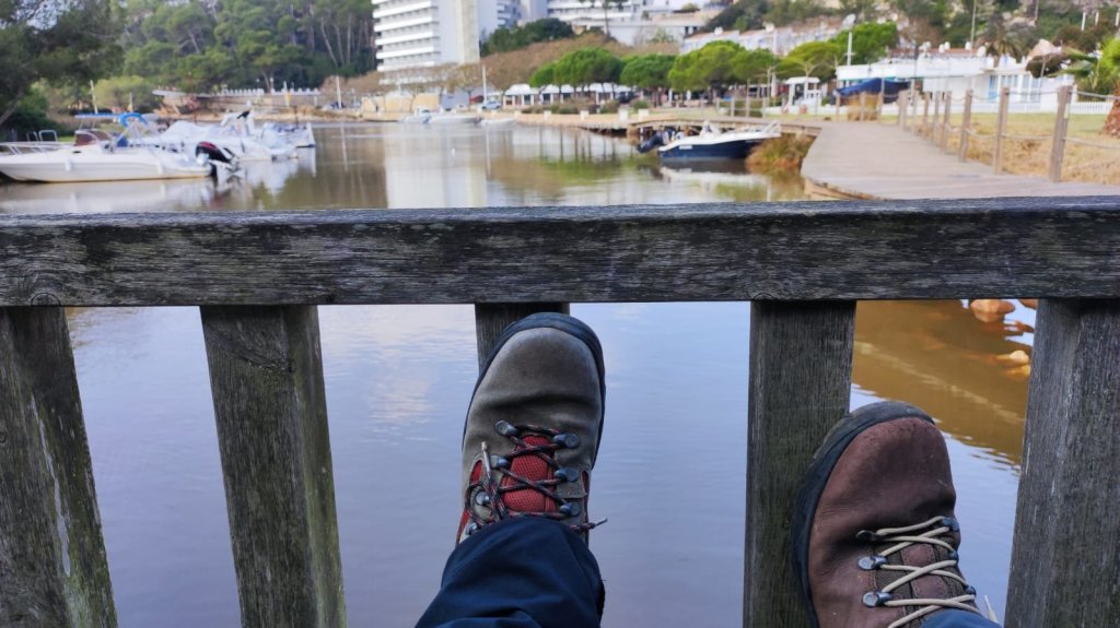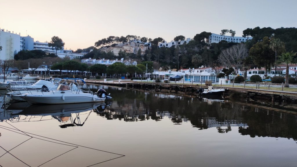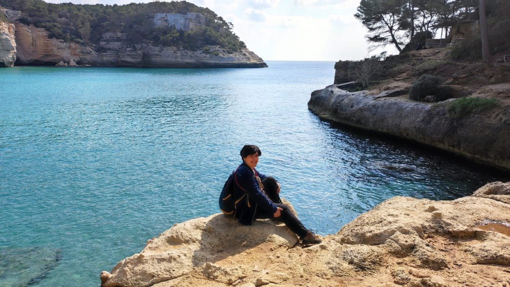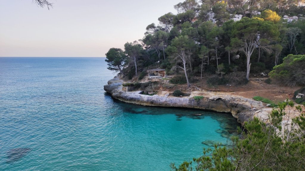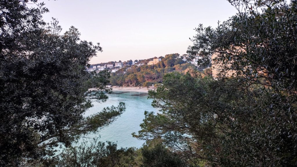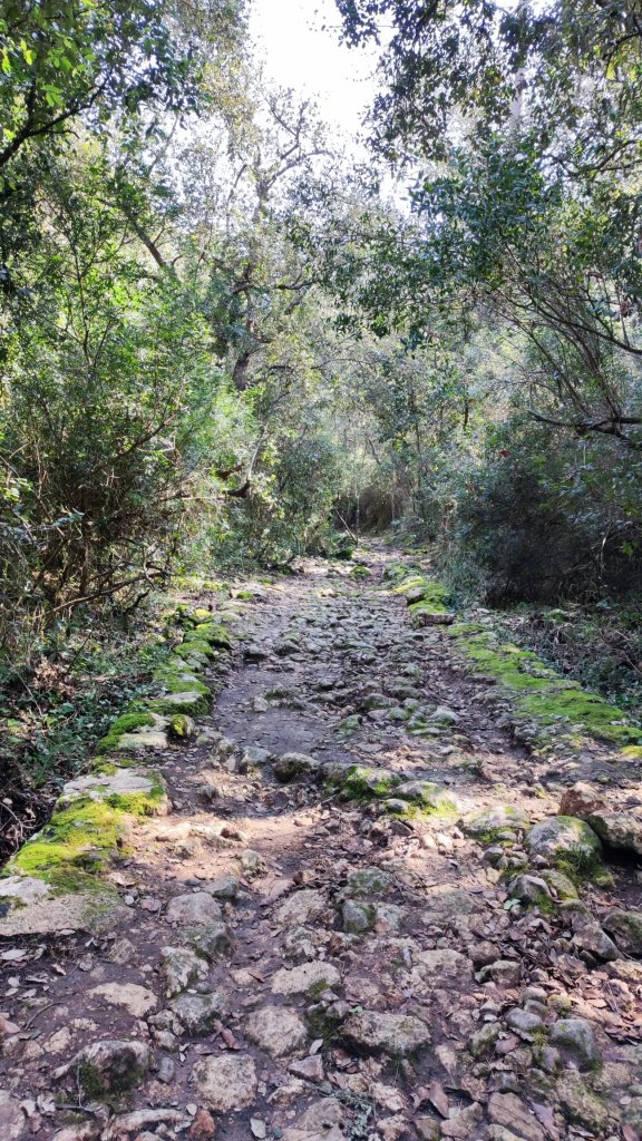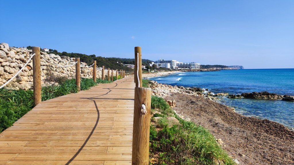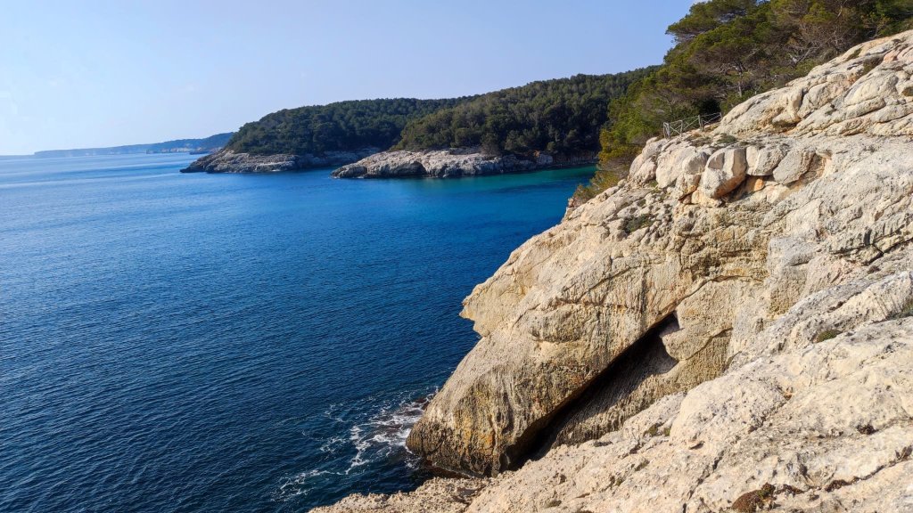 Siguiendo la señalización del Camí llegamos a una puerta que es el acceso hacia Cala Mitjana, una bonita playa de arena blanca protegida por acantilados calcáreos. Siguiendo los hitos del Camí subimos una rampa en constante ascenso mientras pasamos por algunos hornos de cal y un aljibe. Pasamos varias puertas “menorquinas” transitando por un denso bosque mientras nos alejamos de la costa hacia el interior.