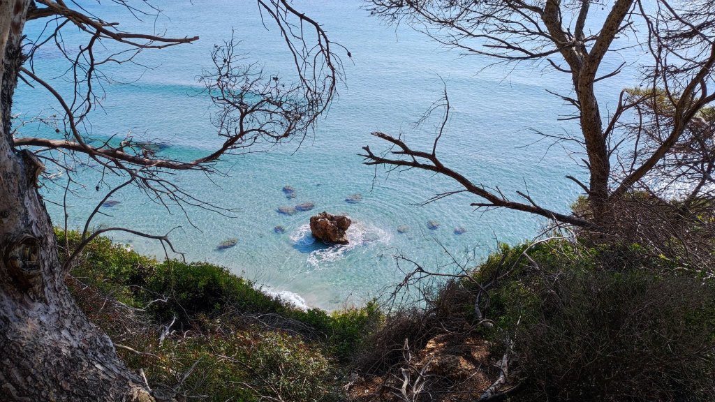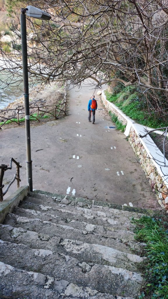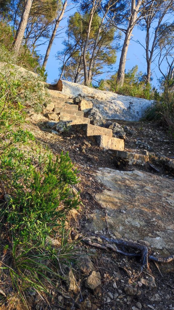 Realizado el cruce, subimos por las escaleras y nos internamos en un denso bosque mediterráneo. Cruzamos la finca Pública de Cala Mitjana hasta llegar a un punto en el que tenemos una hermosa panorámica sobre la cala que pasamos esta mañana. Nuevo descenso de vértigo por escaleras talladas en la roca para acceder a la playa.