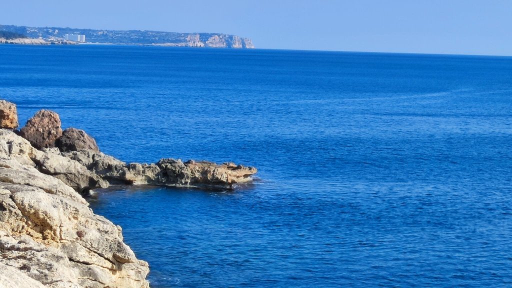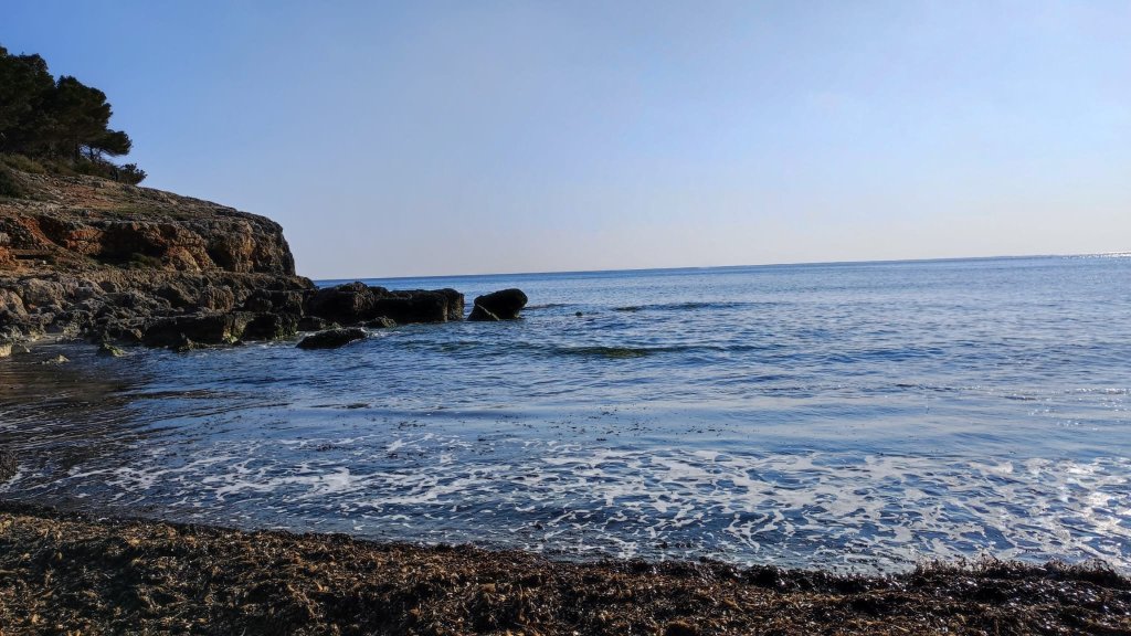Bajamos hasta la playa de Cala Escorxada, impresionante playa rodeada de bosque, y comenzamos una subida hasta Cala Fustam. Pasamos junto a una gran casa cueva junto a la senda y entramos en una zona en la que falla algo la señalización. Es una repisa rocosa sobre un acantilado. En este tramo hay varios puntos panorámicos sobre la Cala de Trabalúguer. Con la Cala a la vista iniciamos el descenso por una escalera tallada en la roca. Cruzamos toda la playa en dirección a la desembocadura del Barranc. Al otro lado vemos otras escaleras talladas en la roca. Nos descalzamos para cruzar mientras cae la tarde.