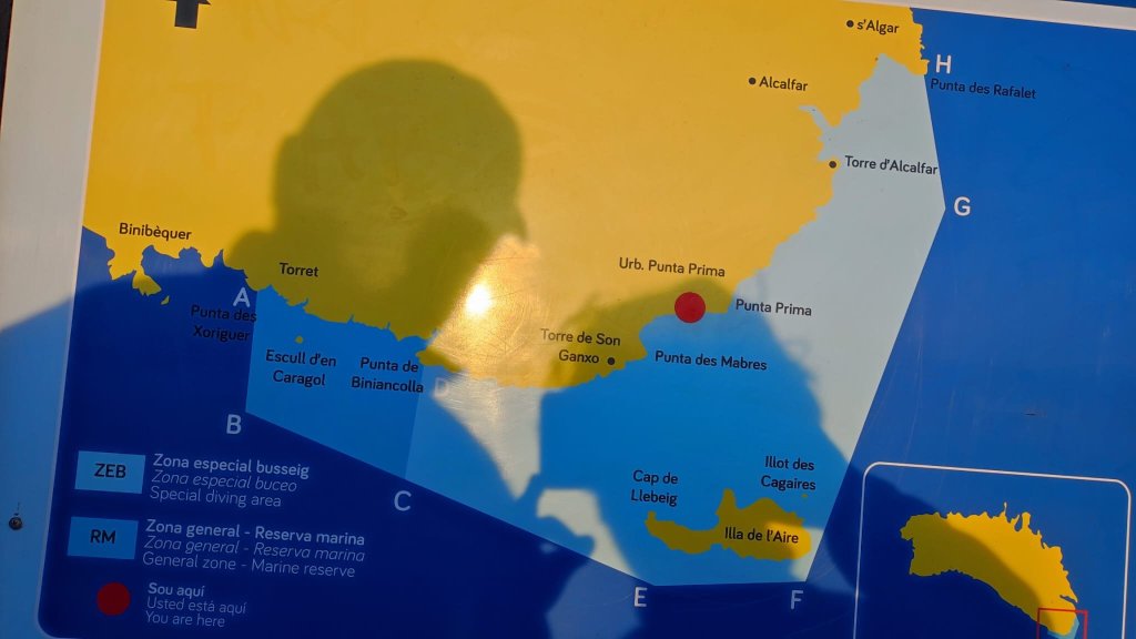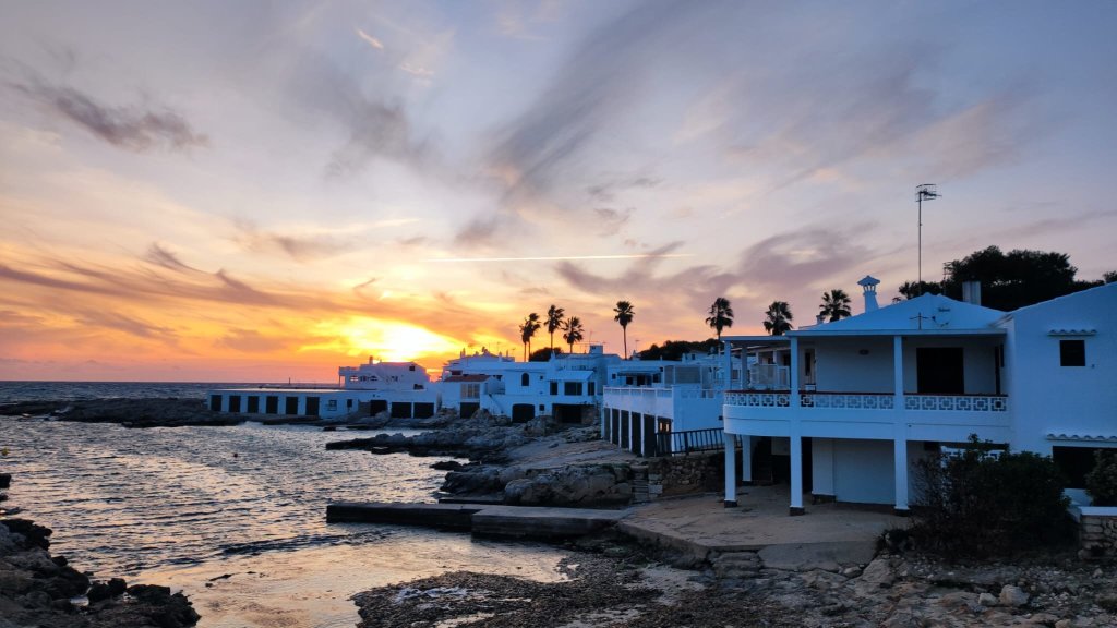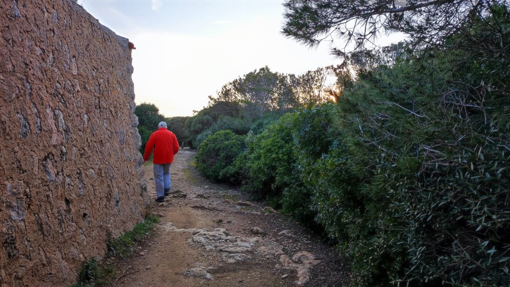 A las cuatro y media de la tarde comenzamos a caminar desde el pueblo de Pescadores de Biniacolla. La cala de Biniacolla tiene un pequeño puerto o muelle y unas bonitas vistas sobre la Isla del Aire con su vistoso faro. El camino serpentea por las calles del poblado hasta que gira bruscamente hacia el mar y transita junto a la costa algo más de un km. Al llegar al mirador de Punta Prima el camino gira a la izquierda, pasa por el arenal de Punta Prima hasta el final del Passeig de S’Arenal. Se cruza una puerta menorquina y el camino continua por la zona costera. Es bastante rocoso y con mucho matorral, por lo que se progresa muy lentamente.
