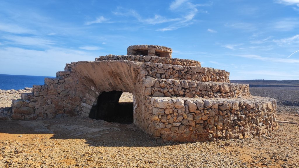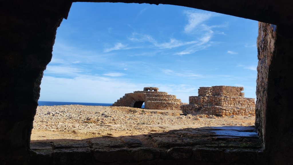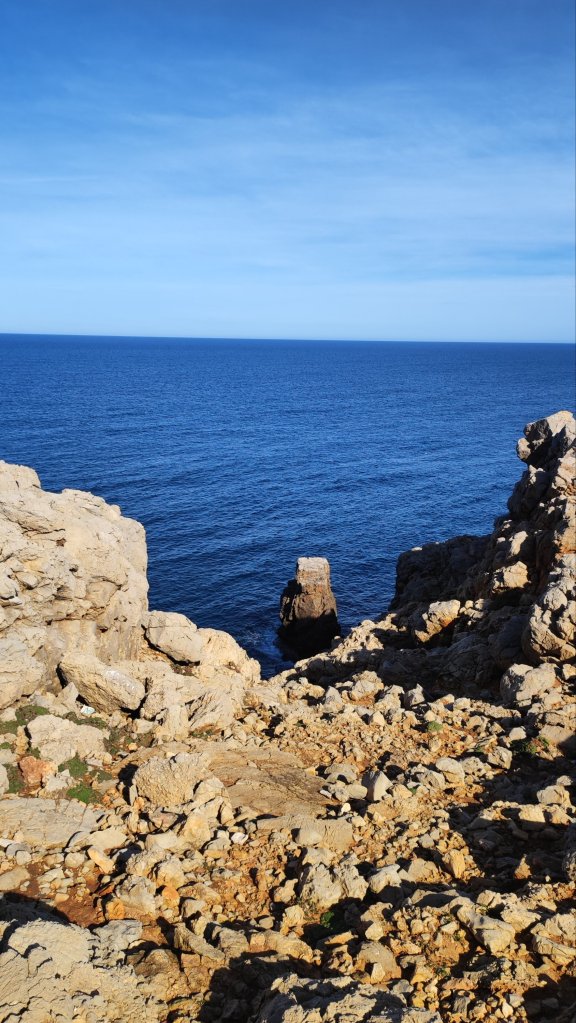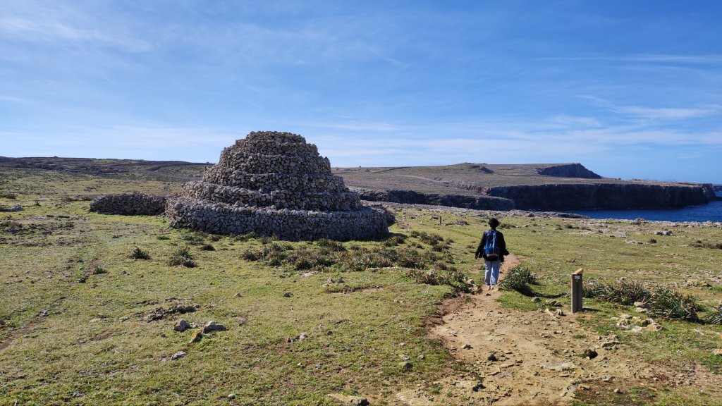 Por el camino vamos encontrando más barracas de piedra y al fondo ya comenzamos a ver el Turó de Bajoli (80 m) hito montañoso del día. Para llegar a ese punto pasamos hasta tres barrancos, otras tantas puertas menorquinas hasta llegar al imponente mirador de Sa Falconera. Debajo del mirador podemos ver los restos del asentamiento costero pre talayótico de Es Pop Mosquer.