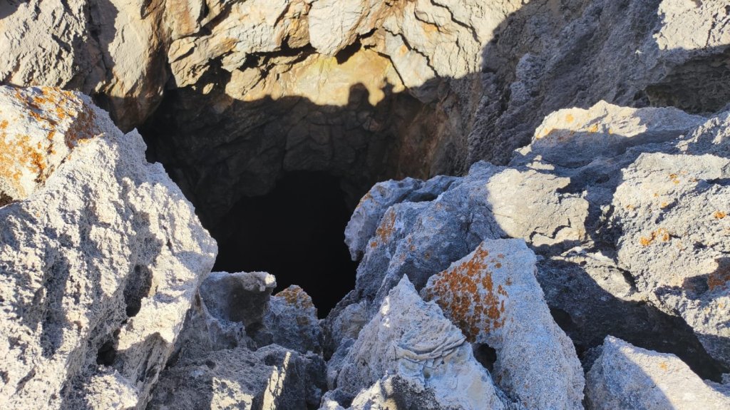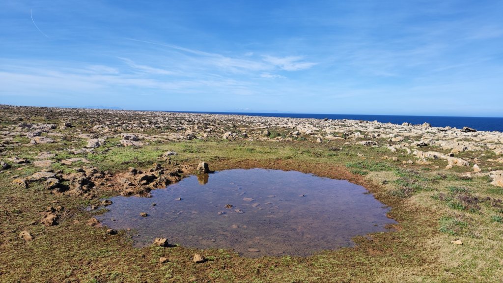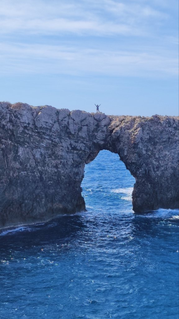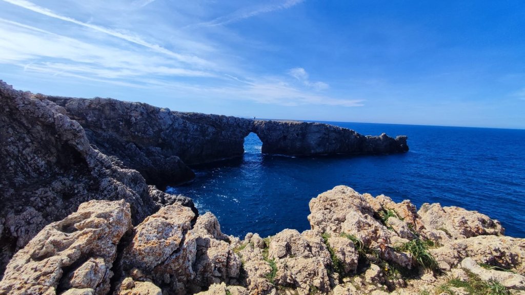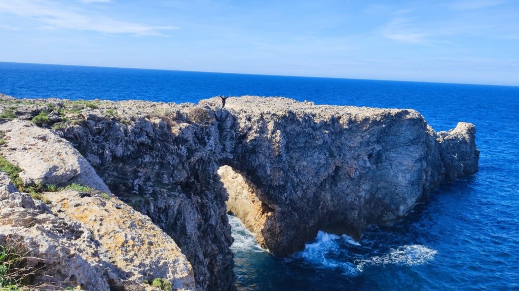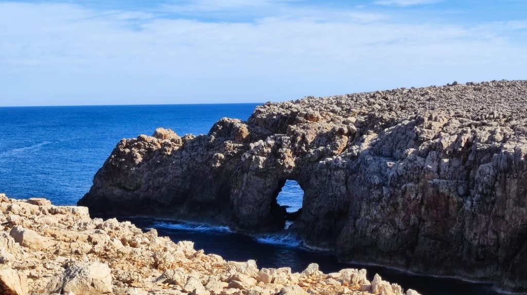 A nuestra izquierda hay unas construcciones abandonadas y el Camí de Cavalls comienza a descender para pasar bajo el Turó. Nosotros continuamos recto para hace “cima” campo a través. Llegamos al vértice geodésico, fotos de rigor y para abajo. Deshacemos nuestros pasos hasta un punto en el que es posible reconectar con el Camí sin despeñarnos. Descendemos hasta las inmediaciones de una EDAR y tomamos el camino de servicio pasando junto a otro pozo abrevadero y una cueva-refugio. Un poco más adelante llegamos al pintoresco Pont d’en Gil, un arco calcáreo justo encima del acantilado. Para nosotros es el punto final de nuestro recorrido. Tomamos algunas fotos e iniciamos el camino de vuelta por el mismo recorridos.