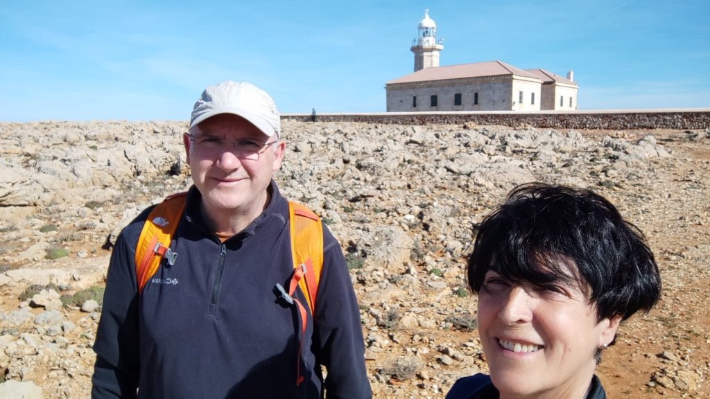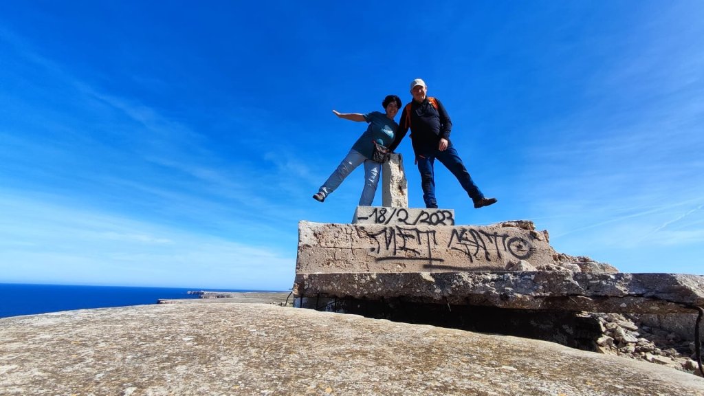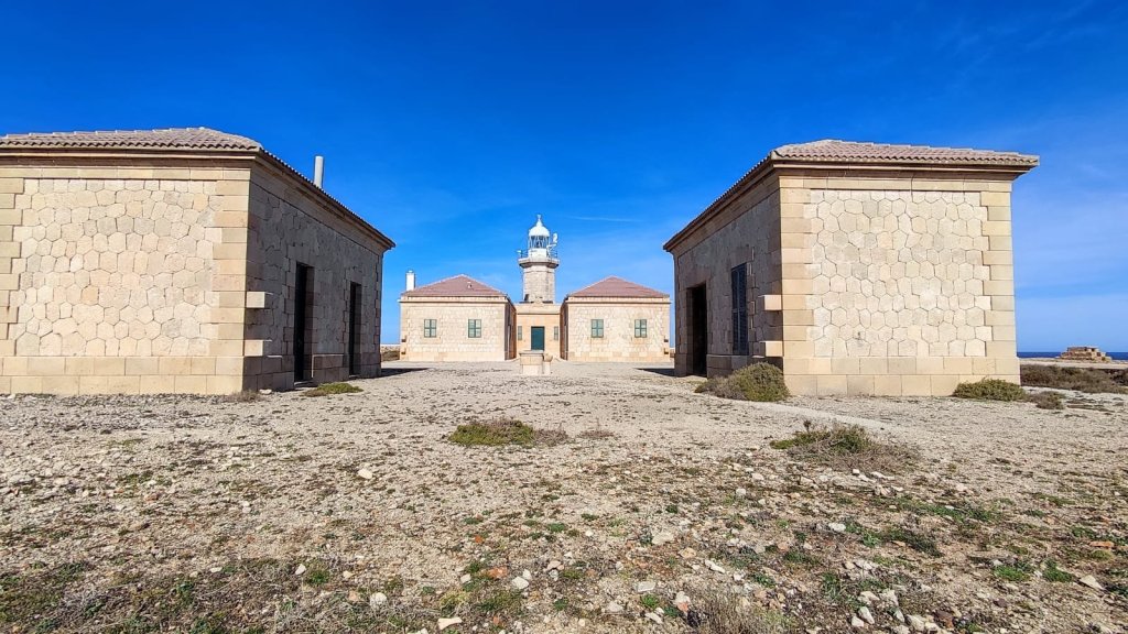 Dejamos el coche en el aparcamiento junto al camino del faro y nos dirigimos por el camino de servicio hasta zona del faro. Una visita muy recomendable ya que se tienen unas bonitas vistas de la cercana isla de Mallorca con la sierra de la Tramontana ligeramente cubierta de nieve. Junto al faro hay un conjunto de antiguos búnkeres de uso militar hoy en completo abandono. Un poco marcado camino nos acerca al impresionante acantilado de Cala es Pous, con una hendidura a modo de ojo de puente, así como al Bufador de Punta Nati, una chimenea natural por la que el agua del mar sale pulverizada los días de Temporal.