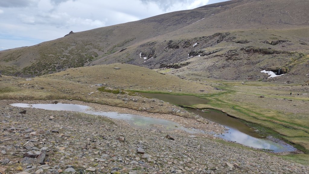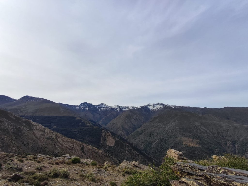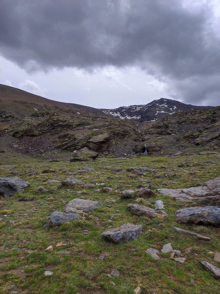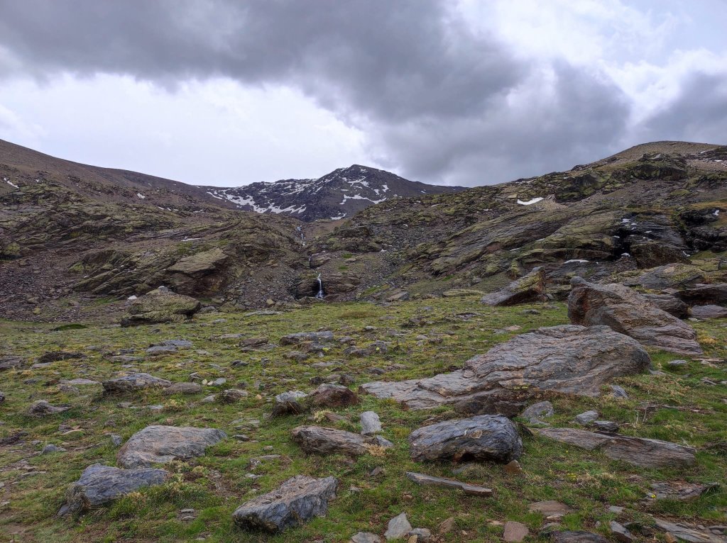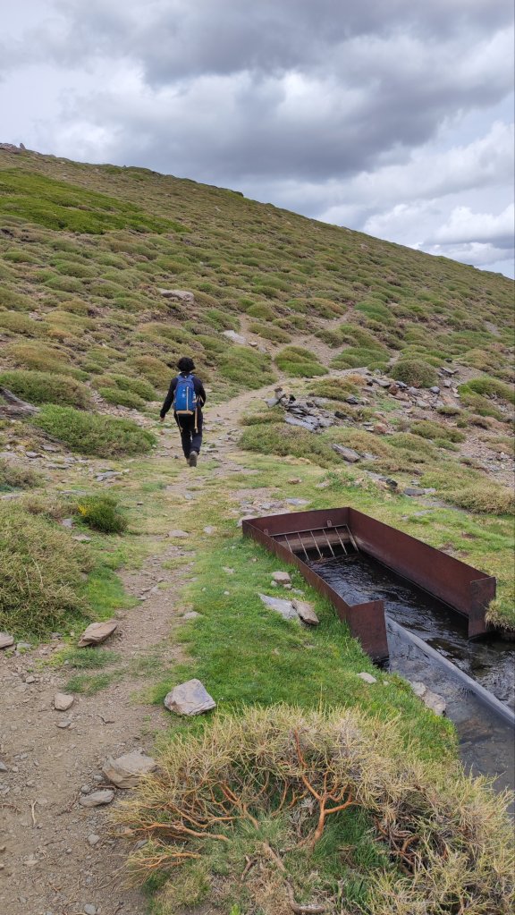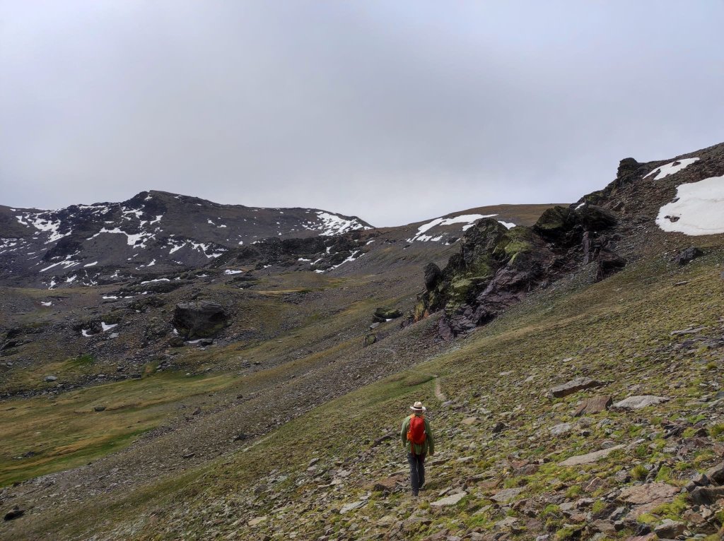 A las 9:30 de la mañana ya estábamos en el aparcamiento desde donde pudimos admirar «de cerca» los colosos de Sierra Nevada. Comenzando por la derecha, el Veleta, Cerro de los Machos, Mulhacén, Alcazaba, Puntal de Vacares y Pico del Cuervo. Entre los picos, los Valles Glaciares del Guarnón, Valdeinfierno, Valdecasillas y Vacares. Tras cruzar la cadena que corta el paso a los coches veremos a la izquierda un registro de la Acequia Papeles que será nuestra referencia para el camino de vuelta. Dejamos el carril de la vuelta a nuestra izquierda y comenzamos la subida por la Loma Papeles en dirección a la Loma de las Cunas de los Cuartos. En este contexto el término «Cunas» hace referencia a unas anchas y suaves planicies alomadas por las que iremos transitando en esta primera parte de la ruta.