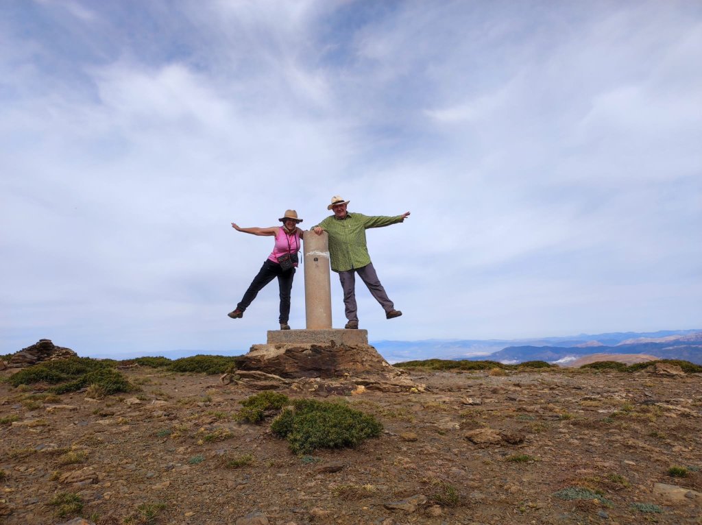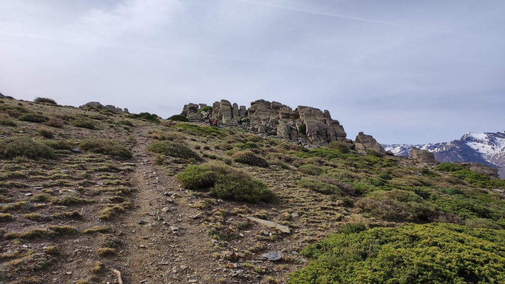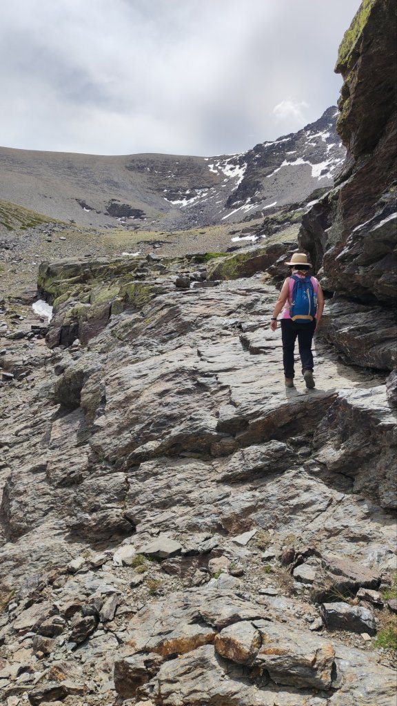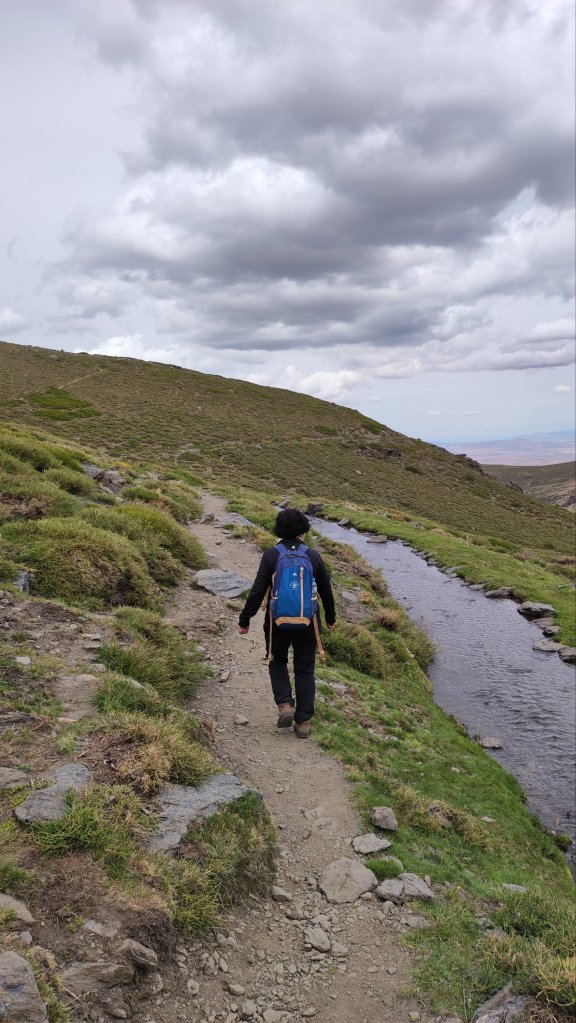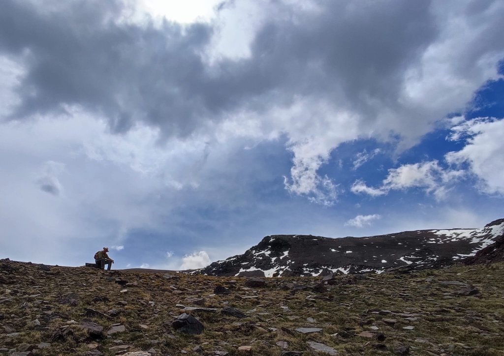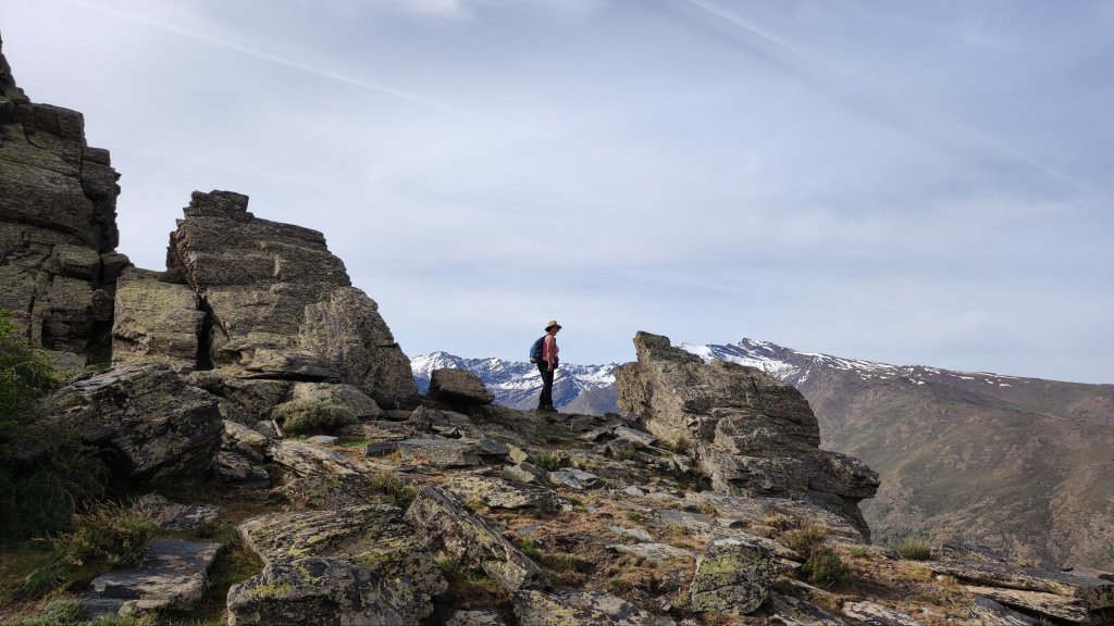 A las 9:30 de la mañana ya estábamos en el aparcamiento desde donde pudimos admirar «de cerca» los colosos de Sierra Nevada. Comenzando por la derecha, el Veleta, Cerro de los Machos, Mulhacén, Alcazaba, Puntal de Vacares y Pico del Cuervo. Entre los picos, los Valles Glaciares del Guarnón, Valdeinfierno, Valdecasillas y Vacares. Tras cruzar la cadena que corta el paso a los coches veremos a la izquierda un registro de la Acequia Papeles que será nuestra referencia para el camino de vuelta. Dejamos el carril de la vuelta a nuestra izquierda y comenzamos la subida por la Loma Papeles en dirección a la Loma de las Cunas de los Cuartos. En este contexto el término «Cunas» hace referencia a unas anchas y suaves planicies alomadas por las que iremos transitando en esta primera parte de la ruta.