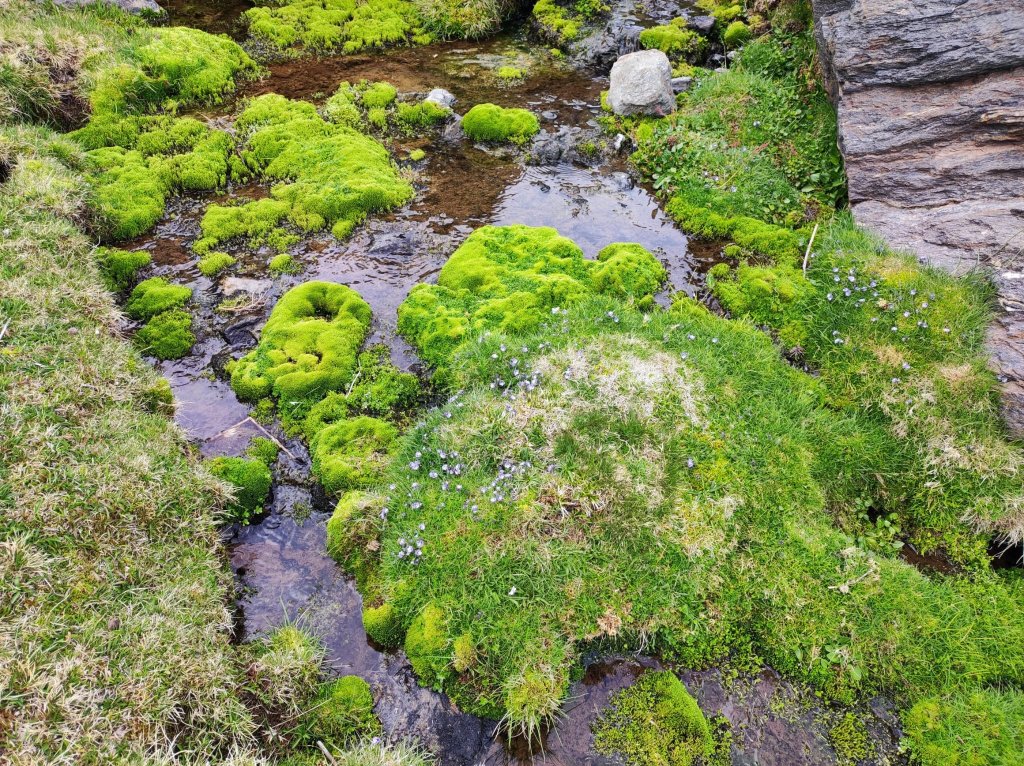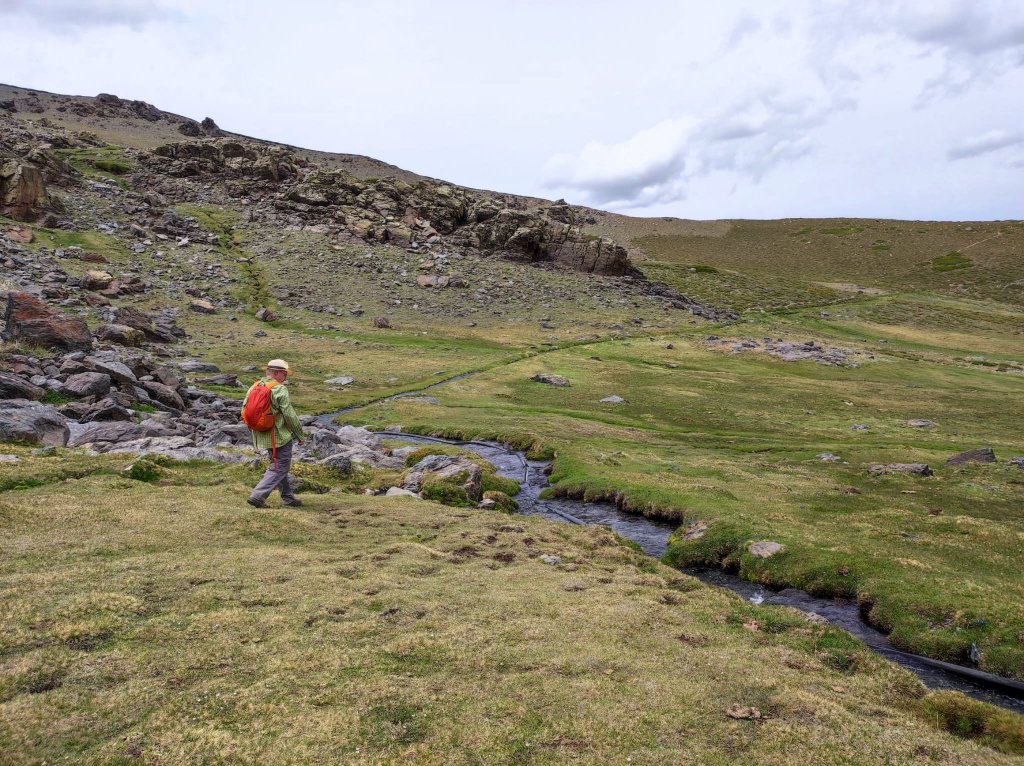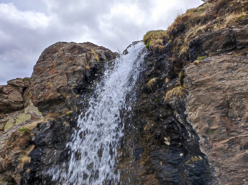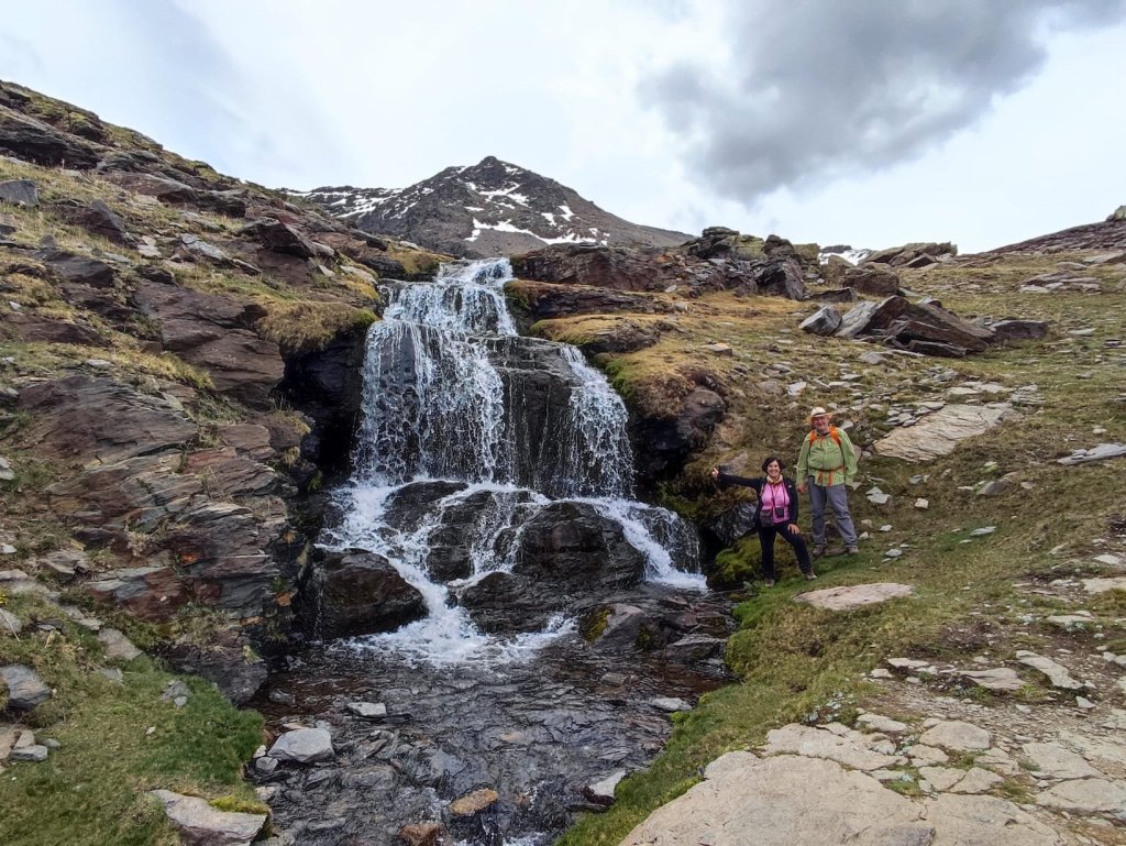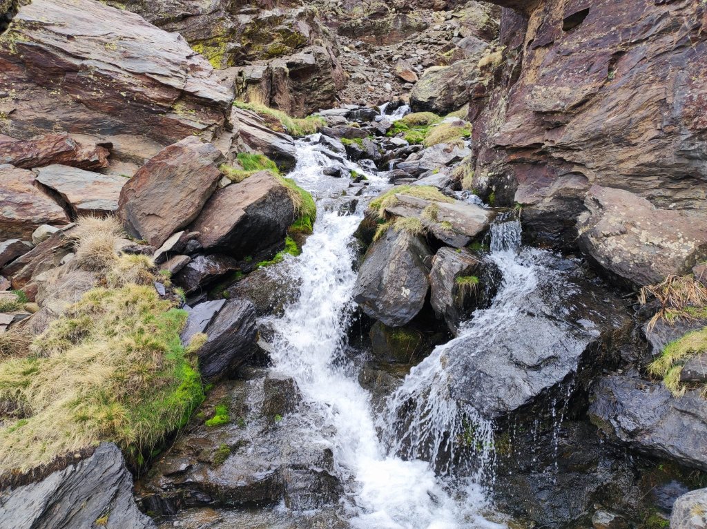 Comenzamos el descenso por la margen izquierda del Río Maitena en un trazado que requiere cierta técnica, mucha paciencia y toda la concentración puesta en cada paso que se da. Es inevitable ir volviendo la cabeza para admirar la belleza del agua cayendo en bonitas chorreras y cascadas en las que tendremos vistas únicas y parajes que transmiten paz y belleza. La fluidez del agua montaña abajo es algo casi hipnótico. Finalmente desembocamos en un prado, la Hoya de la Alberca, desde donde podremos admirar con detenimiento las chorreras y varios arroyos que bajan por las laderas cuyas aguas se remansan en este lugar. La vereda, paralela al curso de agua, nos lleva hasta la Charca de Covatillas, lugar en el que en el que pastan algunas vacas y podemos contemplar algunos ejemplares de estrella de las nieves, ranillos de las nieves o gentiana verna. Nosotros también haremos una parada para disfrutar de nuestro almuerzo.