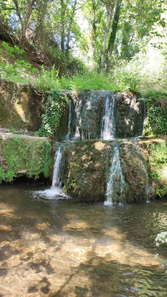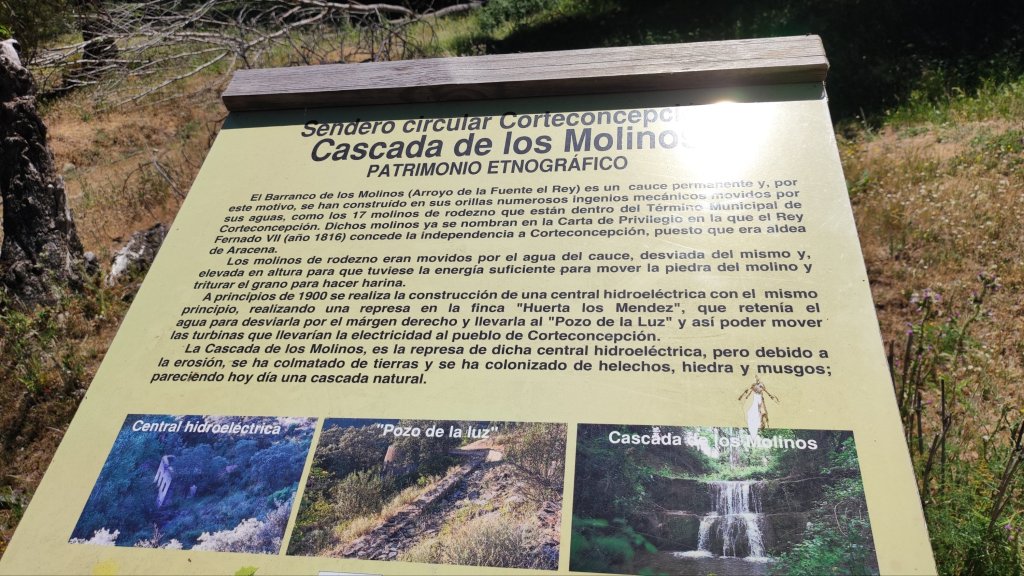 Tomamos la carreteras HU-8126 en dirección a Cañaveral de León y a unos 500 m tomamos un estrecho camino con señalización a la Fuente del Rey y las Cascadas de los Molinos. El camino transcurre entre diversas huertas hasta llegar a la Fuente del Rey. Un pequeño descansadero sustentado por un manantial que actualmente está seco por la afección de sondeos cercanos. Seguimos la señalización, ahora con la presencia de las flechas amarillas del Camino de Santiago del Sur en dirección a Cañaveral de León. Seguimos por el camino hasta llegar a una zona en la que veremos los restos de diversos molinos de rodezno en un estado bastante malo. A la derecha ya comenzamos a percibir el rumor del agua y vemos un paso de piedras sobre el río. Nosotros nos mantenemos en el camino ignorando este paso. Junto al camino veremos un panel informativo informando sobre los molinos de Rodezno. Corteconcepción llegó a tener hasta 17 molinos en esta zona. A unos 600 m nos desviamos hacia el merendero de la Cascada de los Molinos. En realidad la cascada se trata de un azud o represa que suministraba agua a una vieja central eléctrica. Por la parte alta de la cascada aún se aprecia un canal que transportaba agua hacia una instalación conocida como «Pozo de la Luz» donde el agua se despeñaba moviendo unas turbinas. tras un breve refrigerio continuamos muestra marcha hacia Corteconcepción.