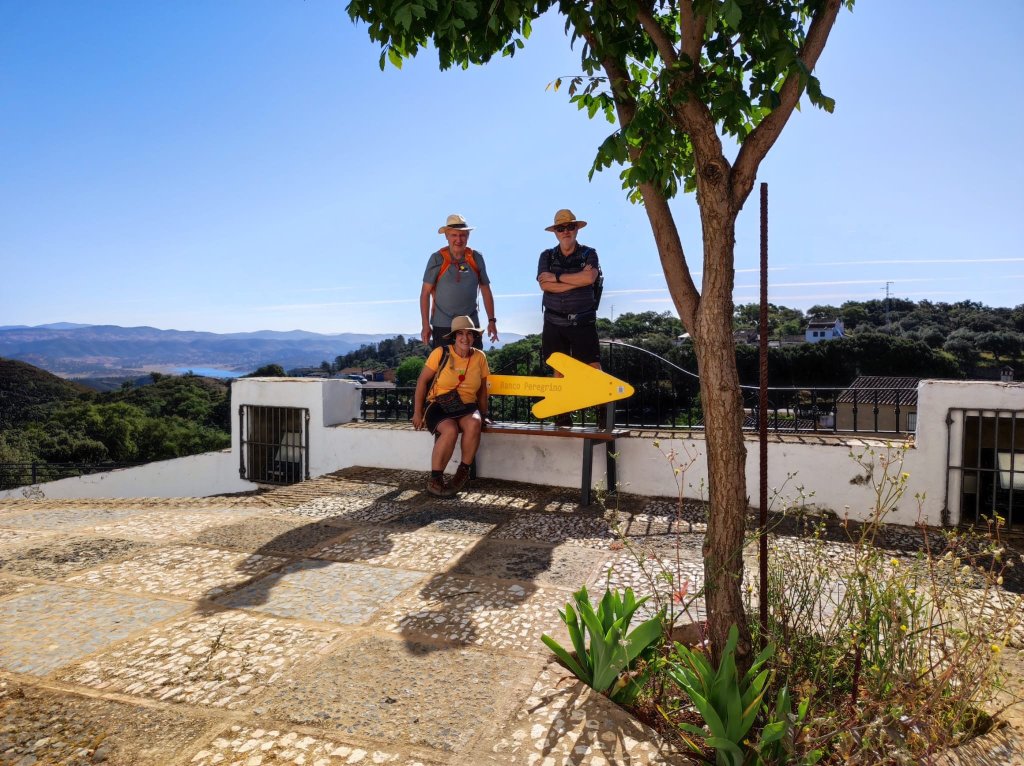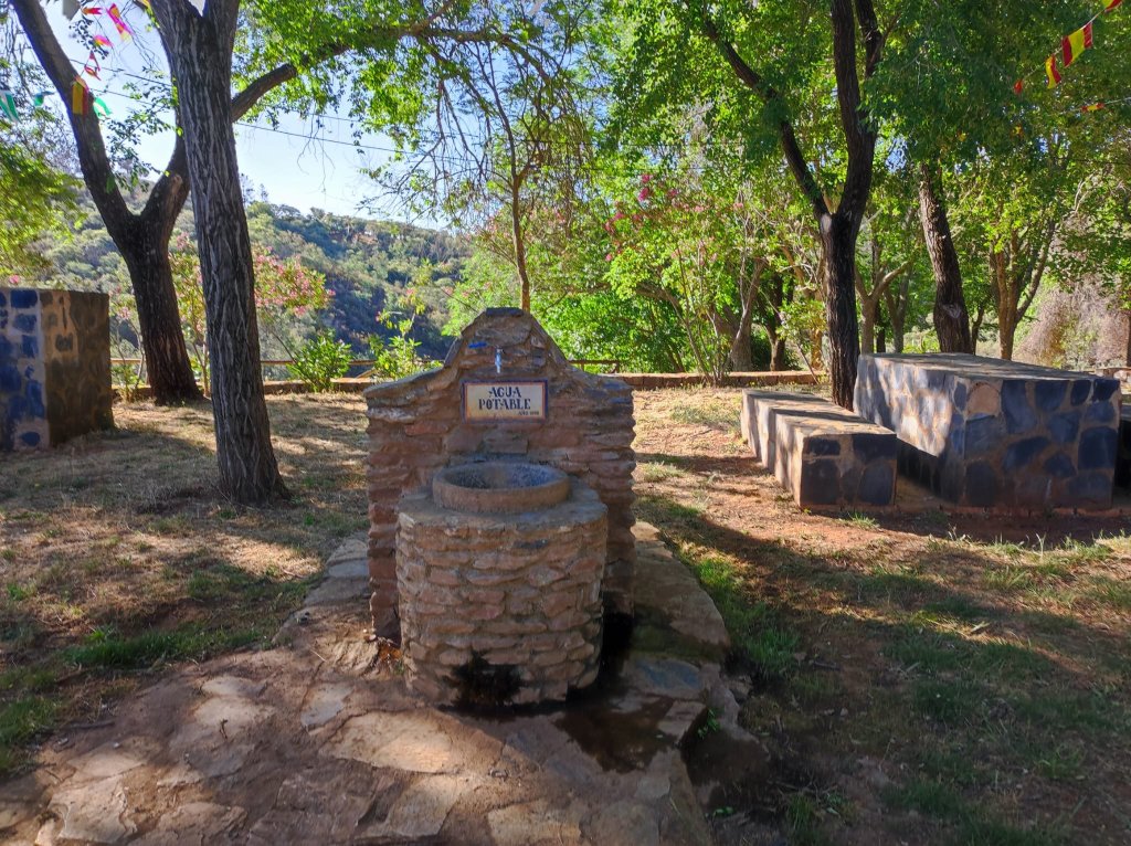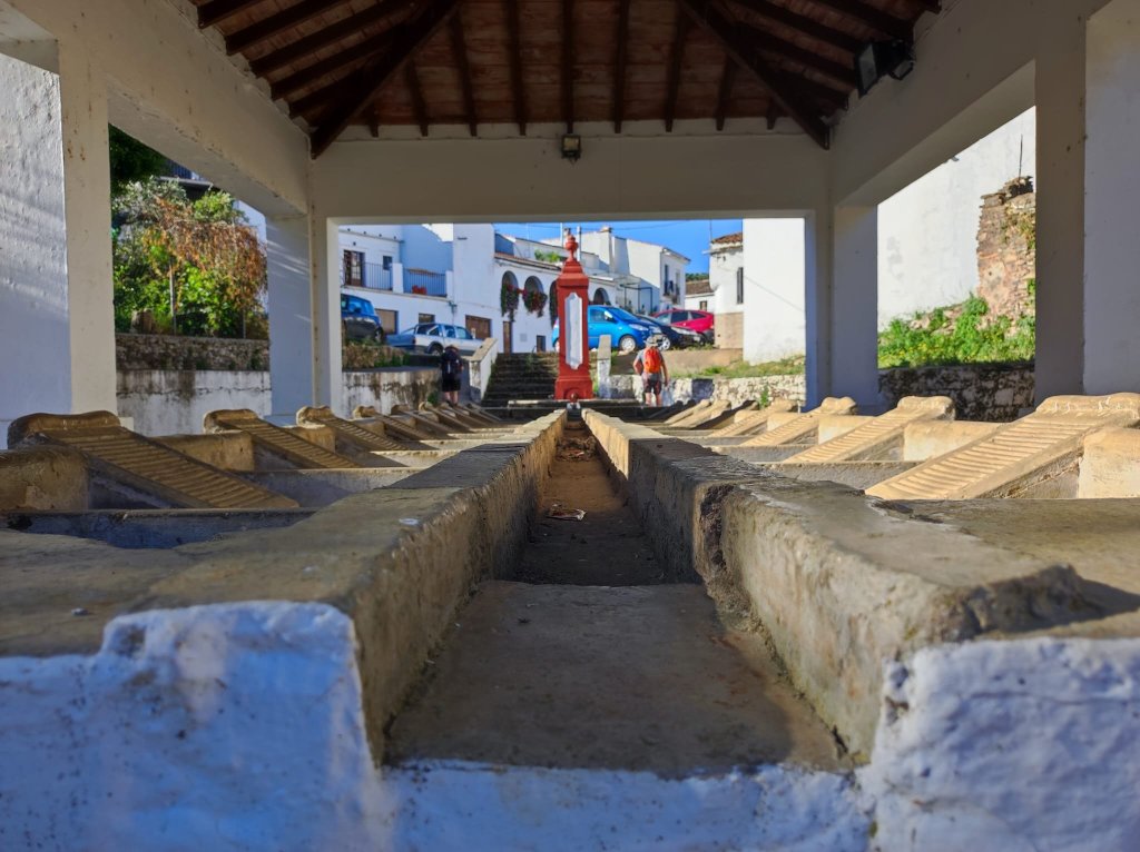 Comenzamos a caminar junto al lavadero de Corteconcepción. Es el típico conjunto de fuente-abrevadero-lavadero con un orden funcional con preferencia al consumo humano, luego el consumo animal y, por último, el lavadero con salida del agua por una acequia destinada al riego. La fuente es un poste troncopiramidal del que salen cuatro caños que vierten a una fuente octogonal que desborda hacia un pilar alargado y de ahí al lavadero con 20 pilas (10 a cada lado) cubiertas con un tejado a cuatro aguas. Desde el lavadero nos dirigimos por una estrecha carretera hacia el mirador de la crucecita, con unas buenas vistas sobre el pantano de Aracena y los Picos de Bonales y Tentudía. Regresamos a Corteconcepción por el aula de la naturaleza y área de descanso de La crucecita donde se prepara el lugar para la celebración del Día de la Cruz. En este punto nos encontramos con Colibrí y Sandra, dos jóvenes que realizan actividades de sensisbilización con la naturaleza en un grupo de Boy Scouts. Ellos también se preparan para hacer una ruta por la zona.