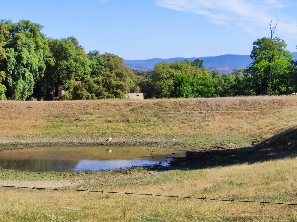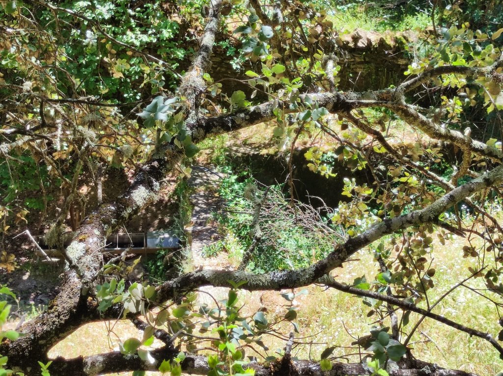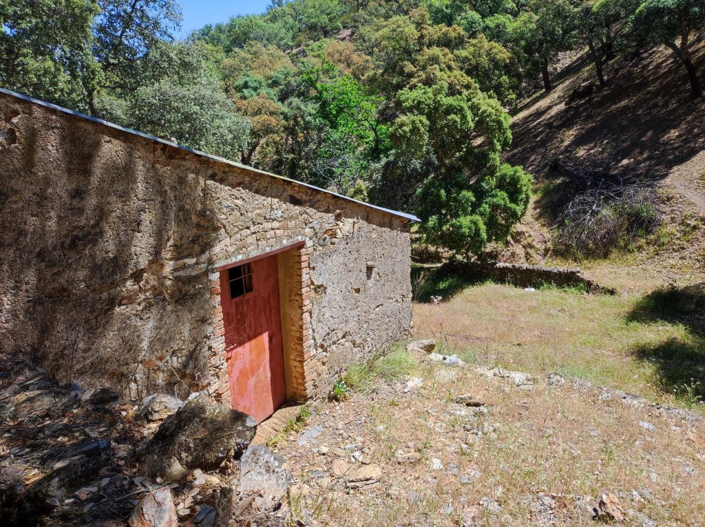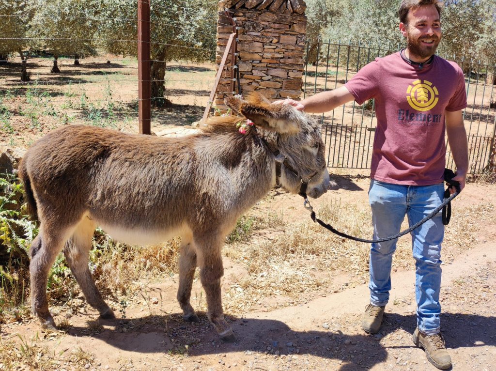 Regresamos al camino y un poco más adelante cruzamos el arroyo de la Fuente del Rey junto a las ruinas de un Molino con alberca en muy malas condiciones. La vereda continúa entre explotaciones ganaderas, muy sombreadas para salir a un camino rural que nos llevará a la zona de Cuatro Caminos. Para no repetir el camino que nos trajo hasta aquí continuamos de frente para entrar a Corteconcepción por la parte sur. Nos encontramos con Carmelo, un burrito joven de seis meses que ha salido a pasear con su dueño por primera vez. Unos 300 m más adelante llegamos al Lavadero donde comenzamos la caminata esta mañana.