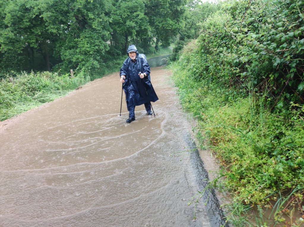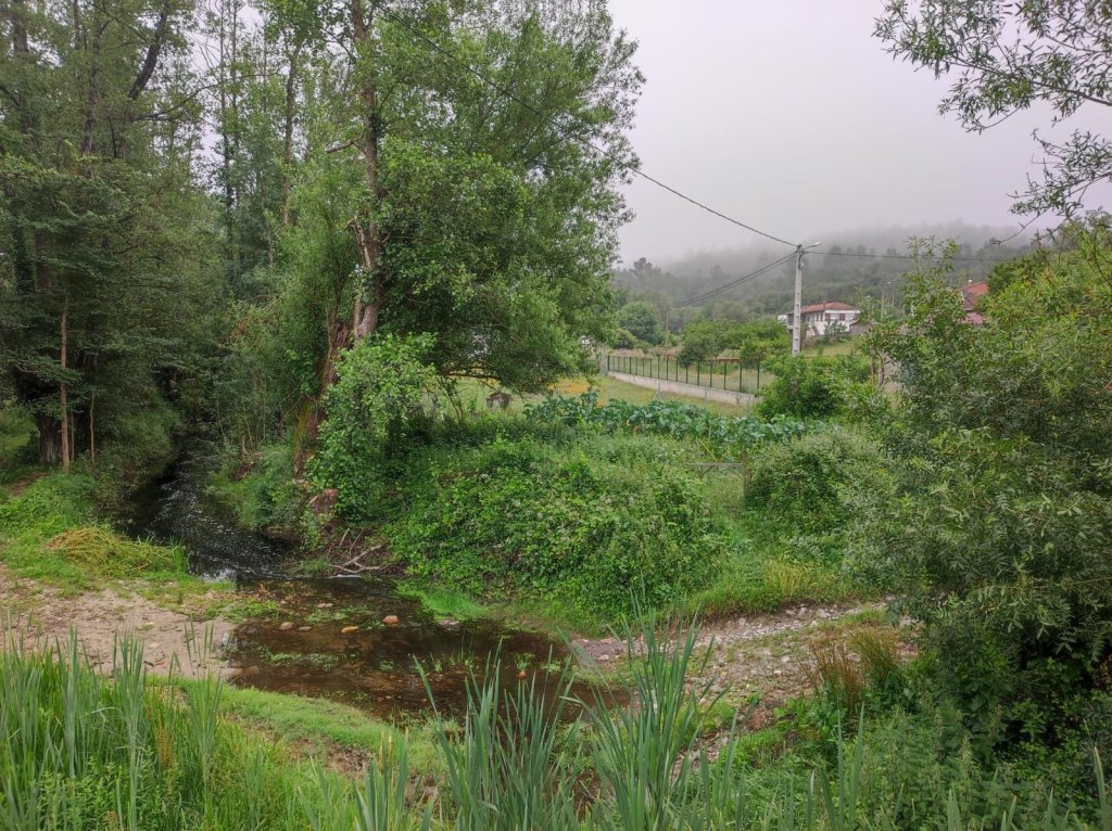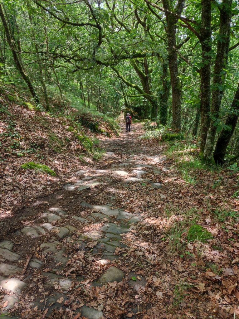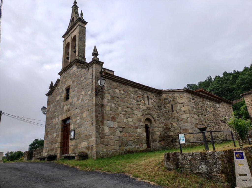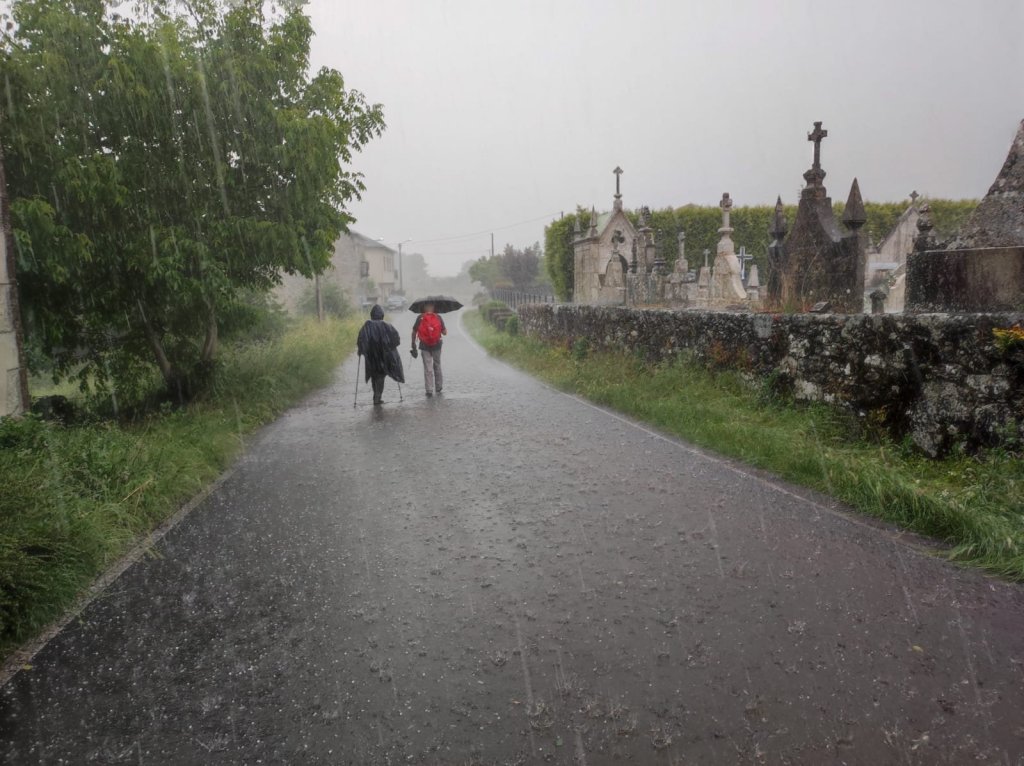 Al salir de la carretera y tomar un camino a la derecha que lleva hasta un molino abandonado y un paso por un arroyo con una pasarela de piedras comienza de nuevo a llover, primero suavemente, después con gran intensidad, nube de granizos incluida antes de llegar a la carretera de San Pedro. Aguardamos un rato bajo un monumental roble pero la tormenta continúa. Salimos del bosque y por la carretera llegamos a San Pedro de Líncora —ya en el municipio de Chantada, también con hospital en la Edad Media—, nos refugiamos en los porches de unas casas pero la lluvia continúa. La carretera comienza a inundarse, por lo que decidimos hacer a paso rápidos los 2 km de camino que queda. En medio de la riada llegamos a Chantada por el barrio de A Ponte y por la señorial Rúa Dous de Maio, tomamos el camino de nuestro alojamiento ya completamente empapados.