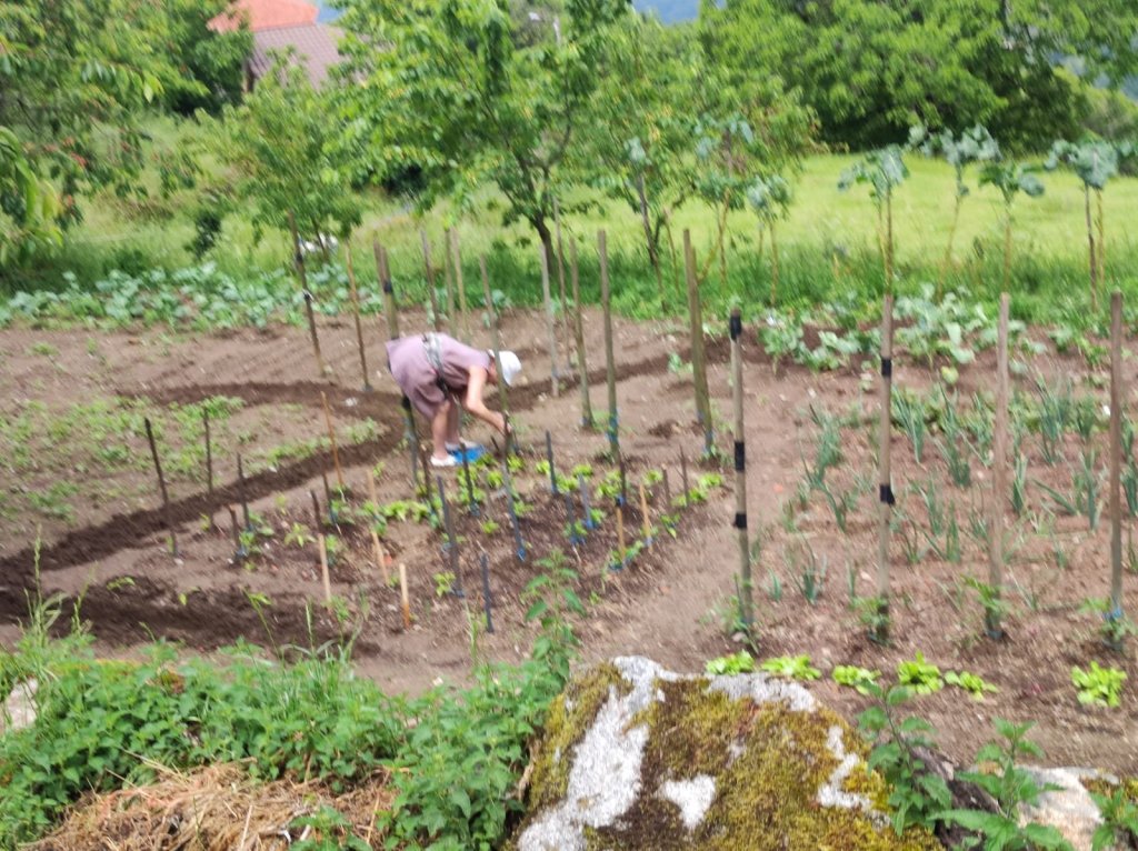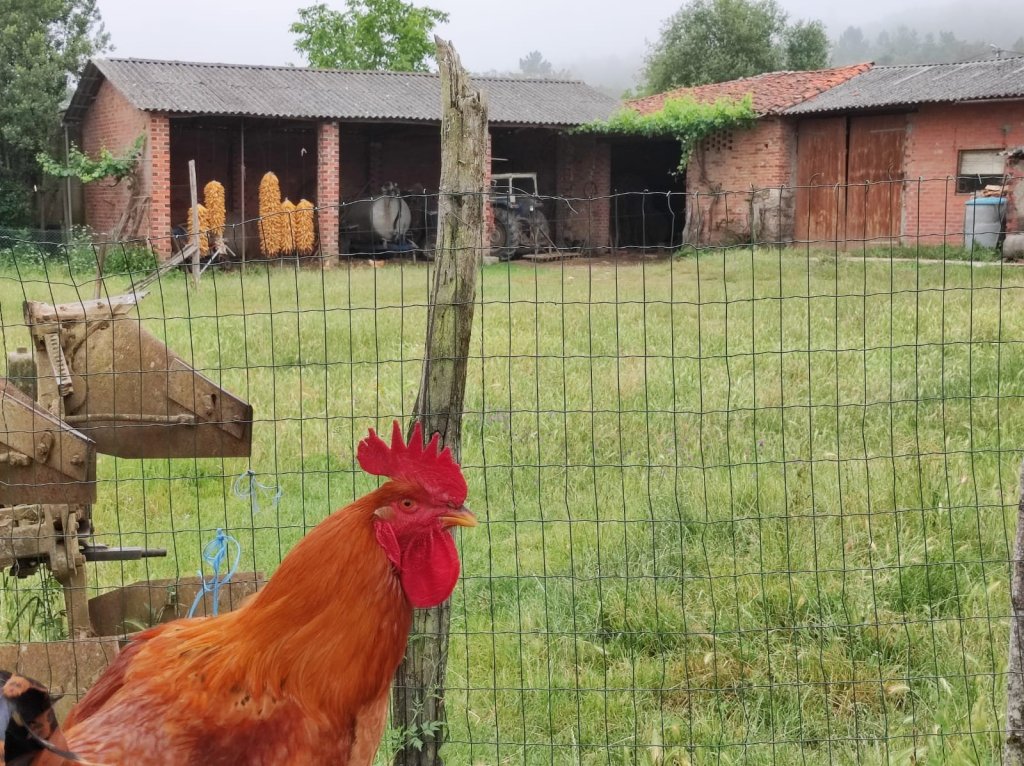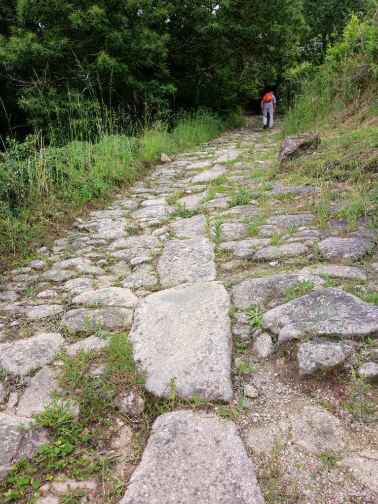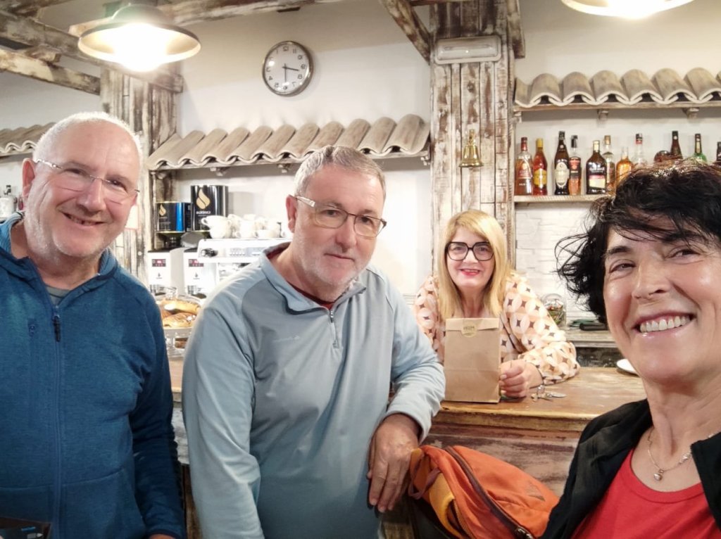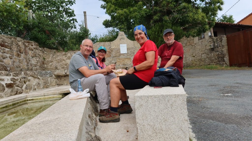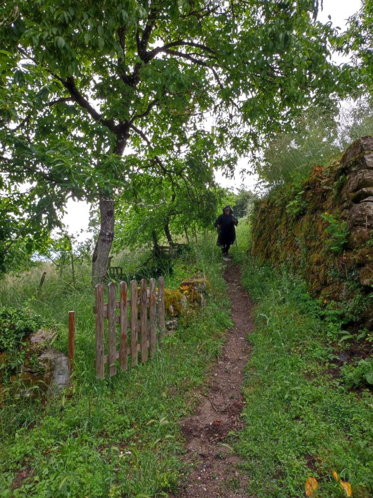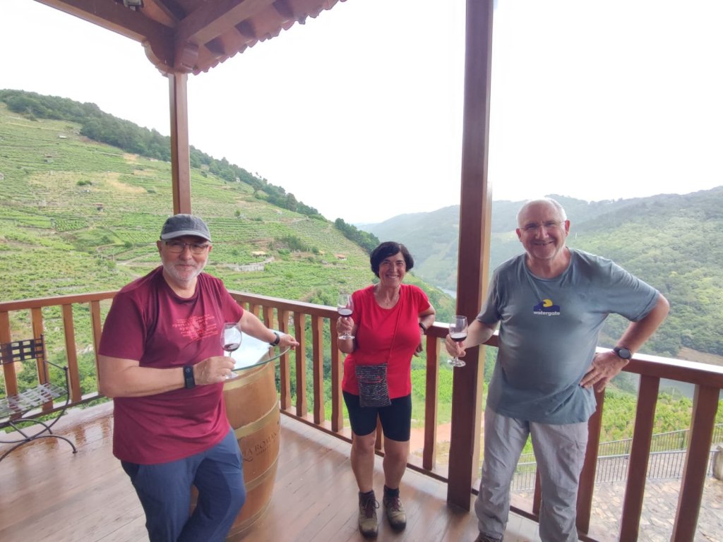 Reanudamos la marcha cruzando el puente sobre el Miño y nos encontramos, por primera vez con Elena Domínguez y Vicente Ibarra, que bajan corriendo por el camino de Chantada. Los reencontraremos subiendo de nuevo a Chantada y , finalmente, por las calles de Chantada poco después de nuestra llegada. Comenzamos la subida por otro tramo de Calzada romana que corta la actual carretera y deja a sus márgenes los viñedos que bajan desde la cima de la montaña. Antes de llegar al núcleo de A Ermida comienza a llover con fuerza y nos refugiamos en la Bodega Vía Romana. Al poco de estar bajo el porche de la bodega llega Luis y nos invita a pasar y a esperar a que amaine el temporal con un vinito de su bodega. Pasamos un buen rato y continuamos la marcha.